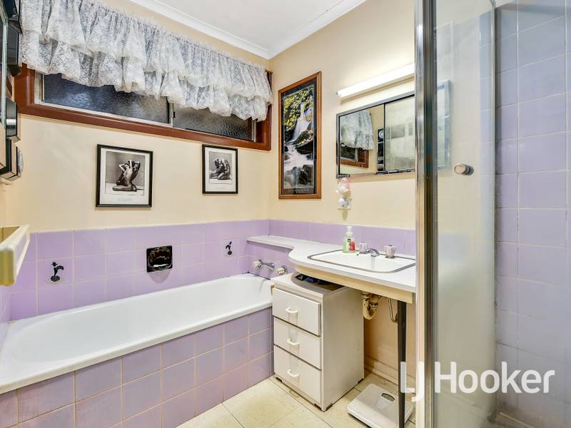 Three bedrooms are carpeted and enjoy built-in storage and full height windows that invite natural light and ventilation through. The home's main bathroom is also reminiscent of a previous era, with traditional appointments punctuated by a purple tile that is lined throughout. As with most rooms in the home, some TLC is likely needed, and the bathroom similarly offers a great opportunity to upgrade to your personal tastes.