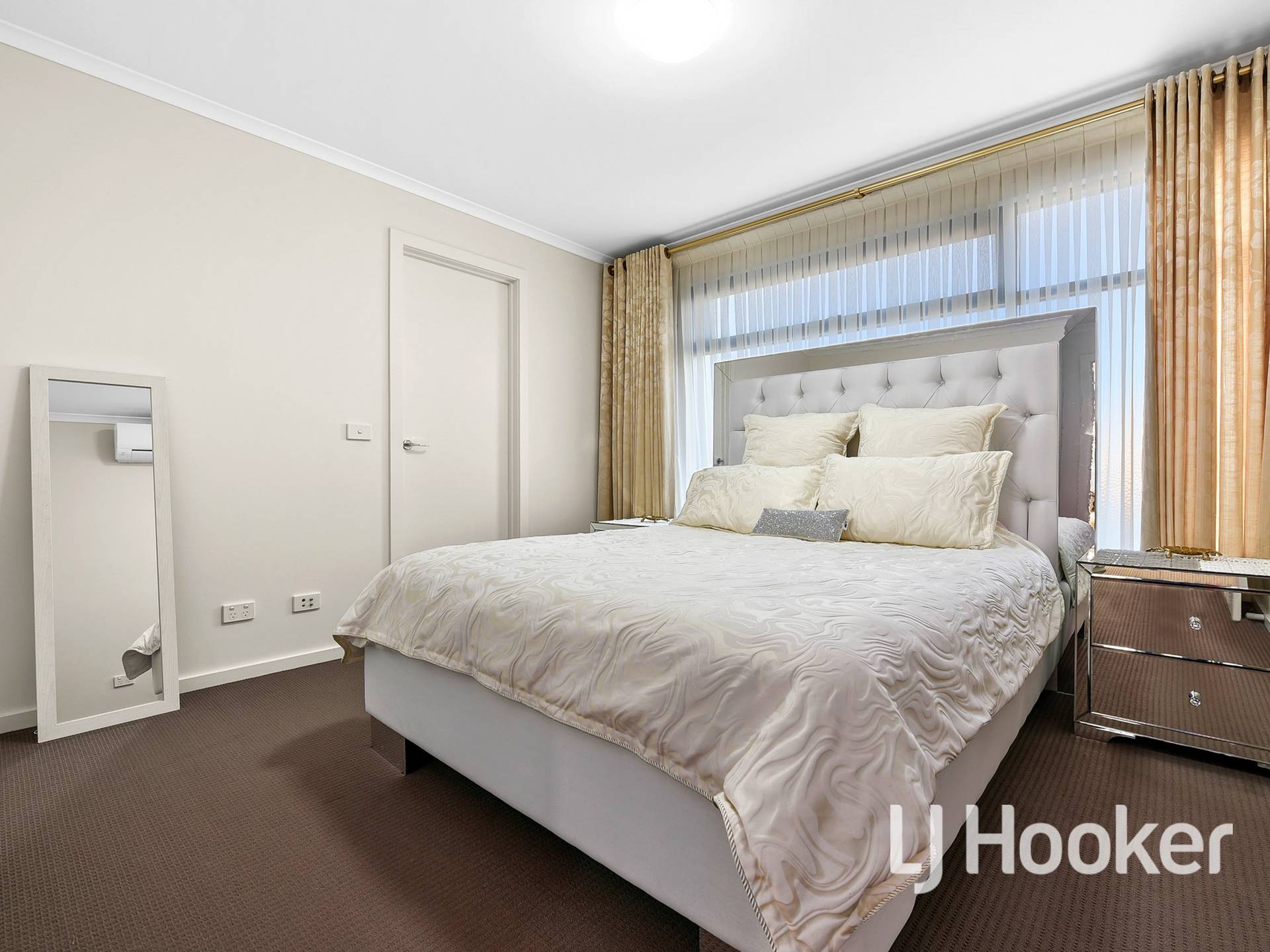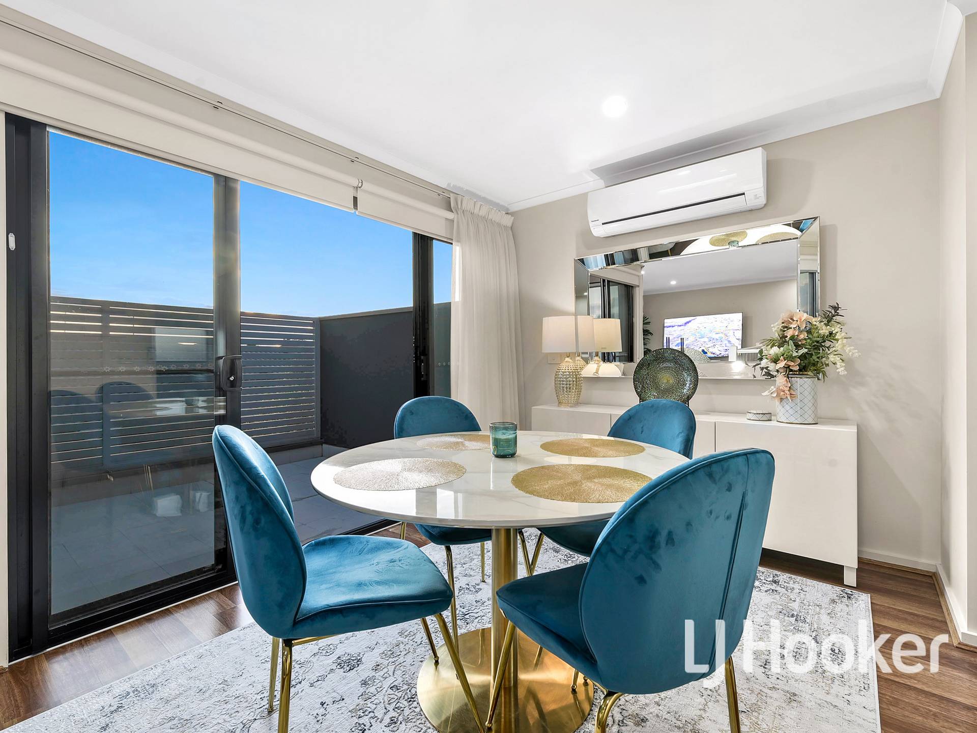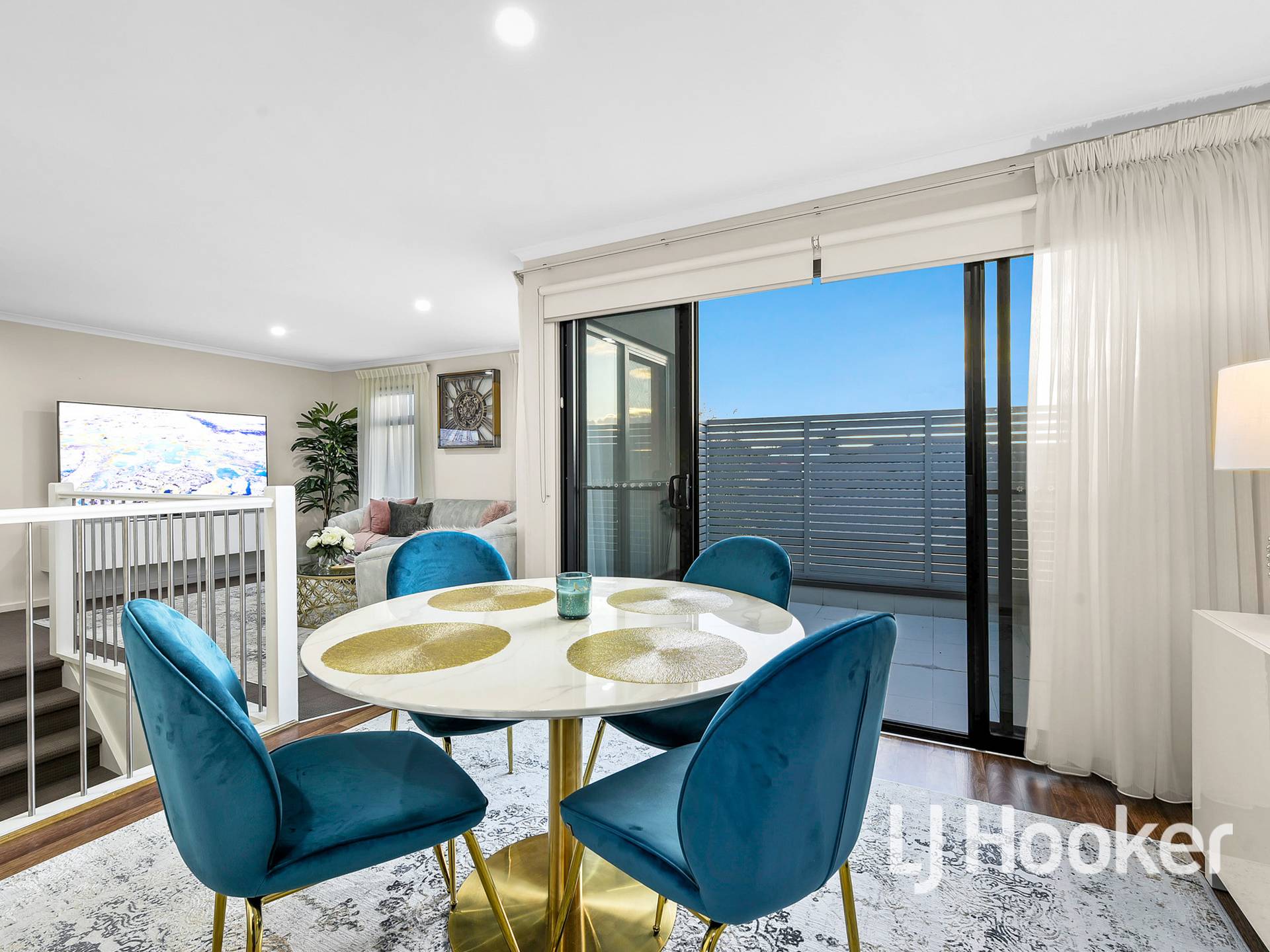 Showcasing a unique layout with a study, full bathroom, laundry, and second bedroom on the ground floor, the open-plan living and dining room splays out at the top of a wide, wrap-around carpeted staircase and extends further to a tiled balcony, perfect for morning coffee or evening meals under the stars. Crisp-painted walls, timber-look flooring, sheer and blockout curtains, LED downlights, and 4 split system AC units throughout ensure a consistently luxurious feel.