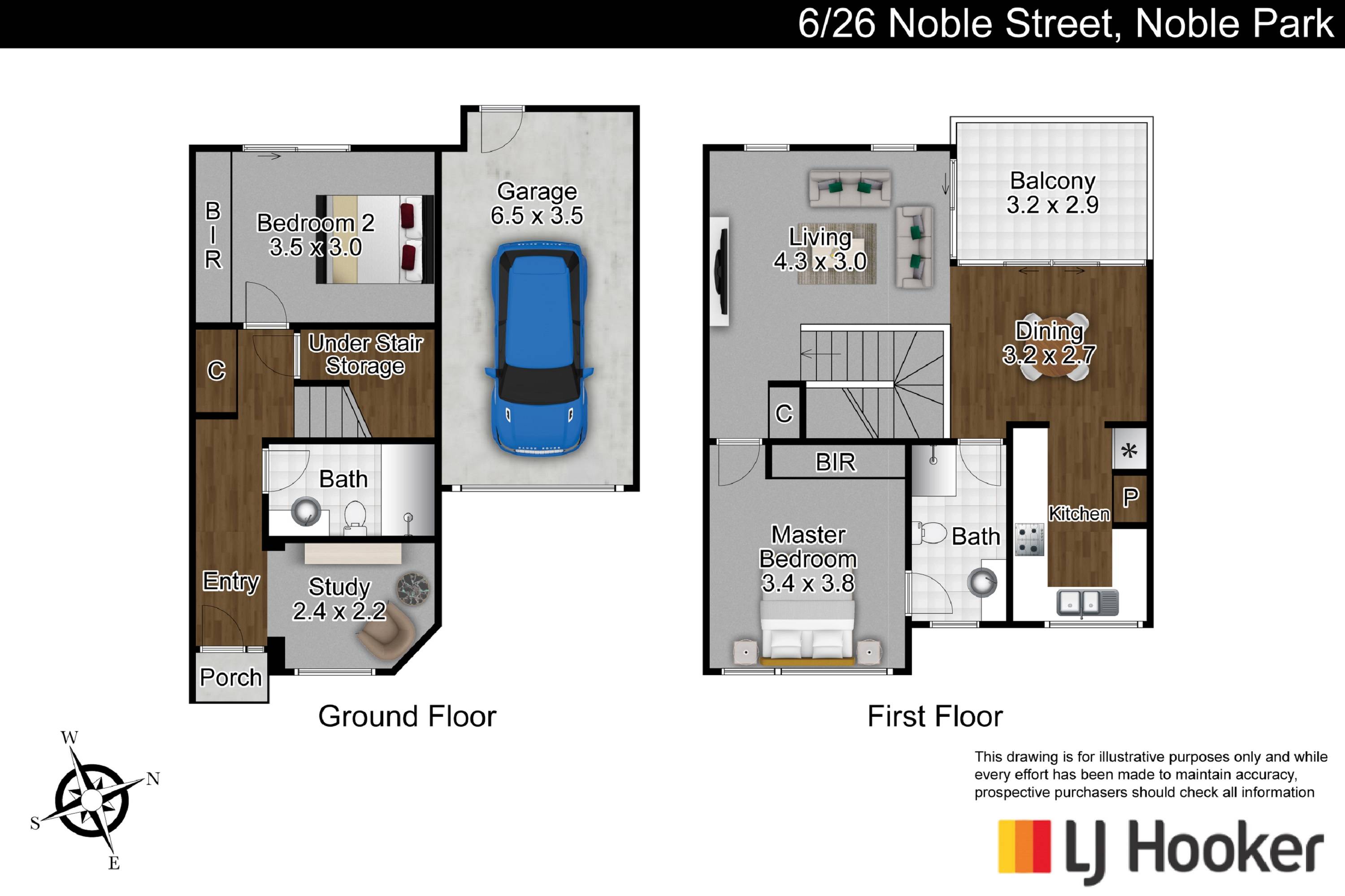 �Double-storey townhouse with two bedrooms, two bathrooms, balcony, and single lock-up garage