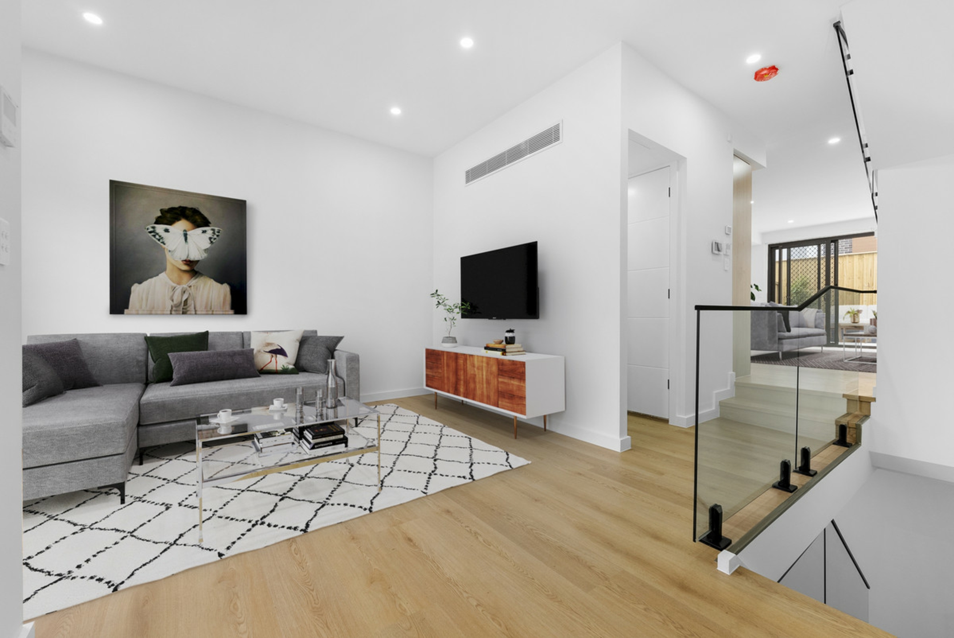 Step inside to discover high ceilings, timber flooring, and a thoughtfully designed dual-level layout that sets the stage for modern living. The heart of the home features an open-plan living and dining area, seamlessly connected to a sleek, designer kitchen appointed with soft-close cabinetry, stone benchtops, stainless steel appliances, and ample storage. Soft downlighting and an abundance of natural light create an inviting and relaxed ambiance throughout.