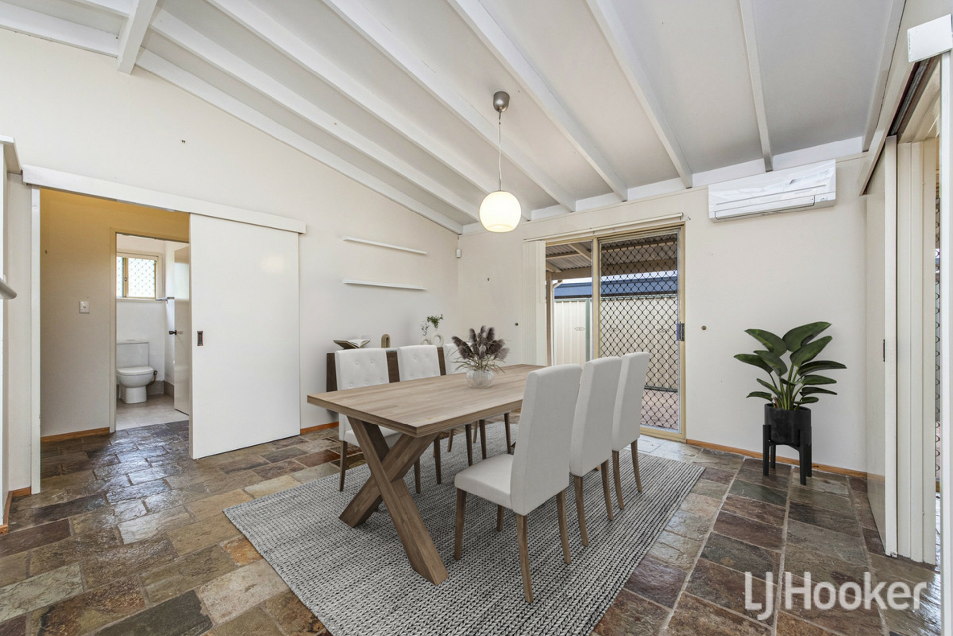 Additional features include a dining area with split system air conditioning, a spacious laundry with walk-in linen cupboard, and evaporative ducted air conditioning throughout.