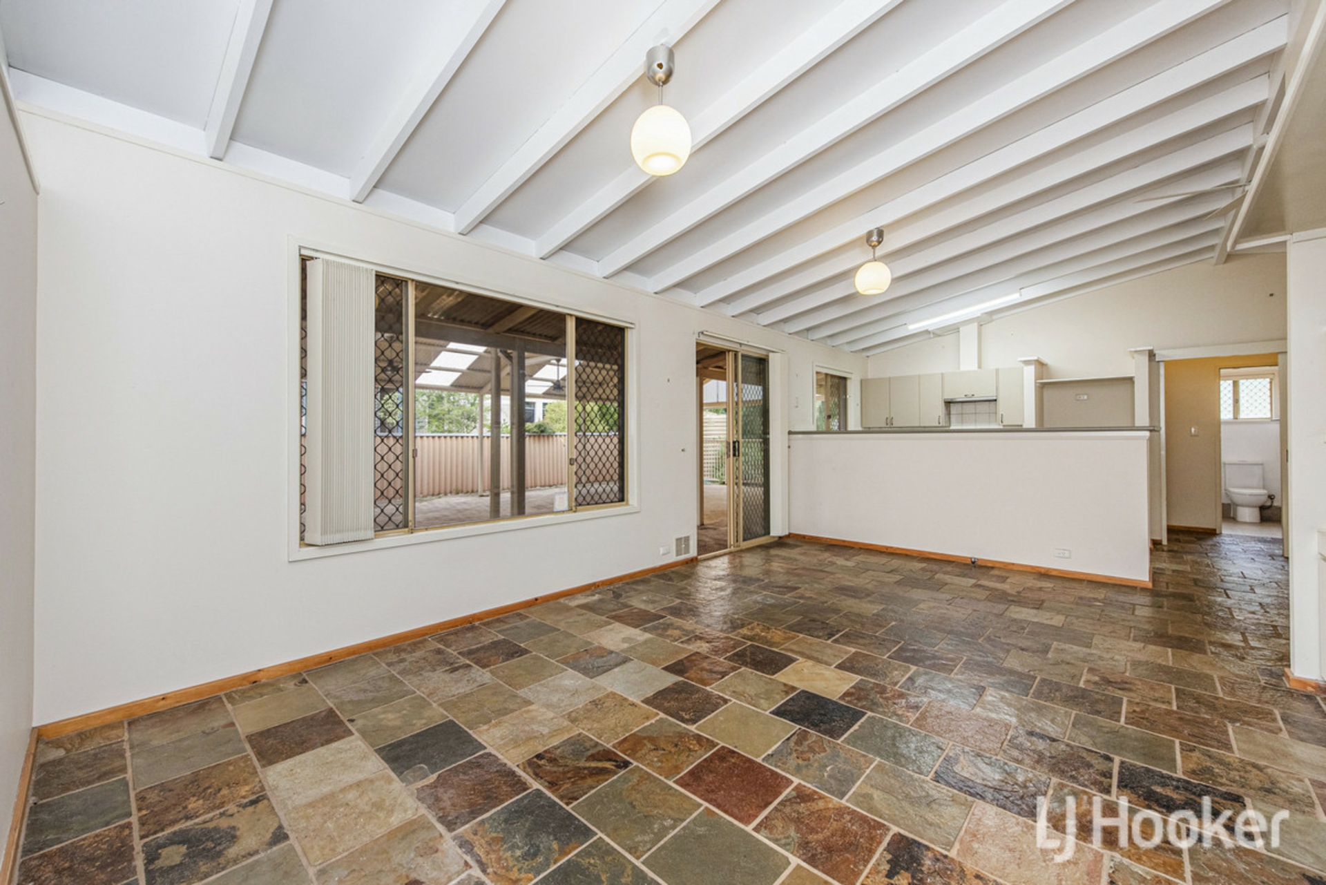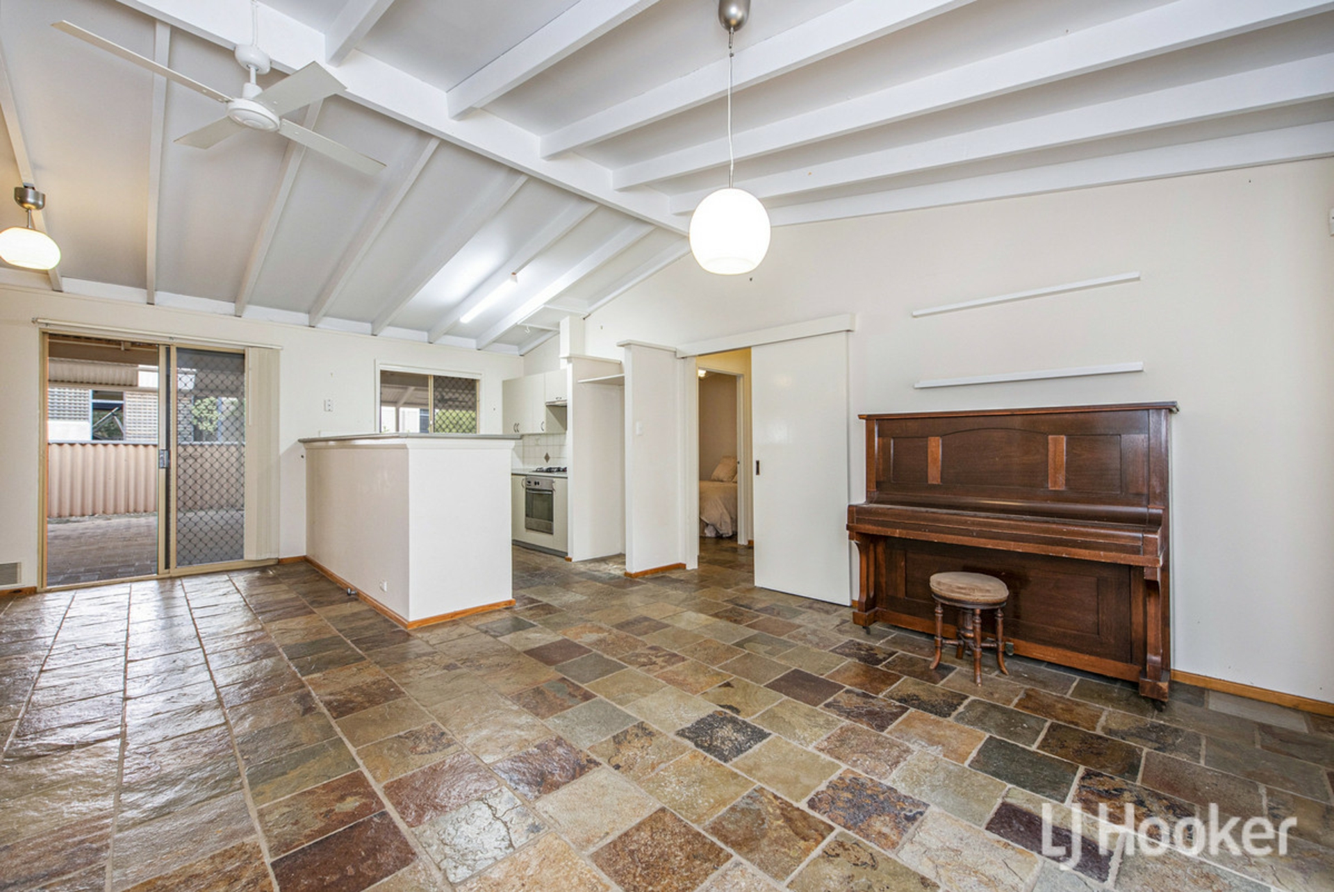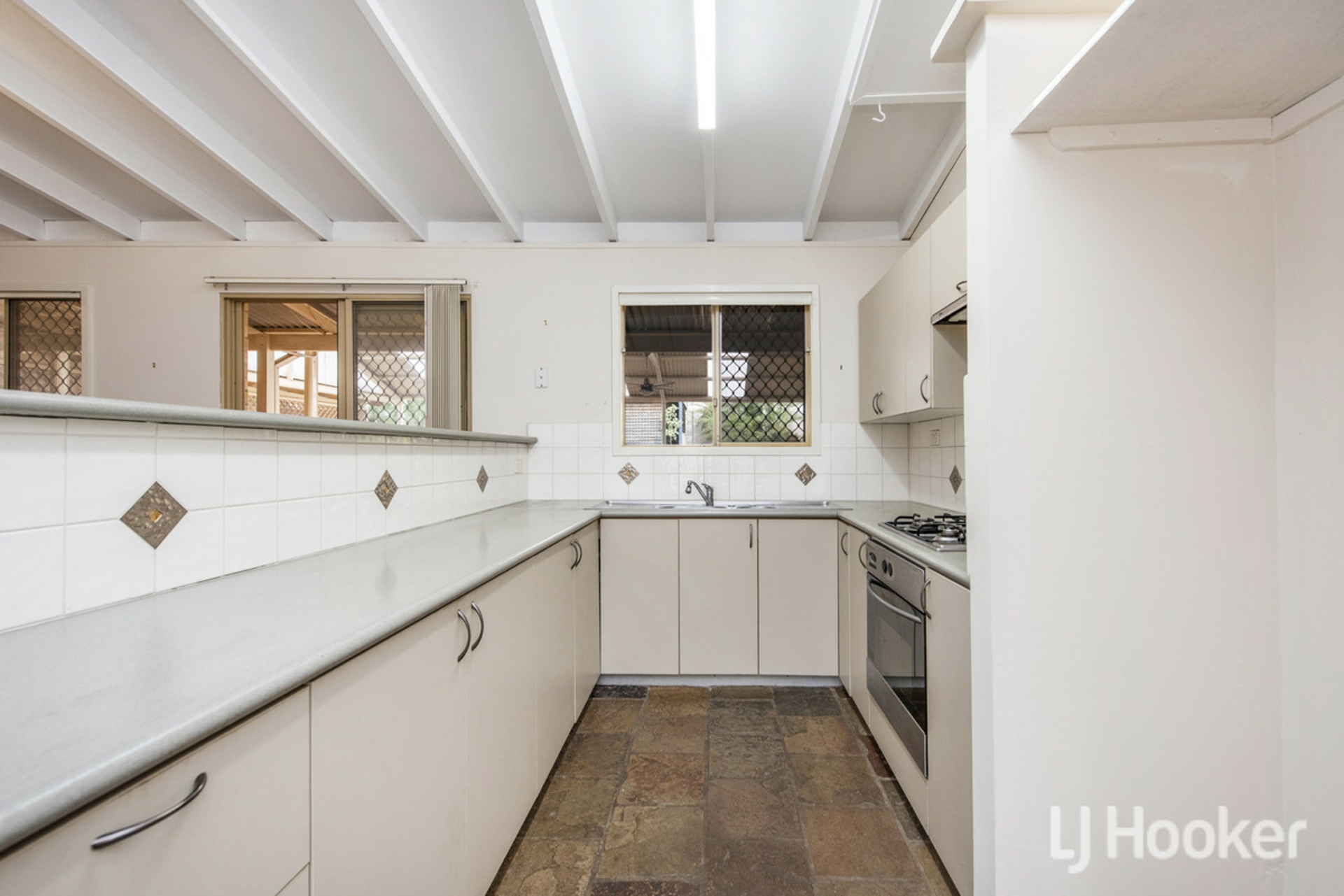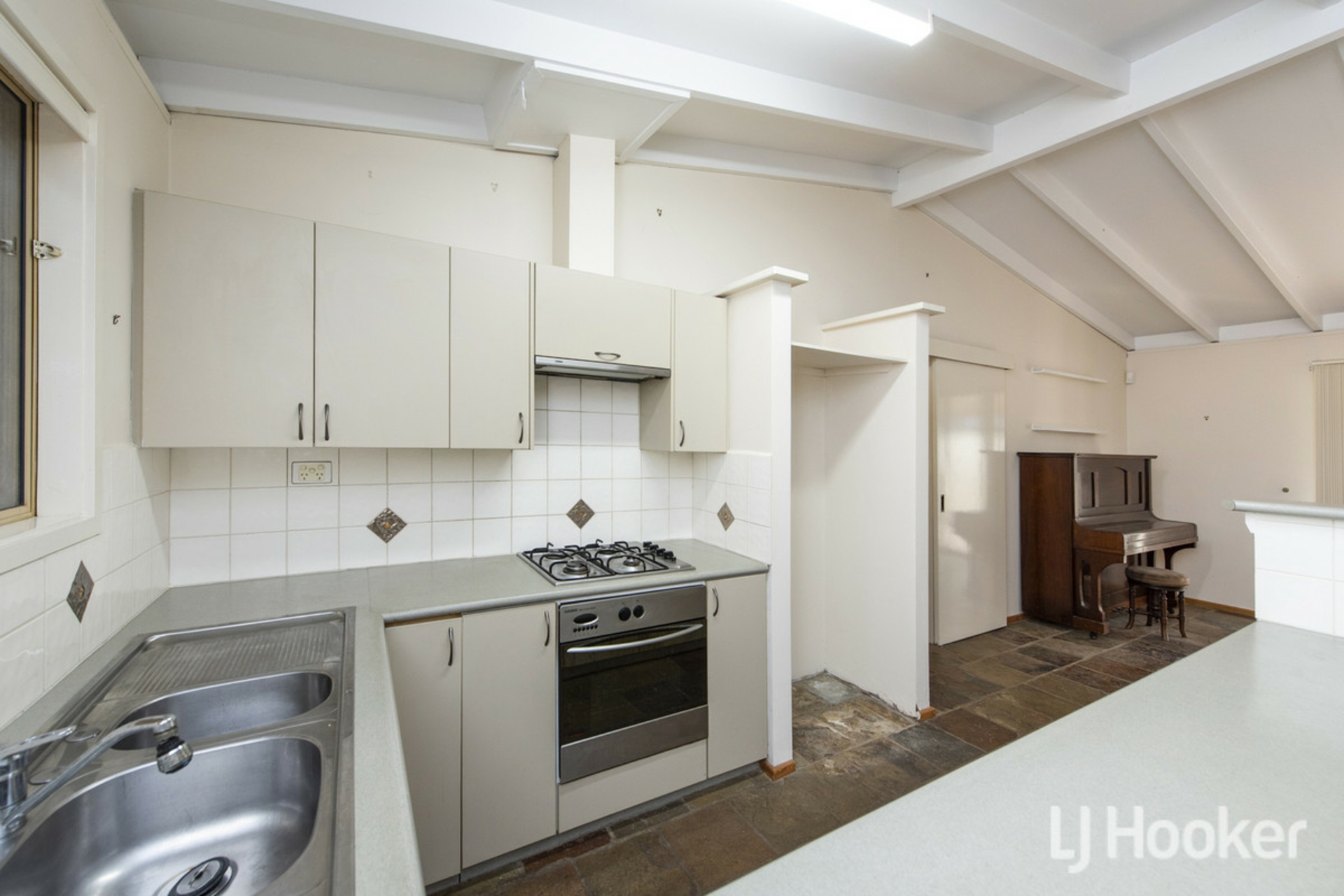 Inside, the home features a light-filled open plan living area with vaulted ceilings, creating a real sense of space and warmth. The kitchen is well-equipped with a 4-burner gas stove, electric oven, rangehood, twin sink, and ceiling fan-perfect for everyday living and entertaining.