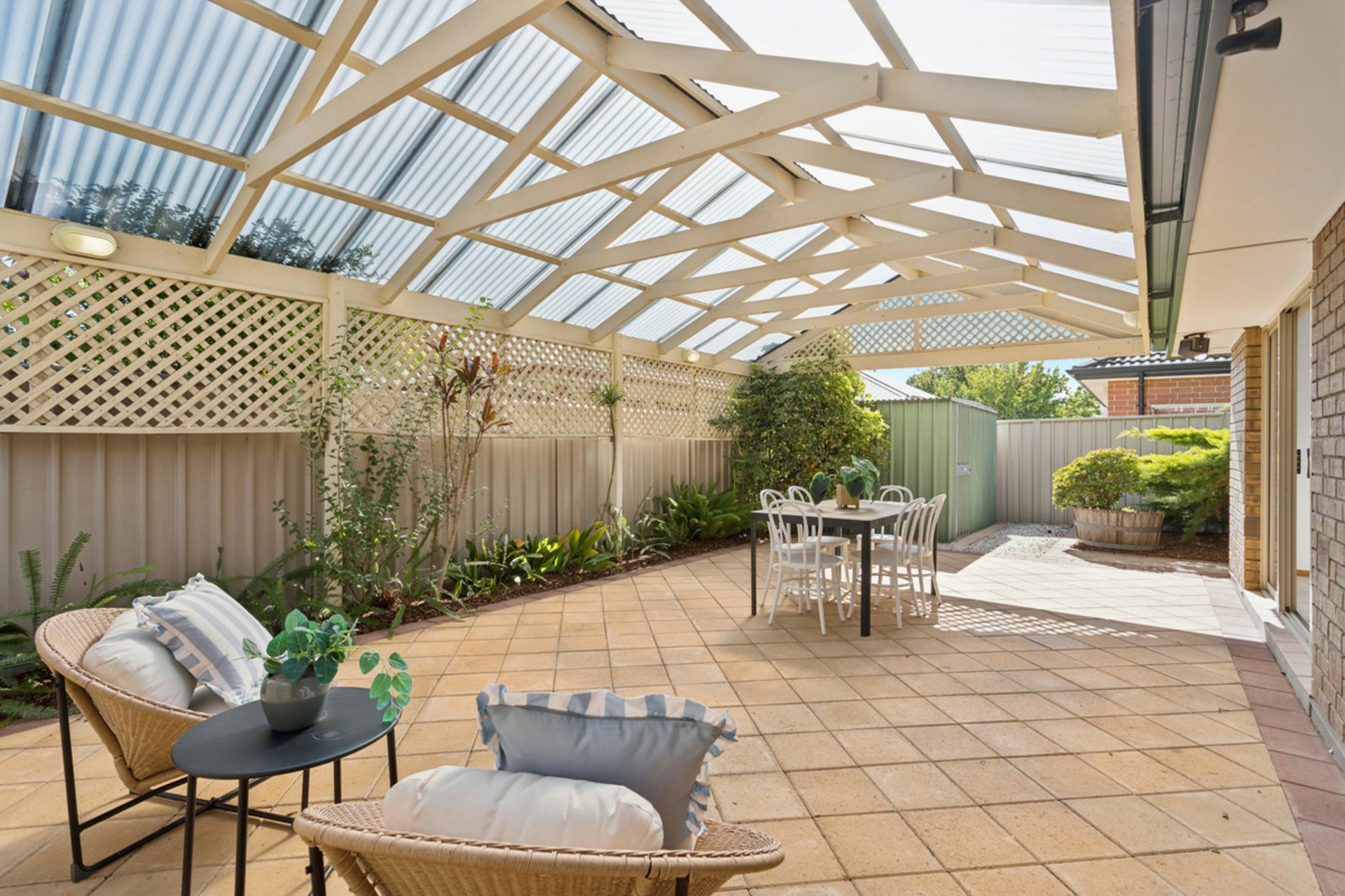 Outdoors, the lifestyle continues with a covered entertaining area under a pitched pergola - perfect for long lunches, barbecues or simply unwinding at the end of the day. The low-maintenance yard means more time to relax and less time on upkeep, while a garden shed adds extra practicality.