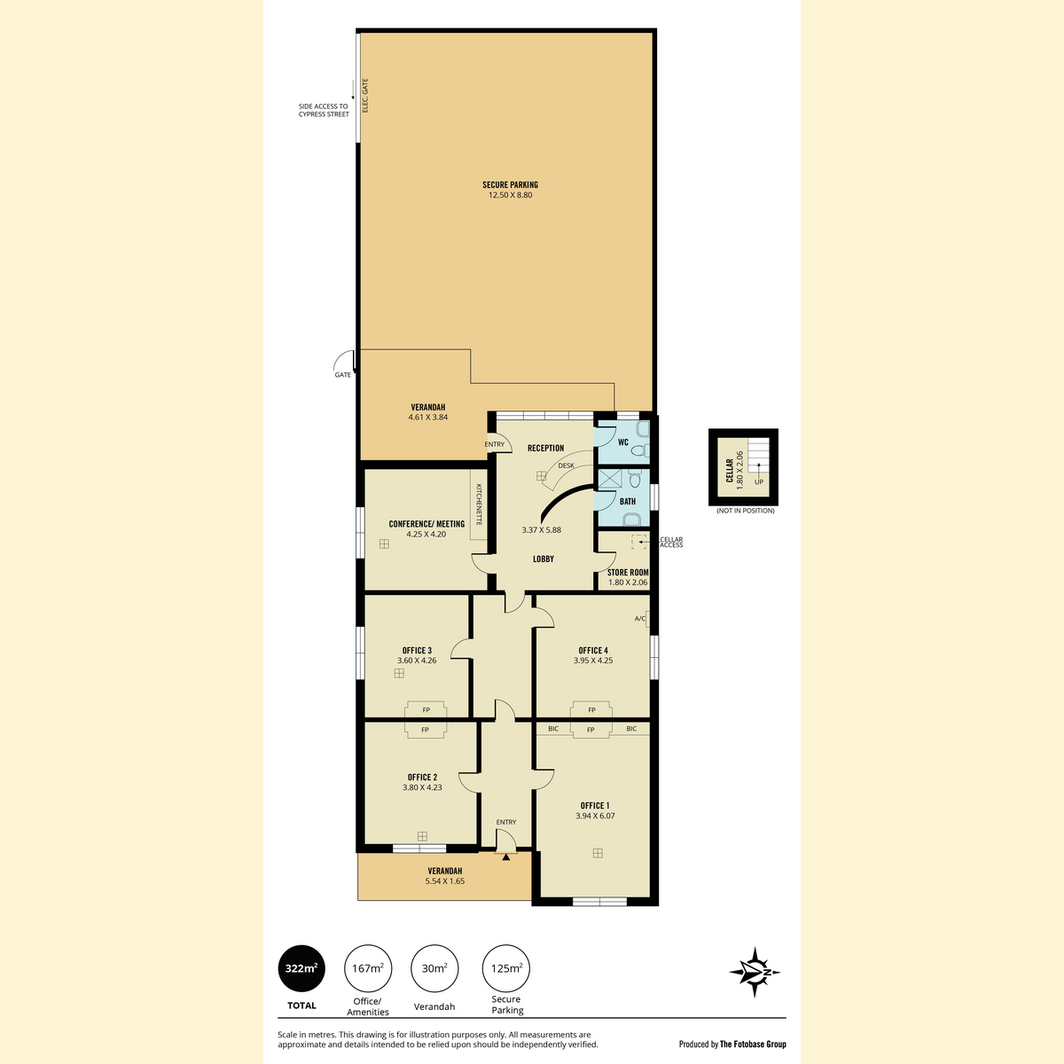 The flexible floorplan comprises four consulting rooms, a meeting or conference room, welcoming reception with lobby, and bathroom facilities with two toilets. Secure off-street parking is accessed via Cypress Street with direct entry to reception. Vacant possession ensures immediate occupation or leasing.