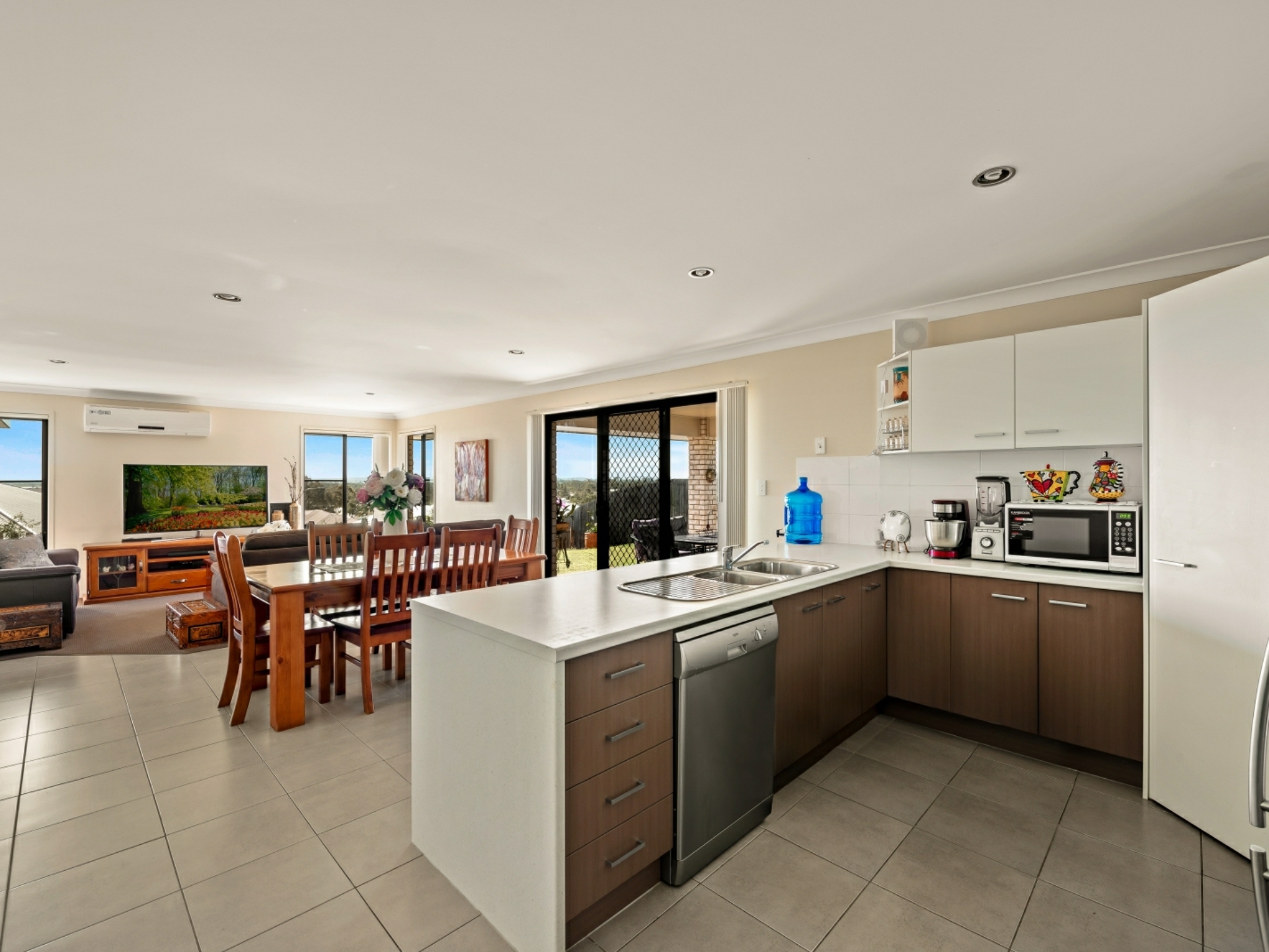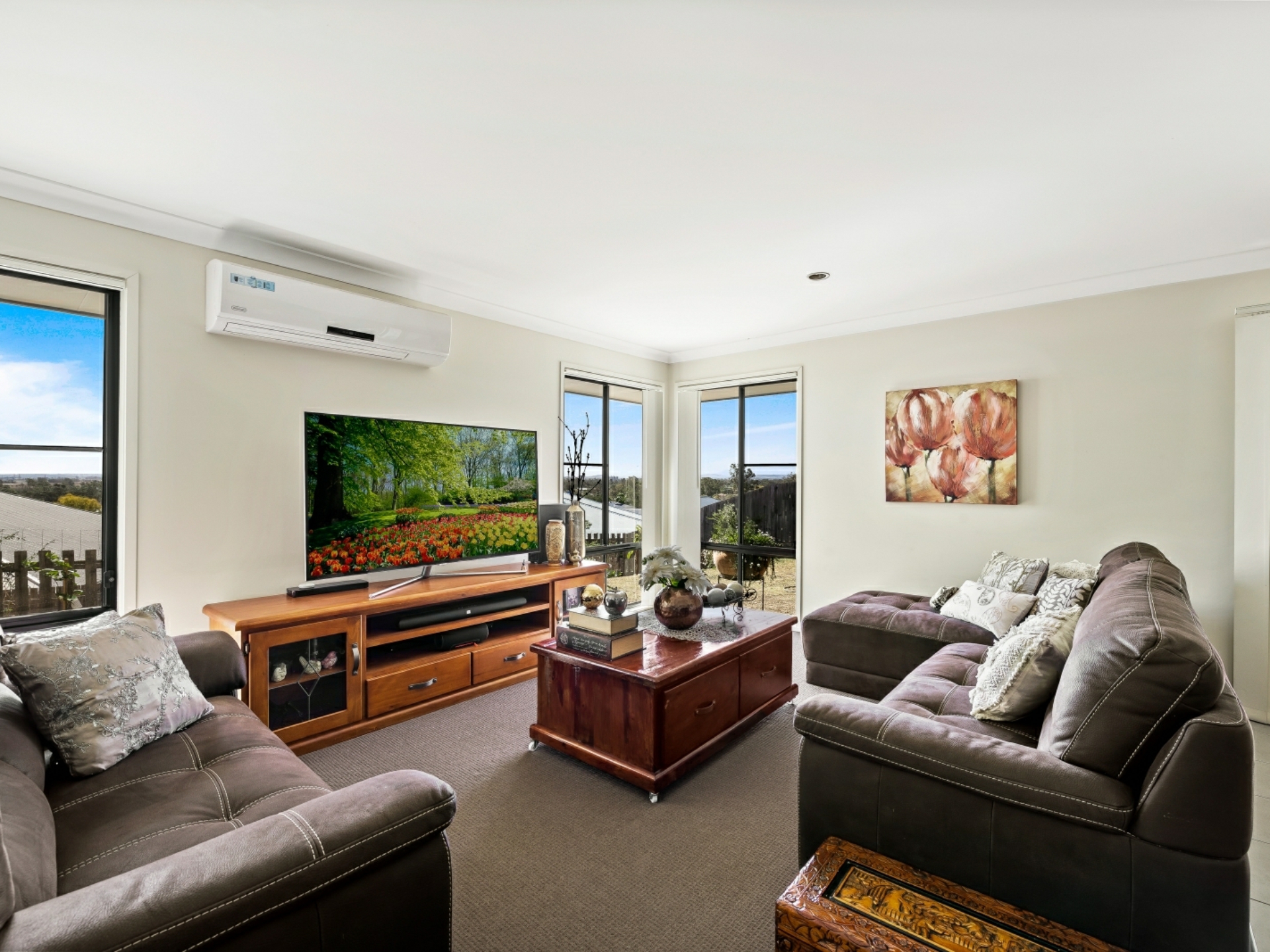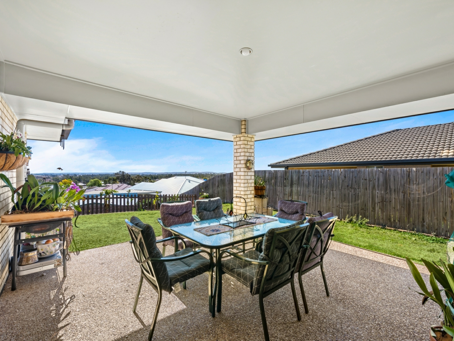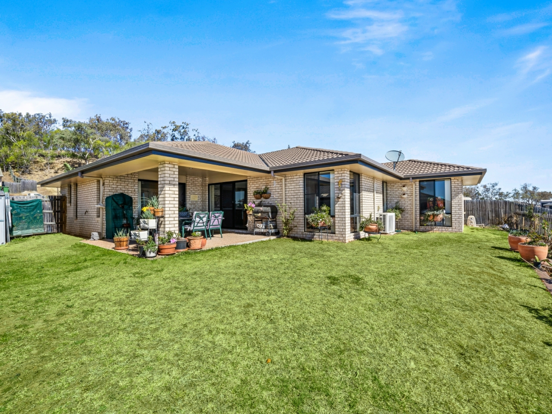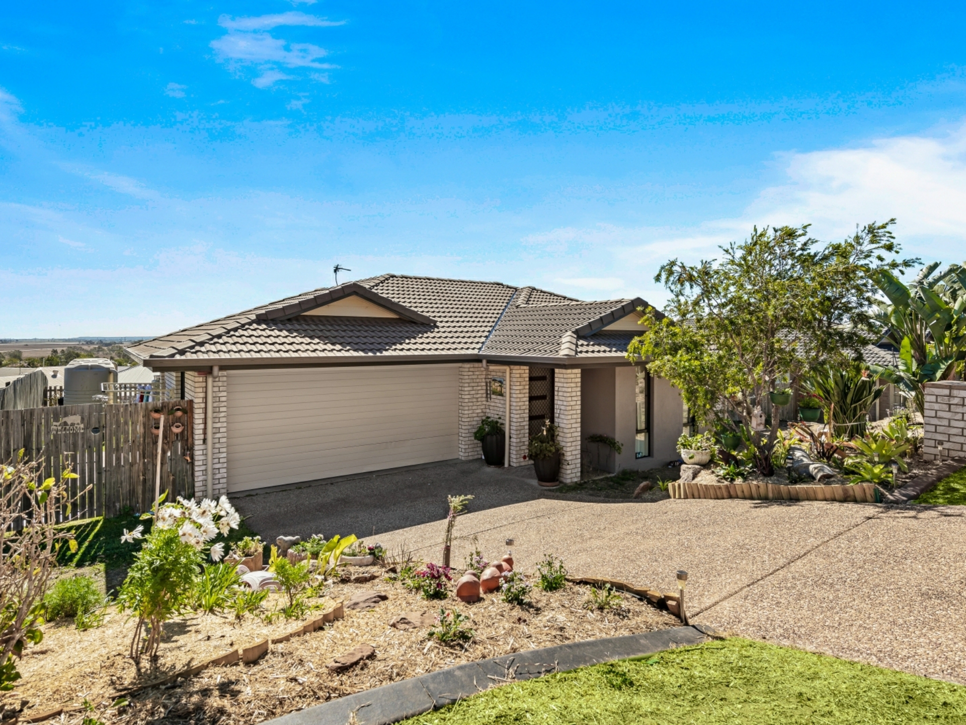 This comfortable, low maintenance home is enhanced by a functional floor plan, light airy spaces and a neutral colour palette. To the right of the security front door is the generous master suite, with pristine ensuite and walk- in robe. Double glass, sliding doors open out onto the covered, north-east facing living area, offering an abundance of light and views past the town. The open plan living area has the same easy flow access to the alfresco living space. The sleek, spacious kitchen is a joy, with breakfast bar, stainless steel appliances and ample room to create culinary delights. The easy to keep clean, tiled area extends from the entry, past bedroom 2 (which could be used as a study), down towards the airconditioned living area, where sumptuous carpet creates a homely feel. All bedrooms are also carpeted, have ceiling fans and built-in robes. On the western side of the double garage are 2 decent sized water tanks, providing enough water to preserve the lawn and appealing play spaces.