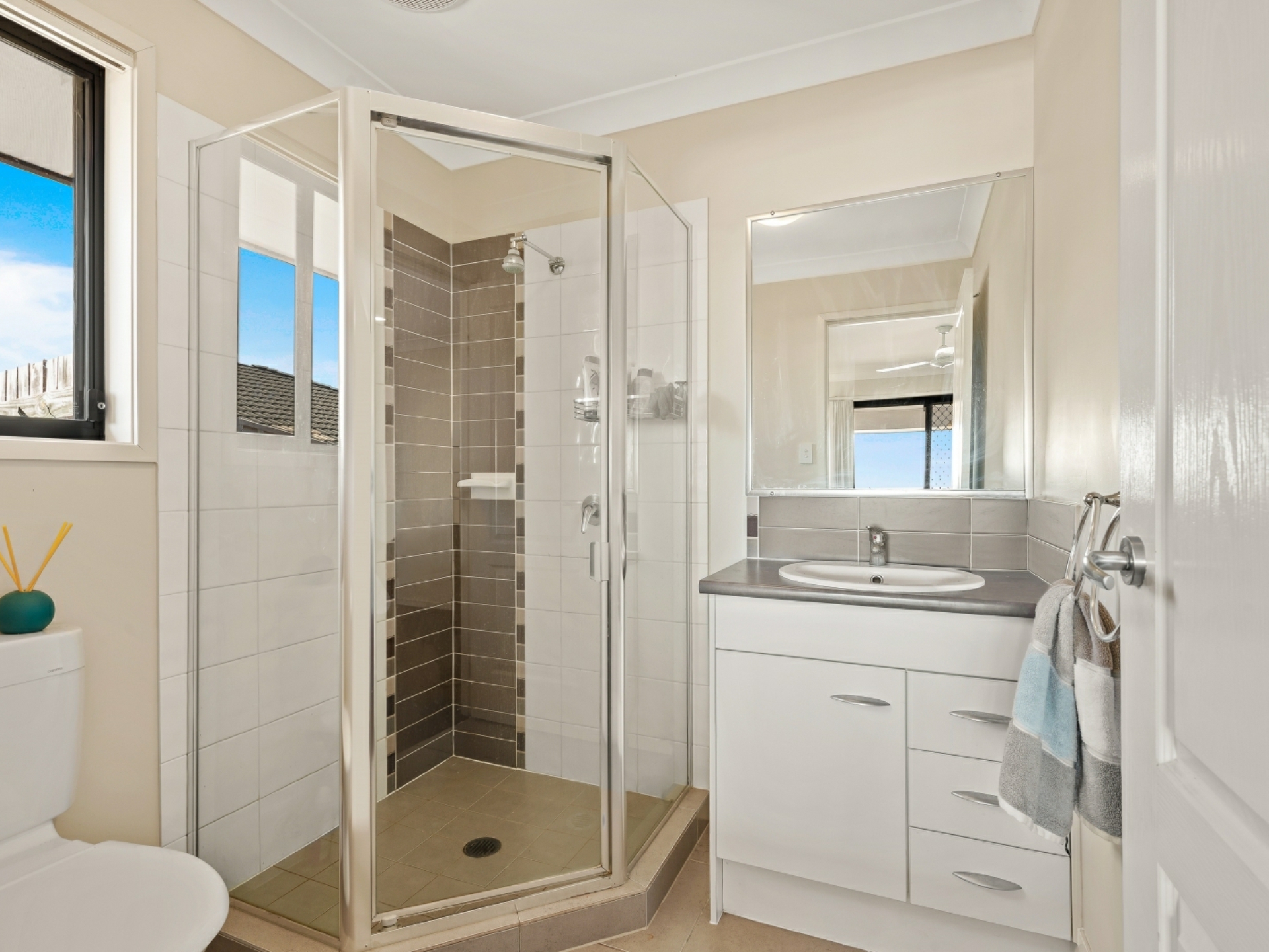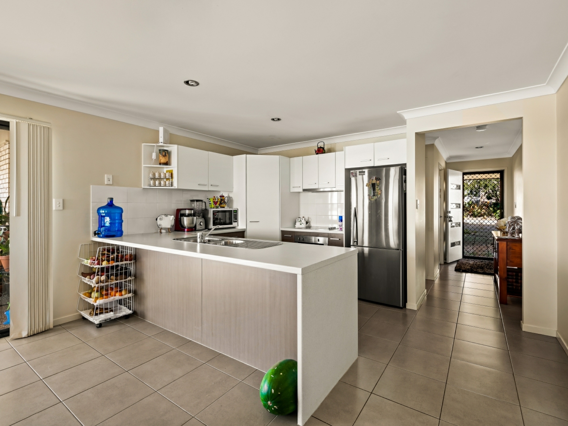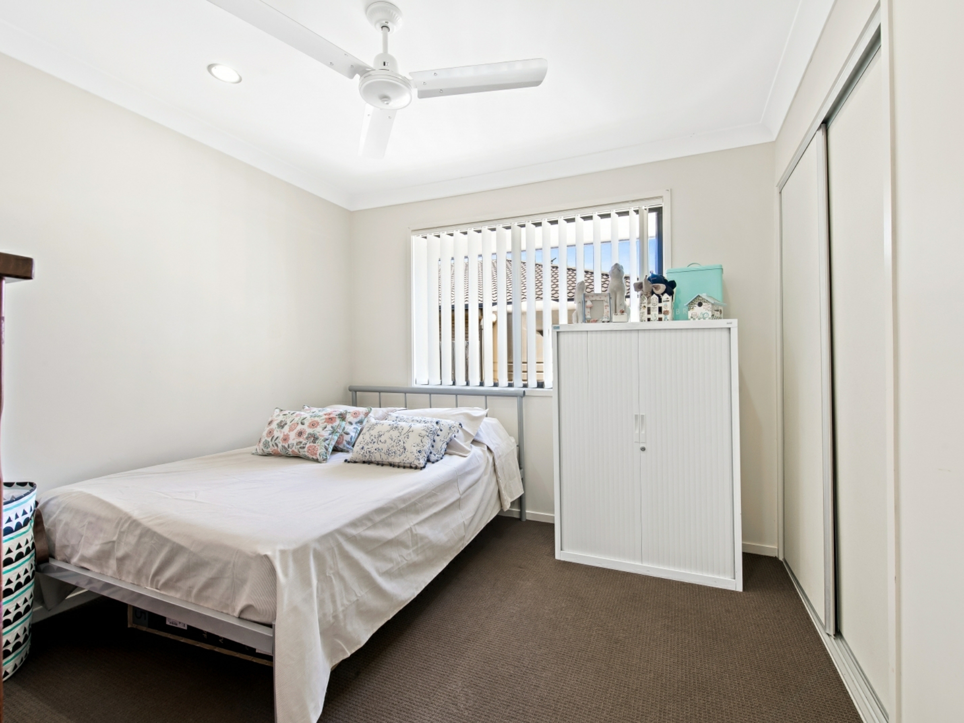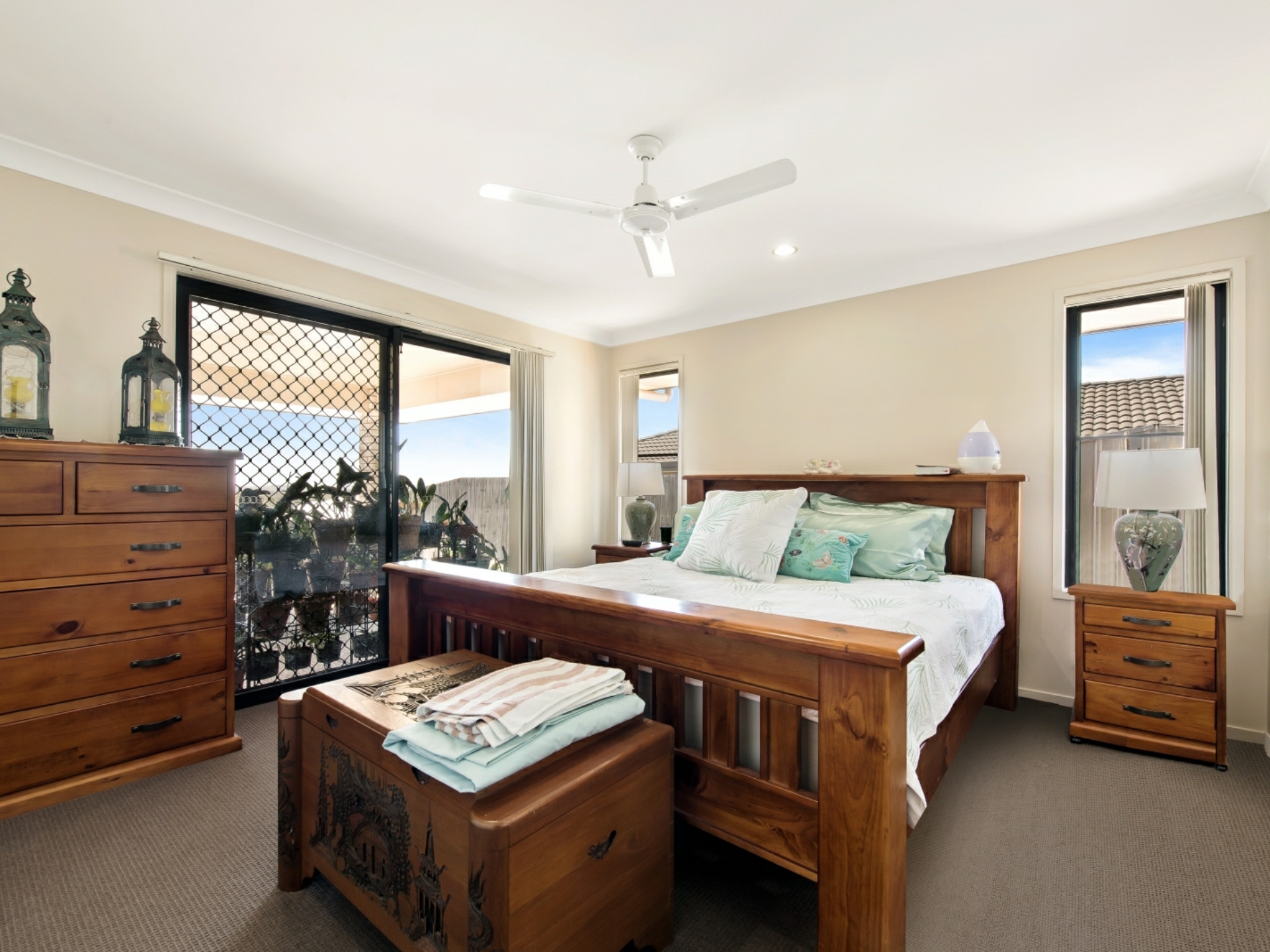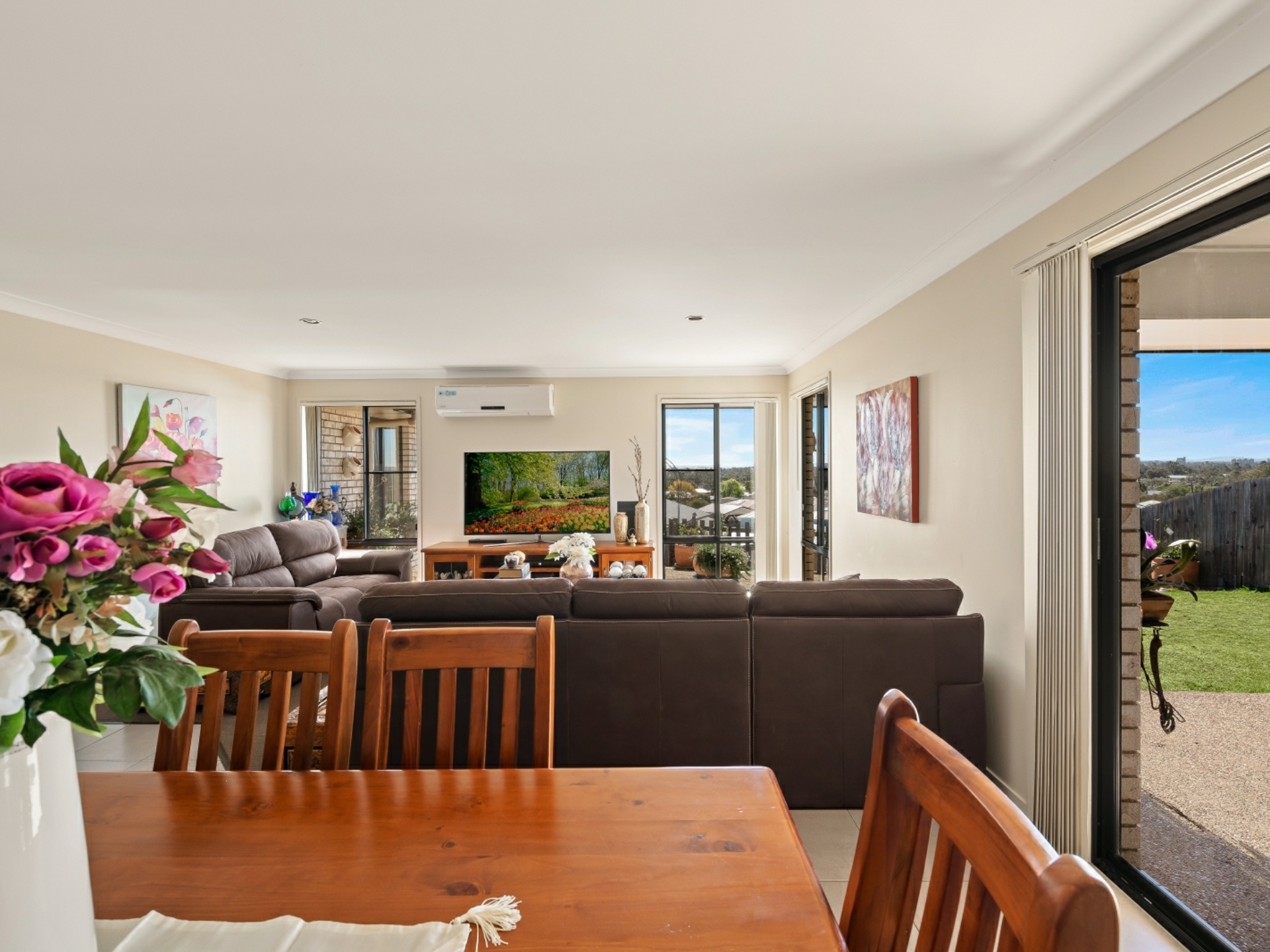 This comfortable, low maintenance home is enhanced by a functional floor plan, light airy spaces and a neutral colour palette. To the right of the security front door is the generous master suite, with pristine ensuite and walk- in robe. Double glass, sliding doors open out onto the covered, north-east facing living area, offering an abundance of light and views past the town. The open plan living area has the same easy flow access to the alfresco living space. The sleek, spacious kitchen is a joy, with breakfast bar, stainless steel appliances and ample room to create culinary delights. The easy to keep clean, tiled area extends from the entry, past bedroom 2 (which could be used as a study), down towards the airconditioned living area, where sumptuous carpet creates a homely feel. All bedrooms are also carpeted, have ceiling fans and built-in robes. On the western side of the double garage are 2 decent sized water tanks, providing enough water to preserve the lawn and appealing play spaces.
