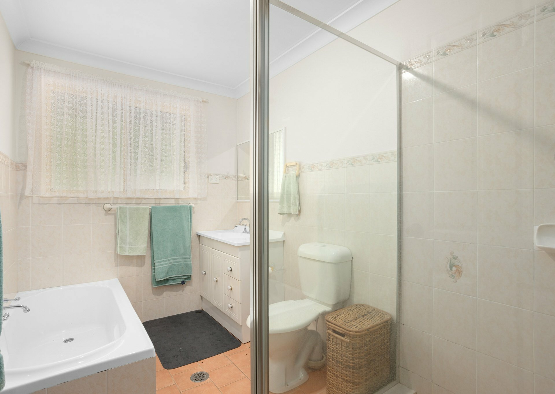 - Tidy bathroom with shower, toilet, vanity and bath
