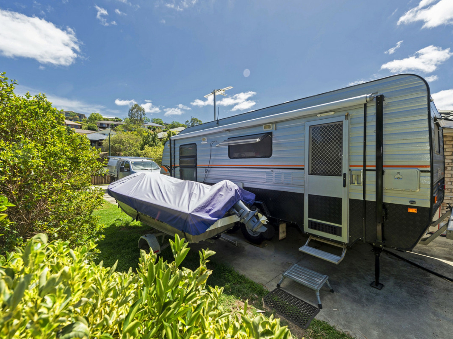 -Easy side access with concrete pad and secure gates for caravan/boat etc