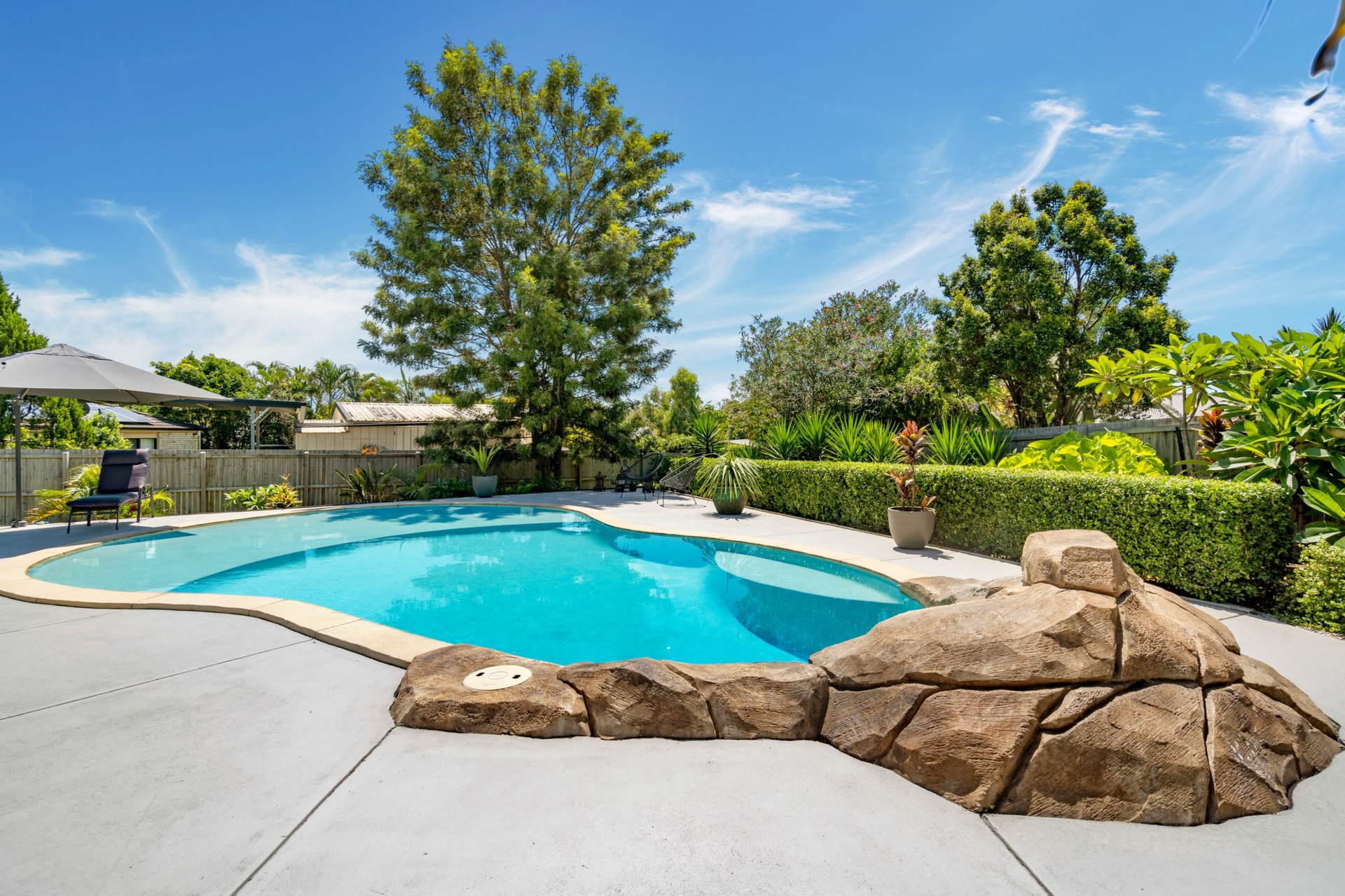 -Huge in-ground swimming pool with tremendous poolside lounging space and umbrella