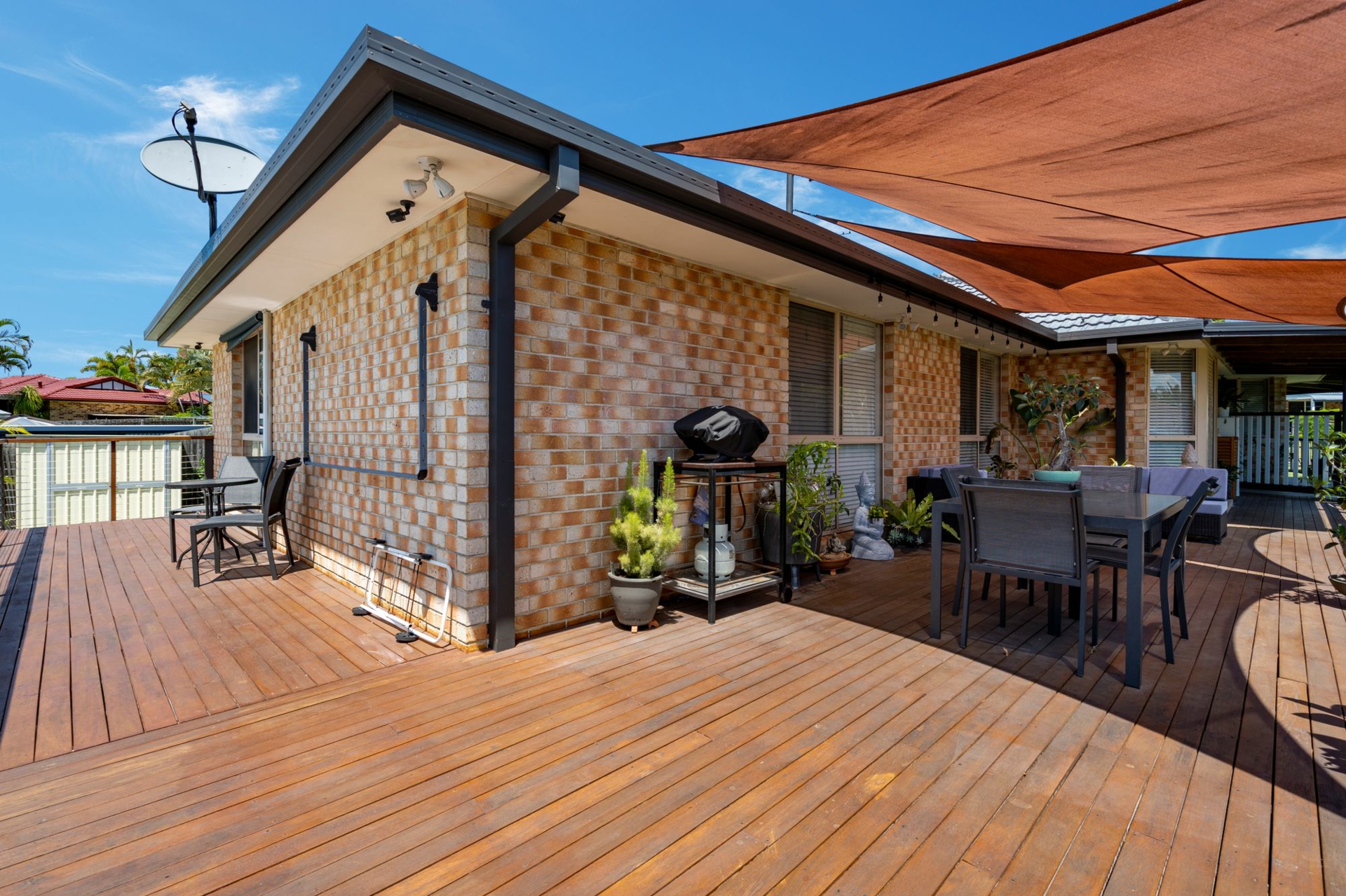 -Rear entertainer's deck with open-air and shade sail zones