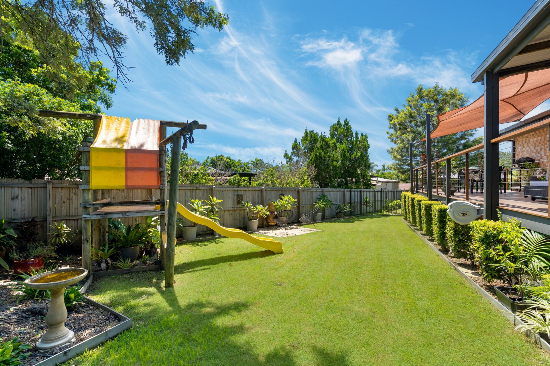 -Large fenced backyard with children's cubby house and mature greenery
