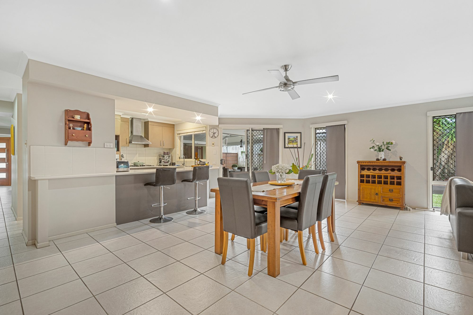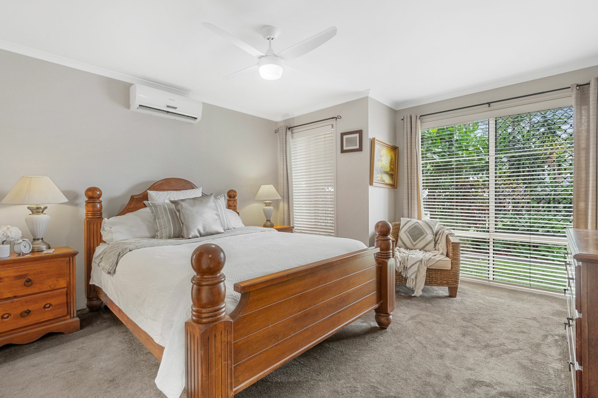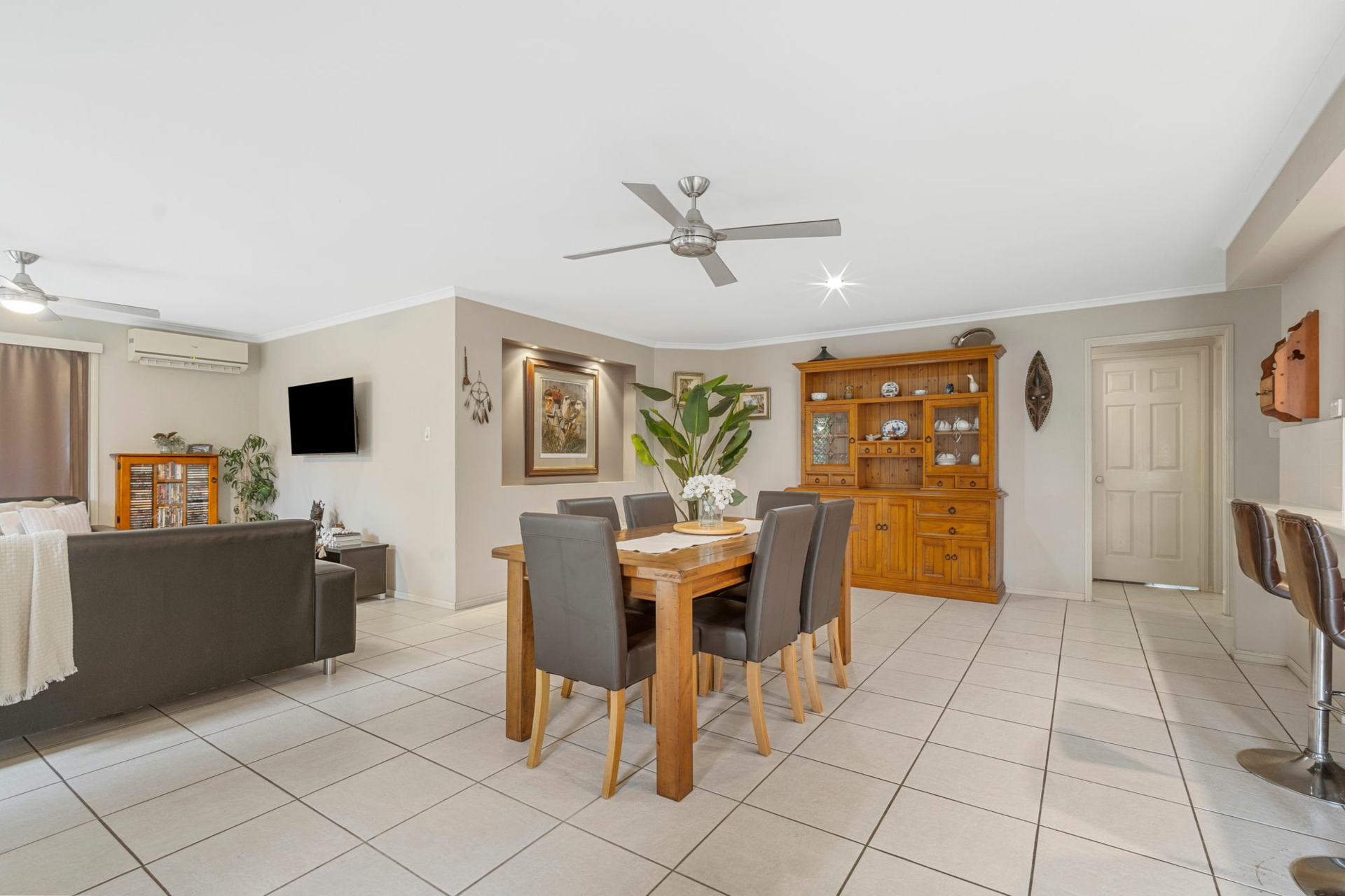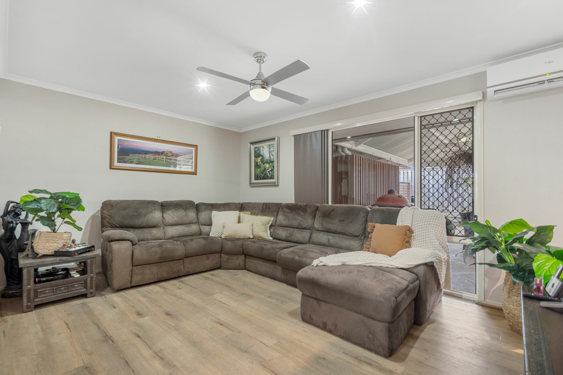 Accommodation includes four spacious bedrooms with built-in robes, plus a separate study or home office. Comfort is assured year-round with 7 split-system air conditioning units, ceiling fans throughout and security screens for peace of mind.