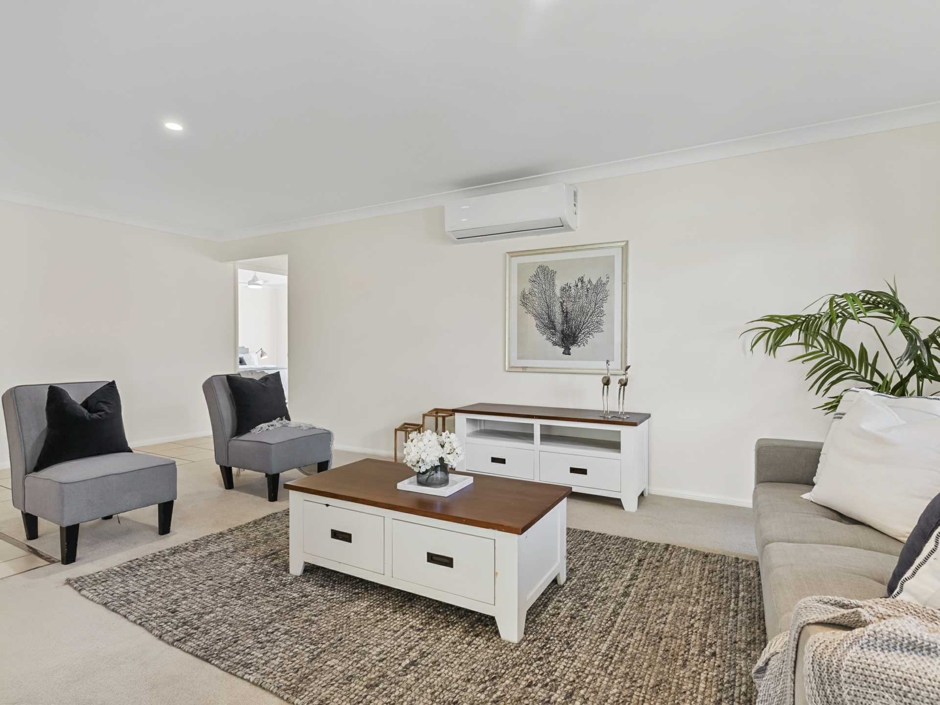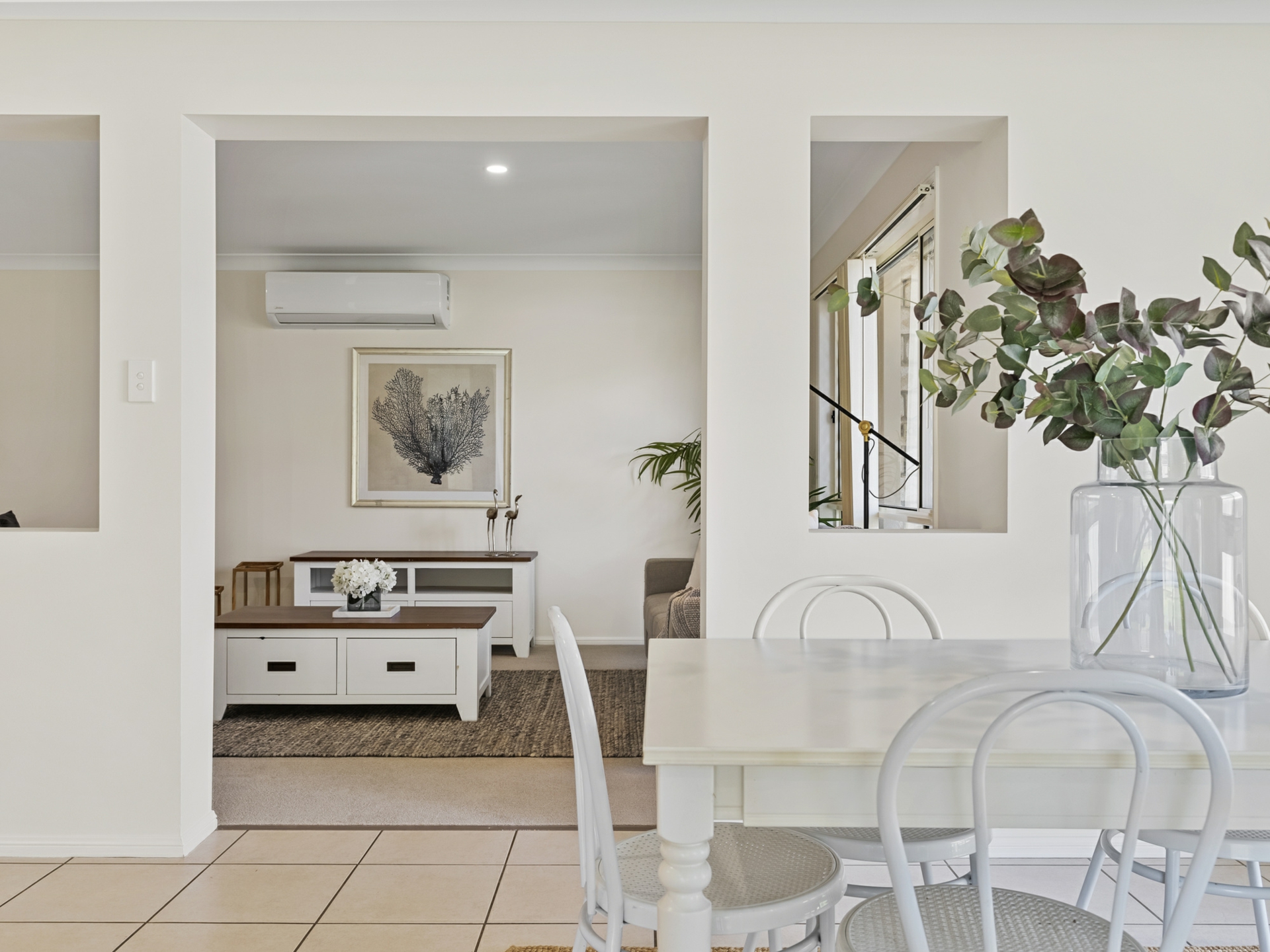At the heart of the home, the open-plan kitchen, dining, and living area creates a central hub for both relaxation and entertaining. The kitchen is well-appointed with ample bench space, a large pantry, quality appliances including a dishwasher, and excellent storage, all overlooking the main living zone. Filled with natural light, this space flows seamlessly out to the covered outdoor patio, creating a strong indoor-outdoor connection perfect for year-round living.