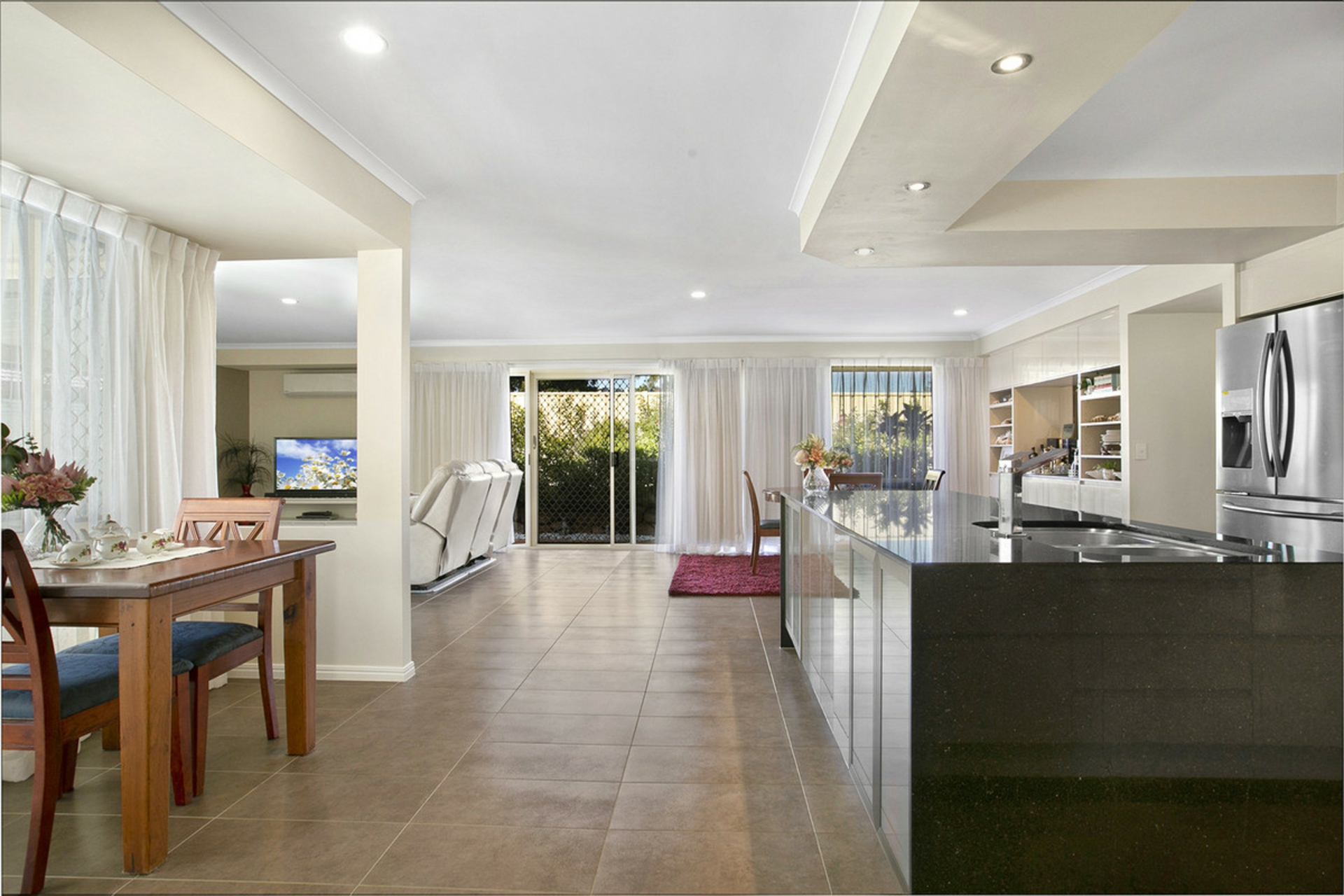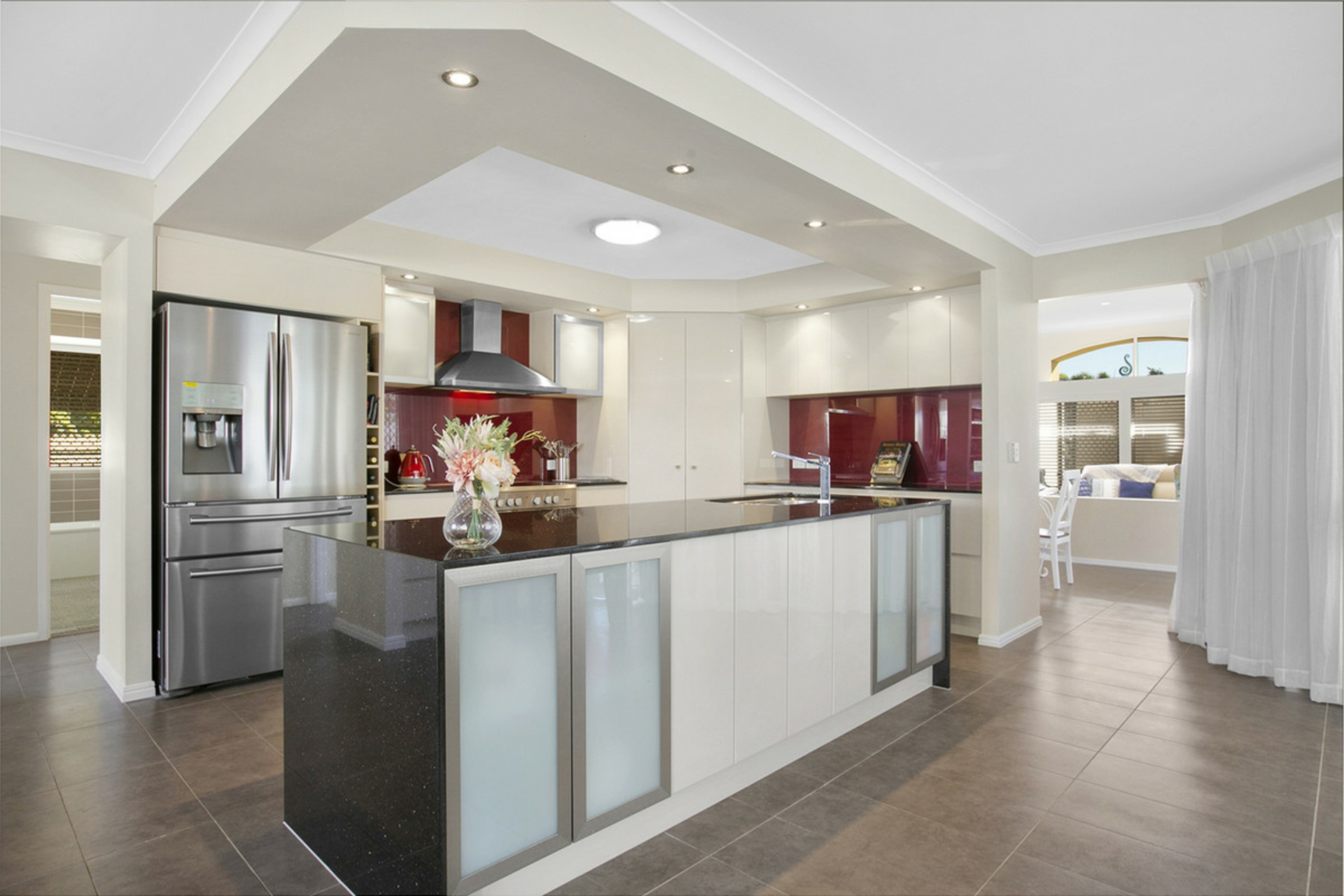 • Luxurious open plan kitchen with modern appliances, granite waterfall edge benchtops, walk-in pantry and loads of storage