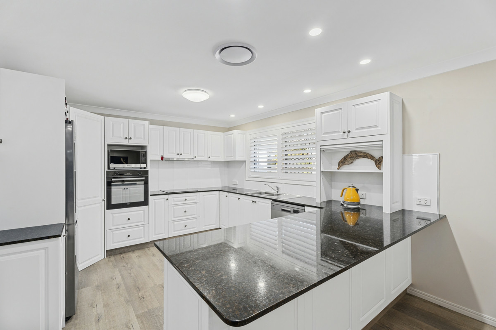 • Spacious chef kitchen featuring stone benches, an abundance of cupboard space, dishwasher, electric cooktop, coffee nook / appliance cabinet and breakfast area