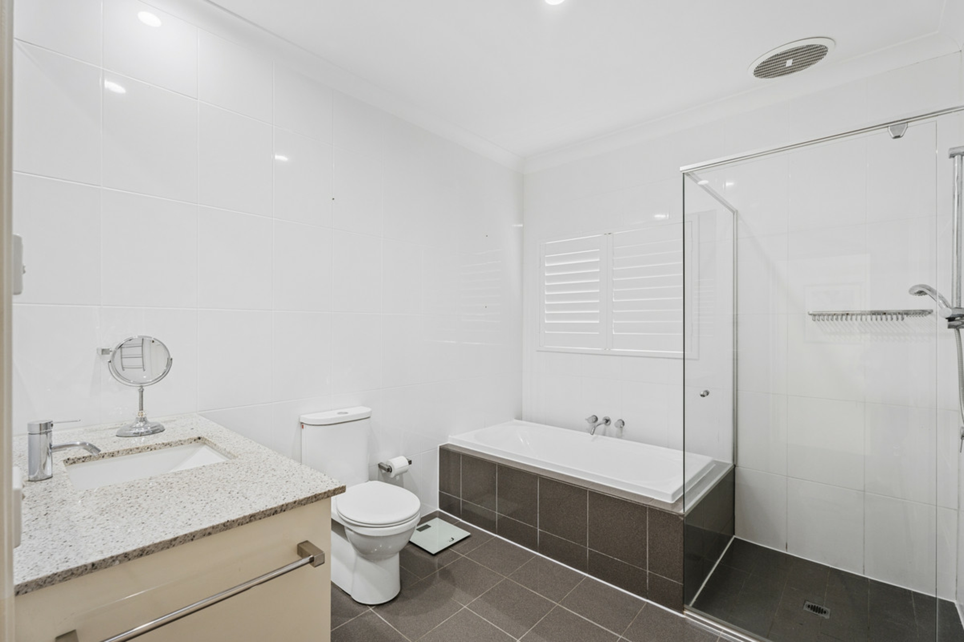 • Main bathroom servicing three bedrooms and featuring a stone top vanity, shower, bathtub and floor to ceiling tiles