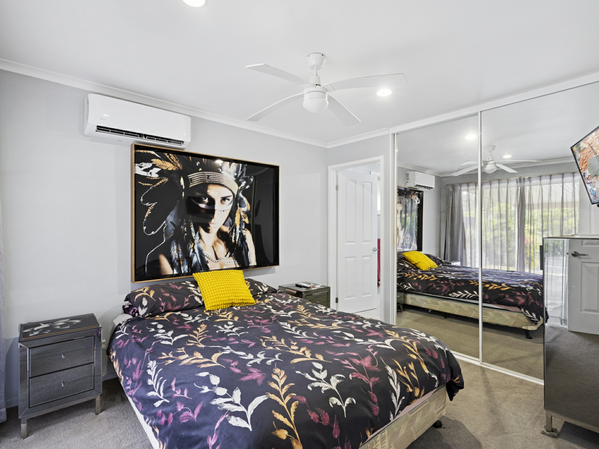 - Master bedroom with split system AC and ceiling fan, glass sliding door to front patio, mirrored built-in wardrobe and en-suite