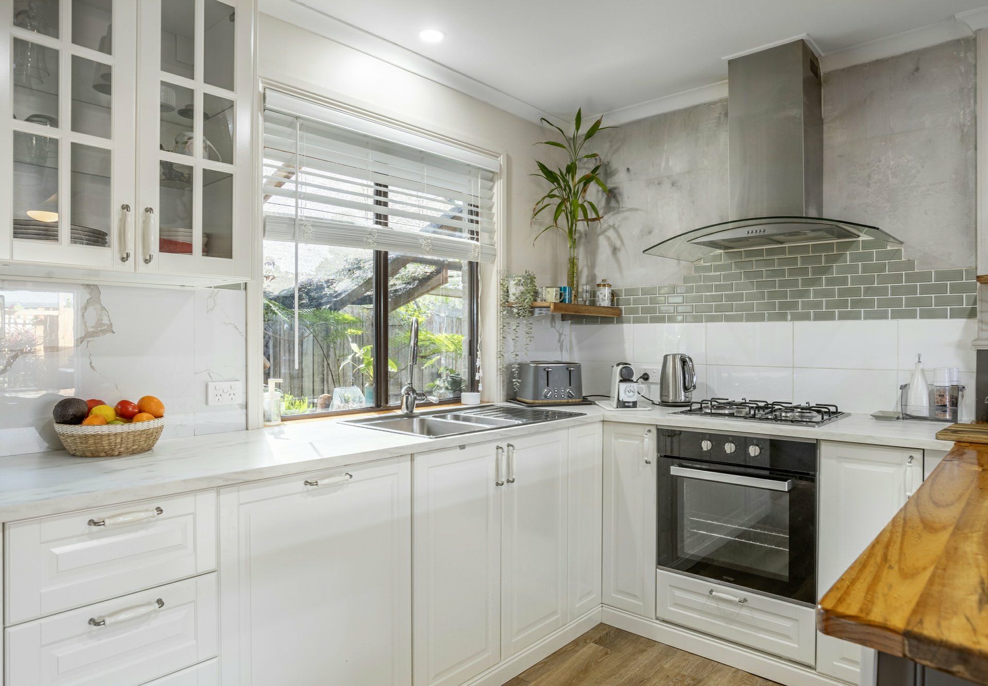 - A modern appointed kitchen with ample storage and gas cooktop.