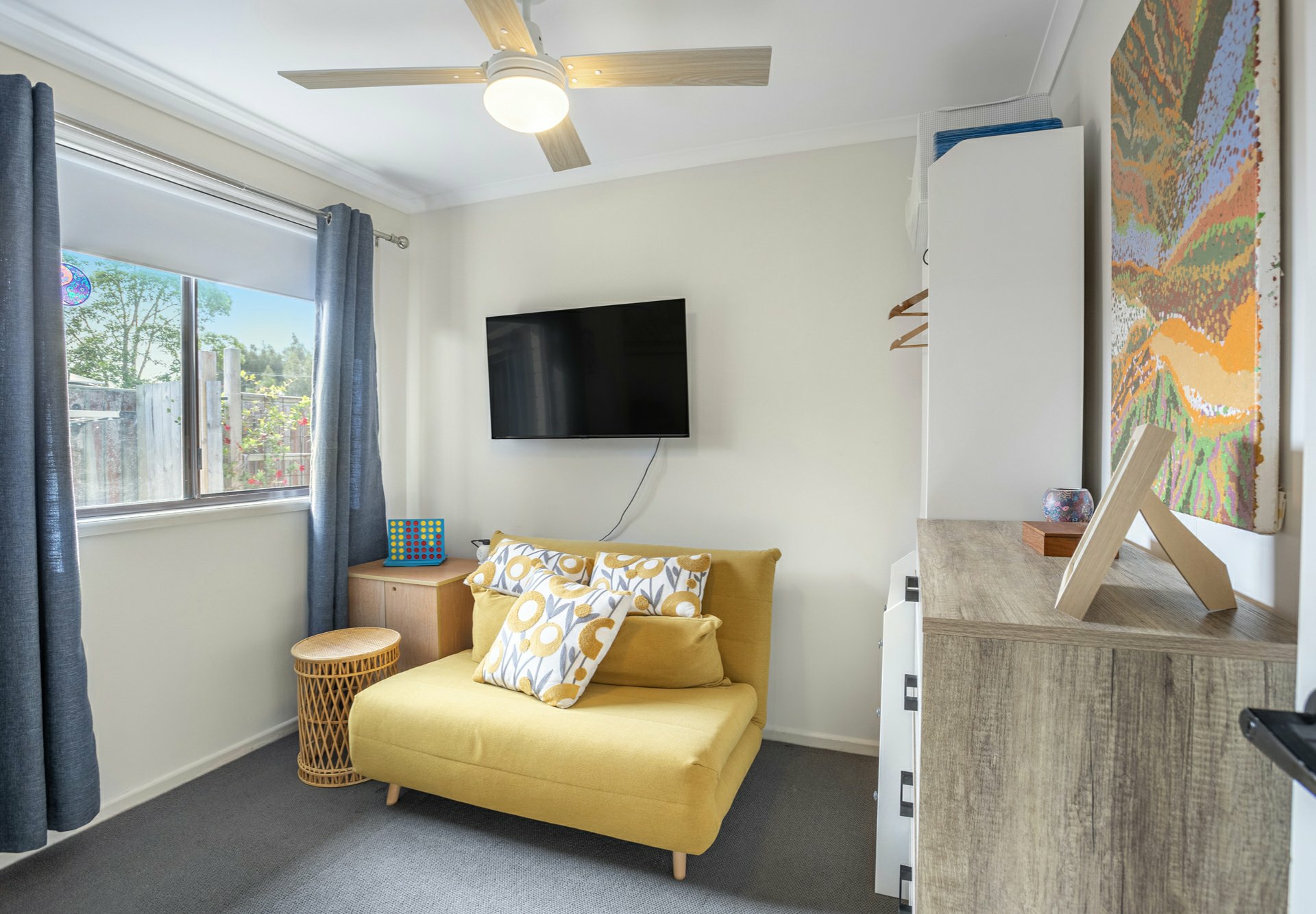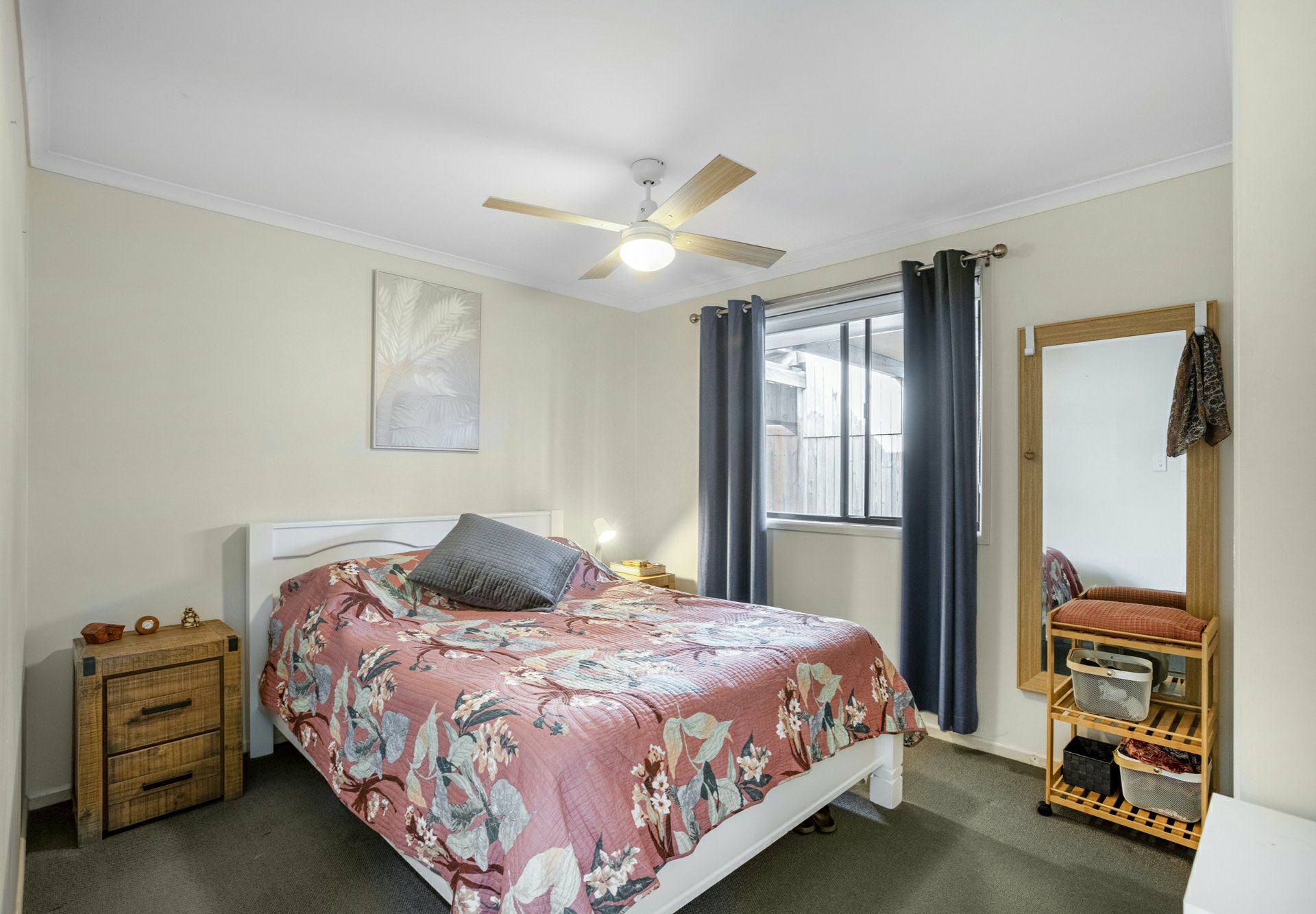 - Two bedrooms with built-in storage and ceiling fans.