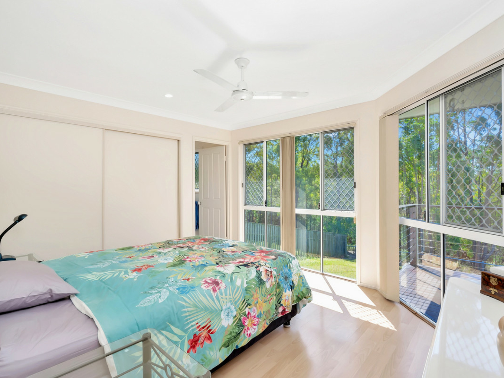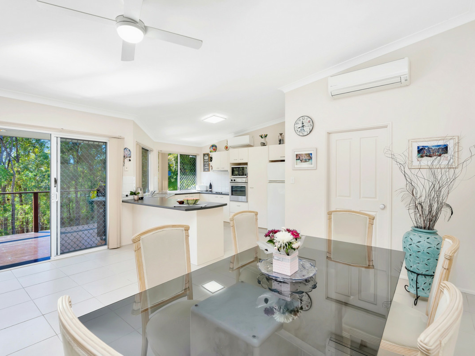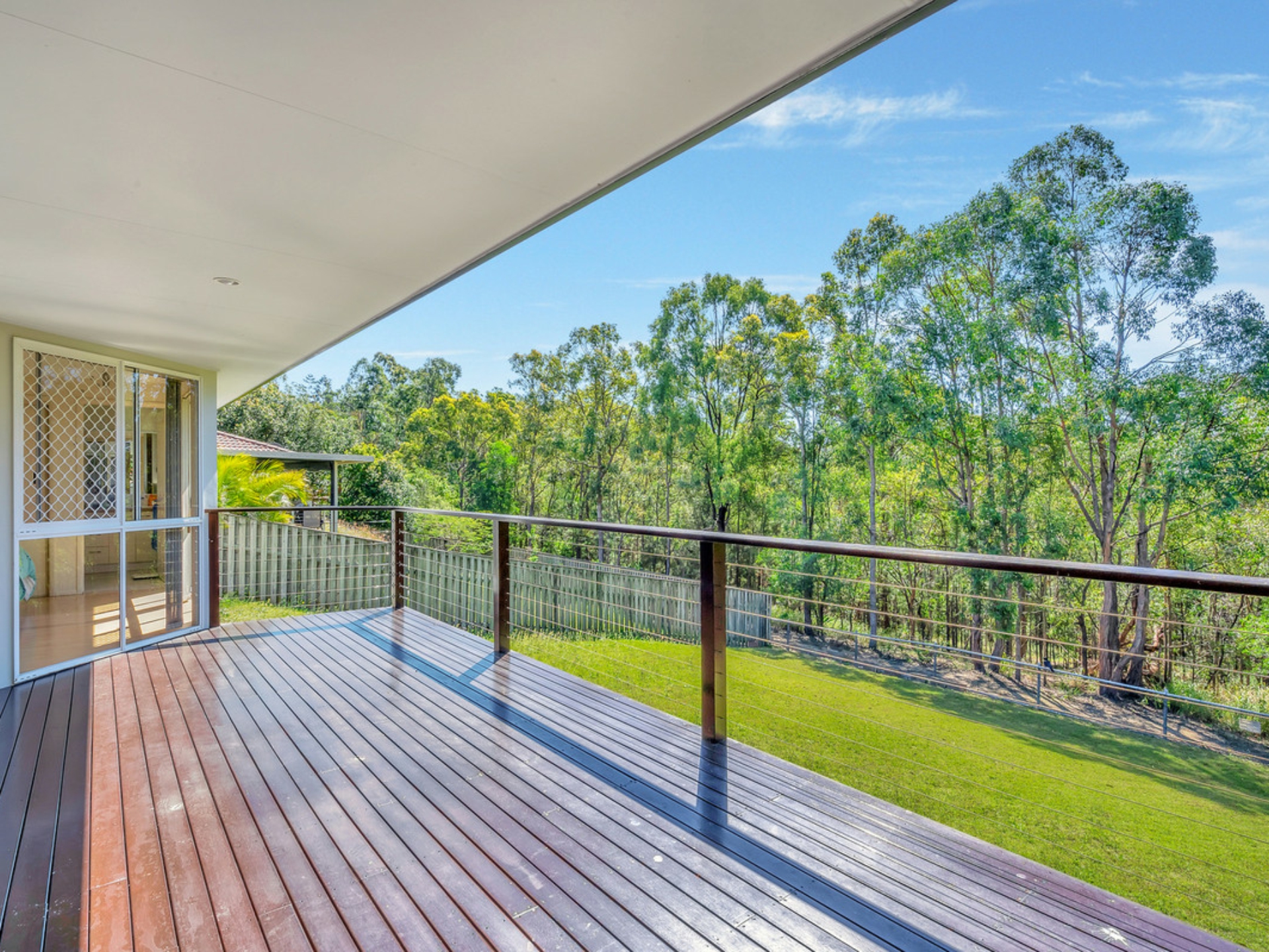 The large open plan living areas have high raked ceilings that create a lovely feeling of space. These then open out through double sliding glass doors onto a wide timber deck that overlooks the big back yard and bushland. The deck is perfect for entertaining friends and family or to just sit and relax after a hard day's work.