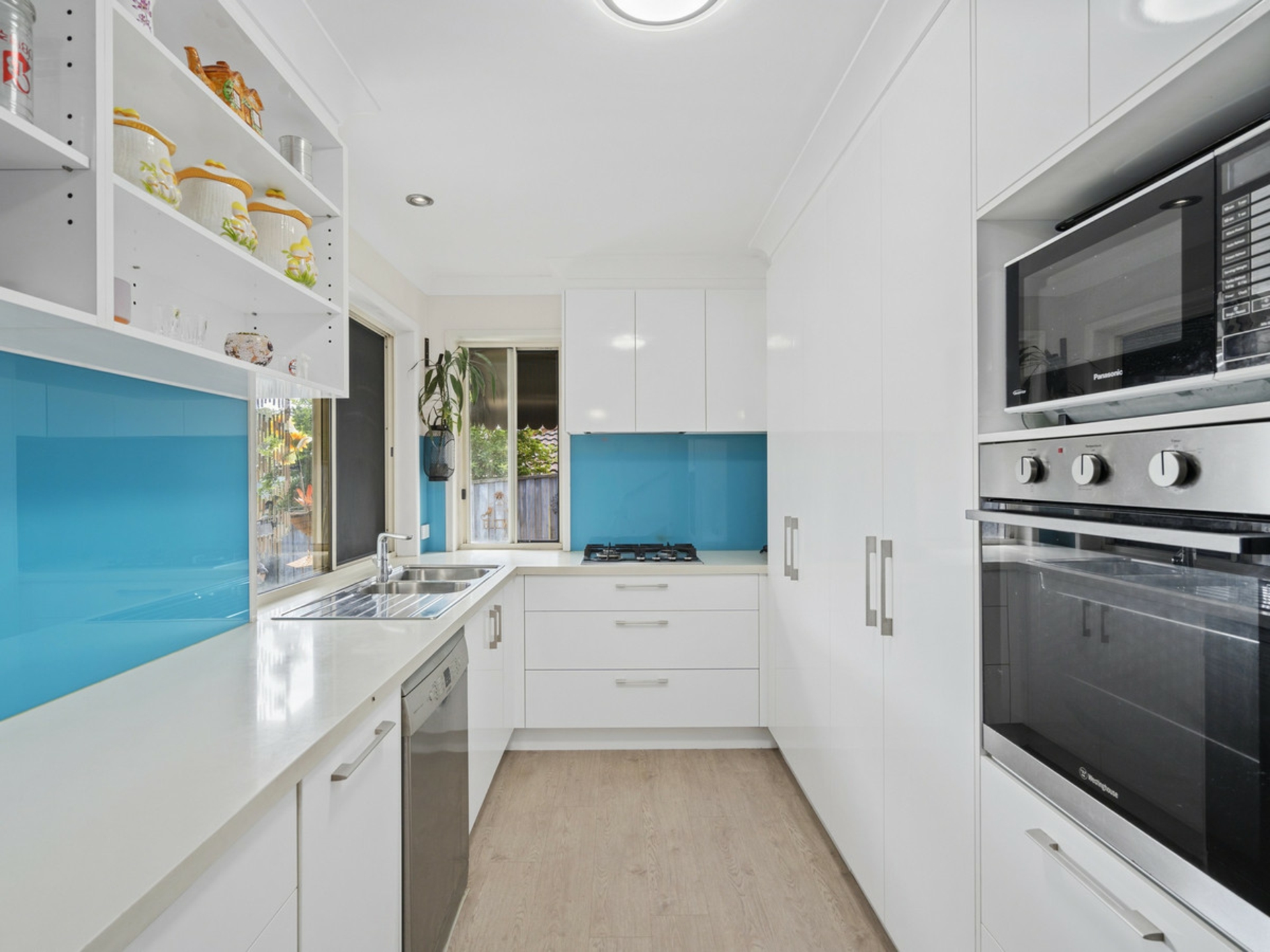 •Modern galley kitchen with gas cooking and excellent storage