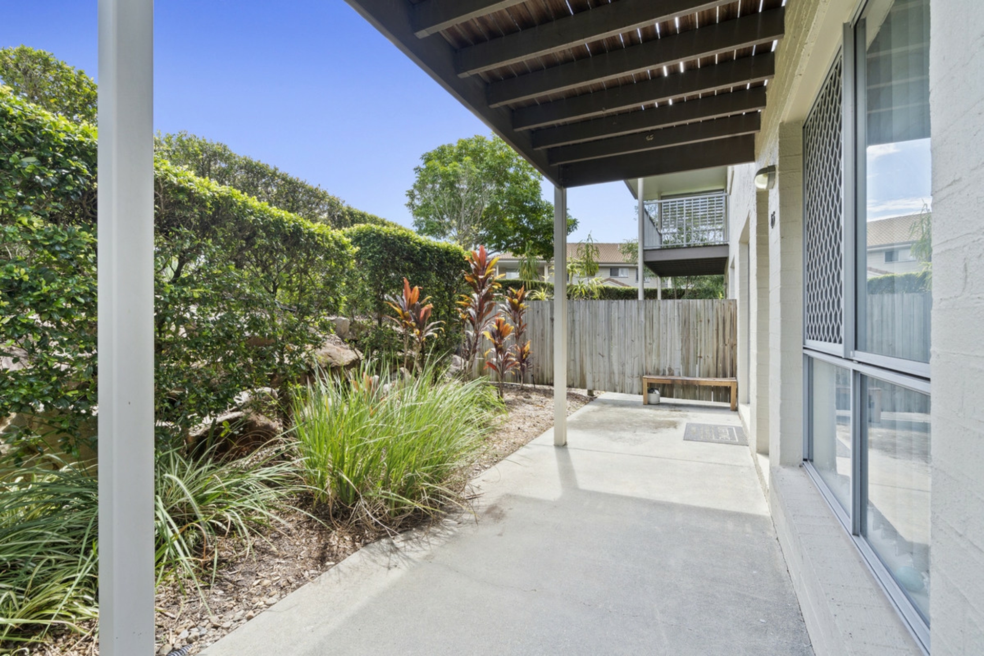 Security screens on windows on the lower floors and upper balcony doors.