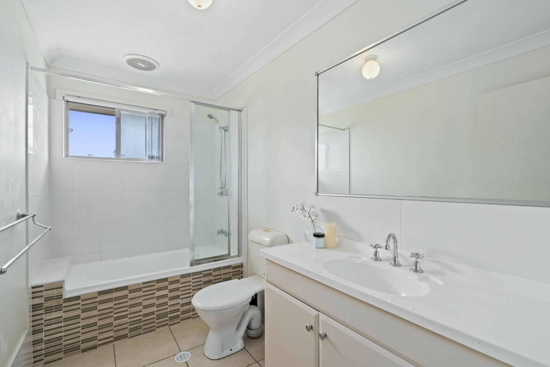 Main family bathroom with single vanity, shower over the bath, and toilet.