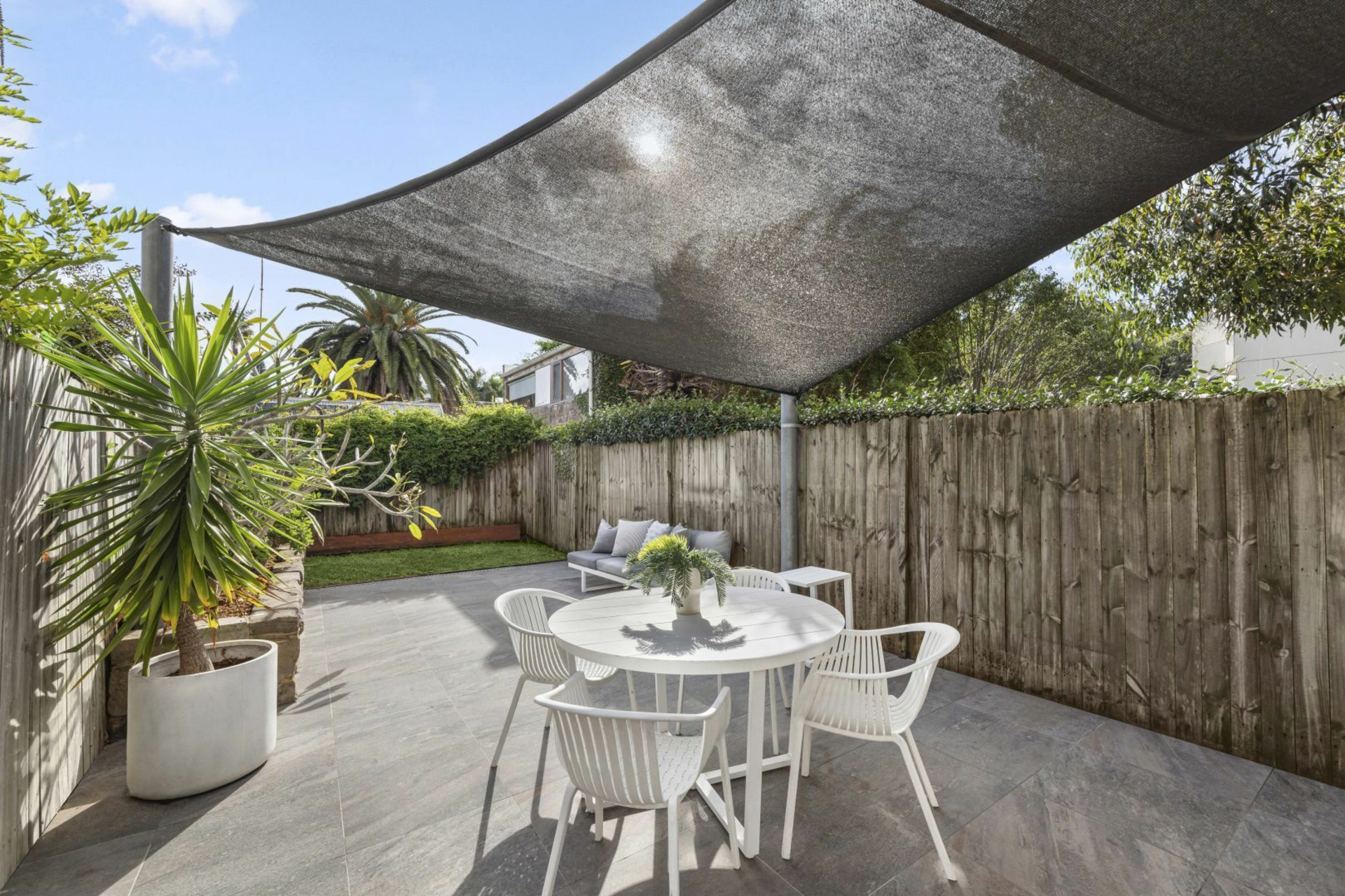 - Paved courtyard with shade awning