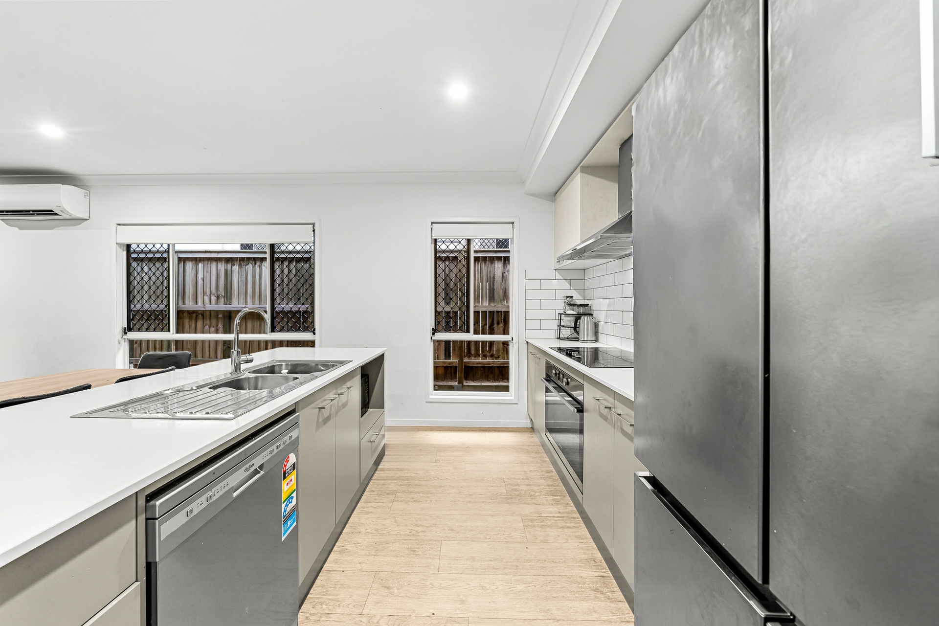 Property Features: 4-bedroom, 2-bathroom home with master ensuite and walk-in robe, built-in robes, ceiling fans, 2 split air conditioners, kitchen with electric cooktop, double garage, laundry with side access, and spacious backyard.