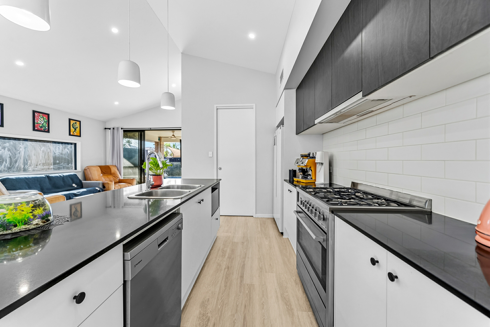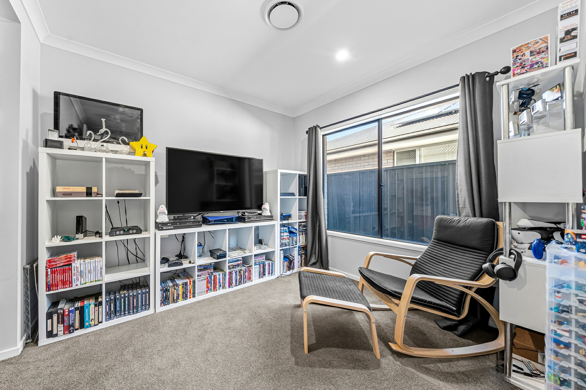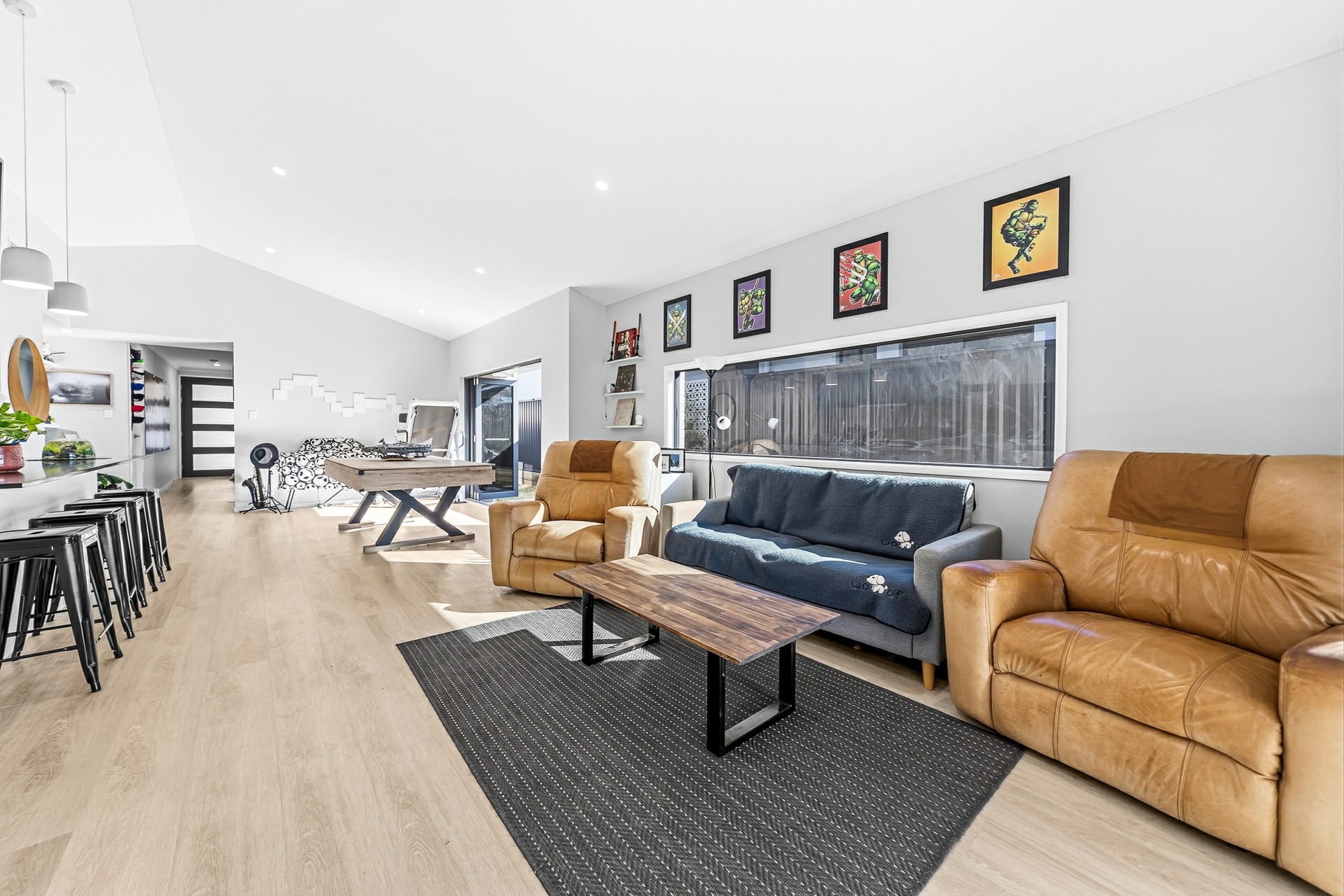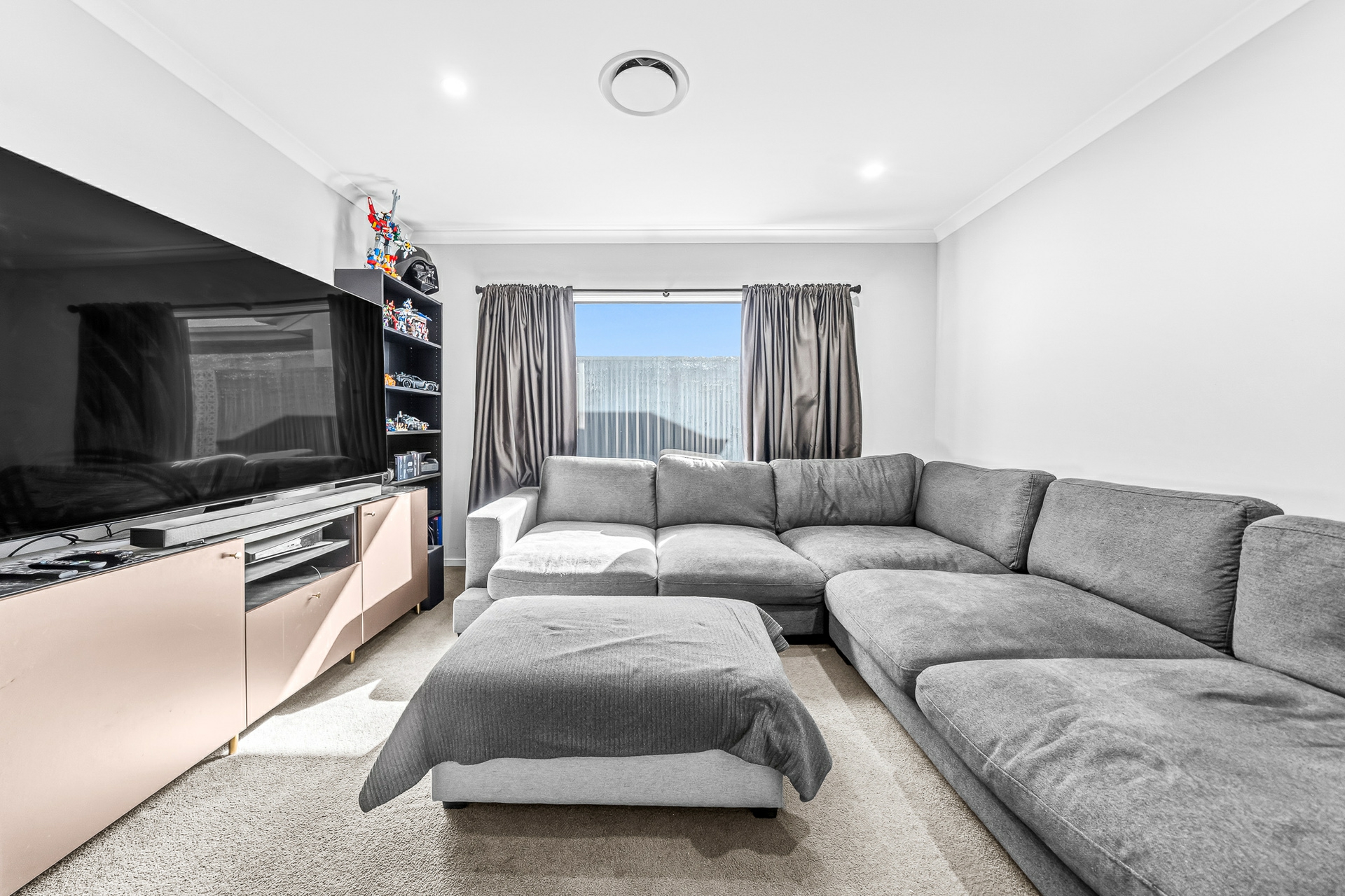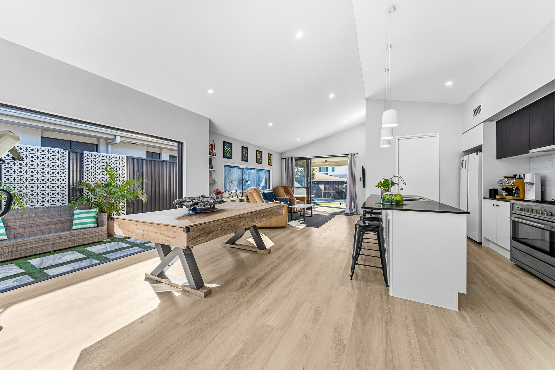 At the heart of the home is the expansive open-plan living and dining area, enhanced by raked ceilings and durable vinyl flooring. The contemporary kitchen includes a walk-in pantry and flows seamlessly into the living space, making it ideal for entertaining, while a separate media room provides the perfect space for movie nights or relaxed family living. Bifold doors open to the side access, allowing for effortless indoor-outdoor living and excellent natural ventilation.