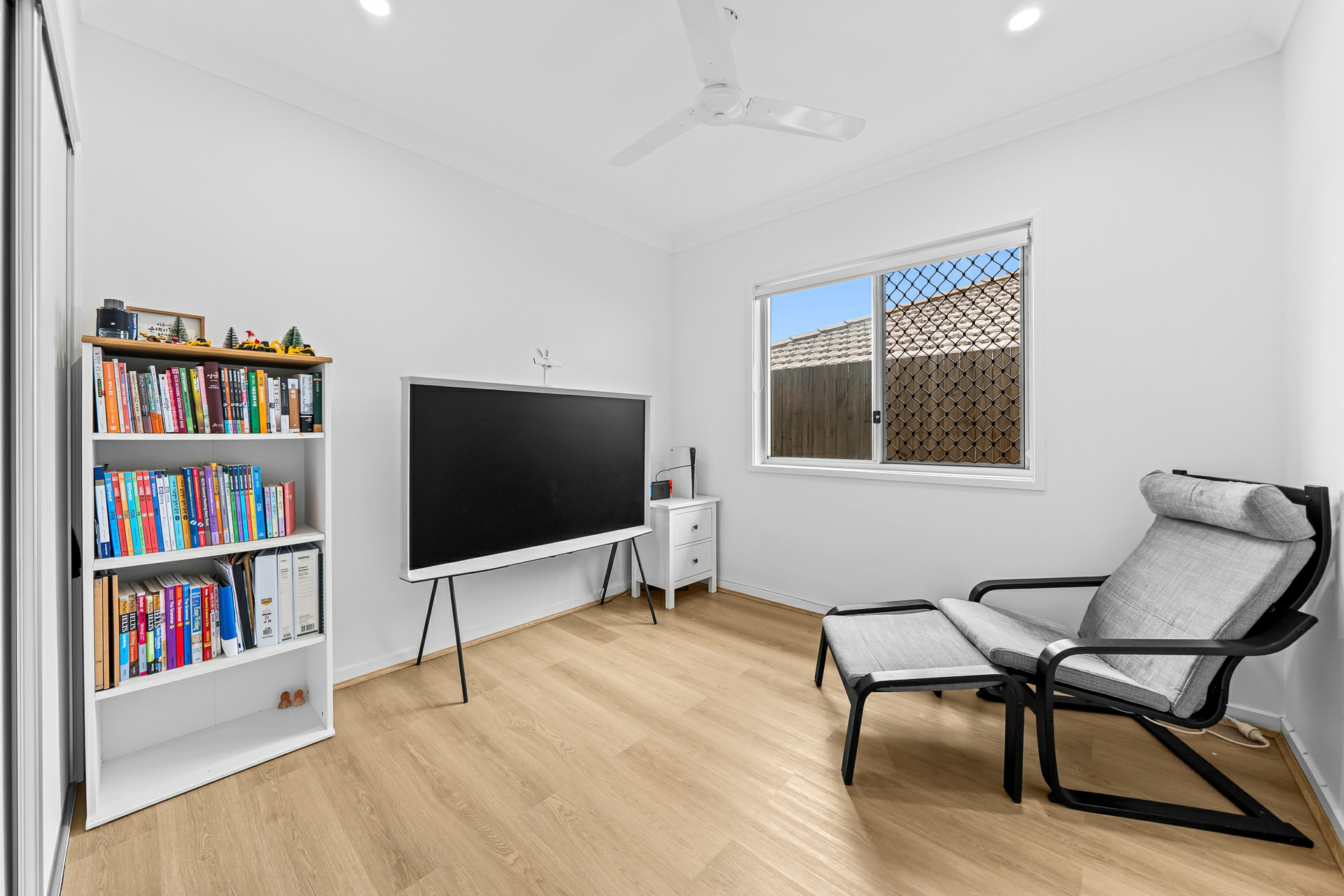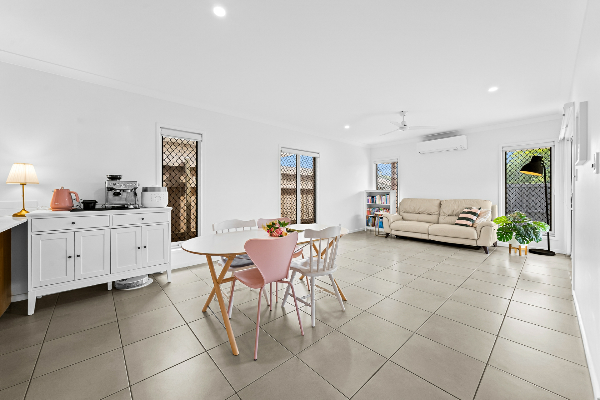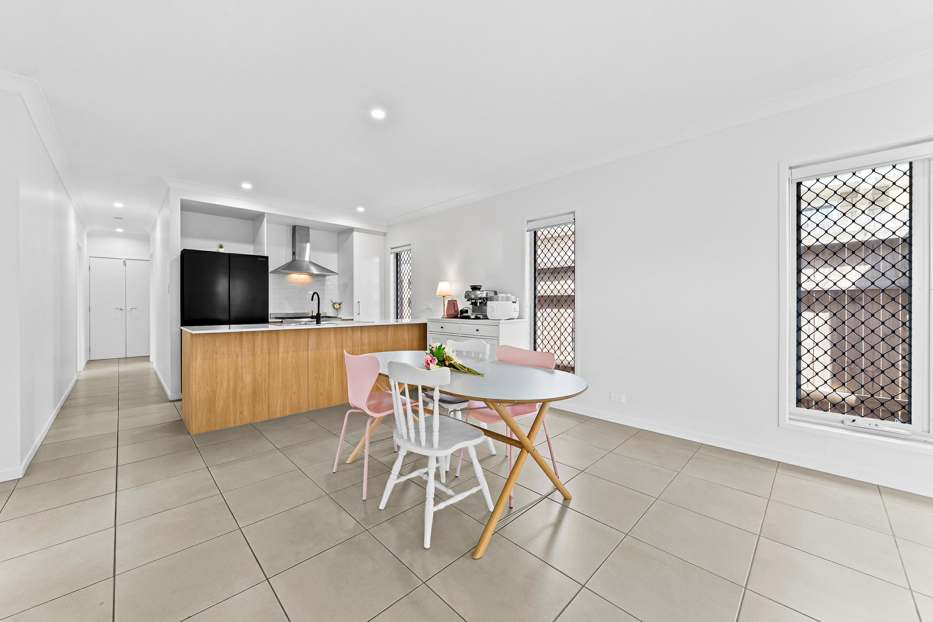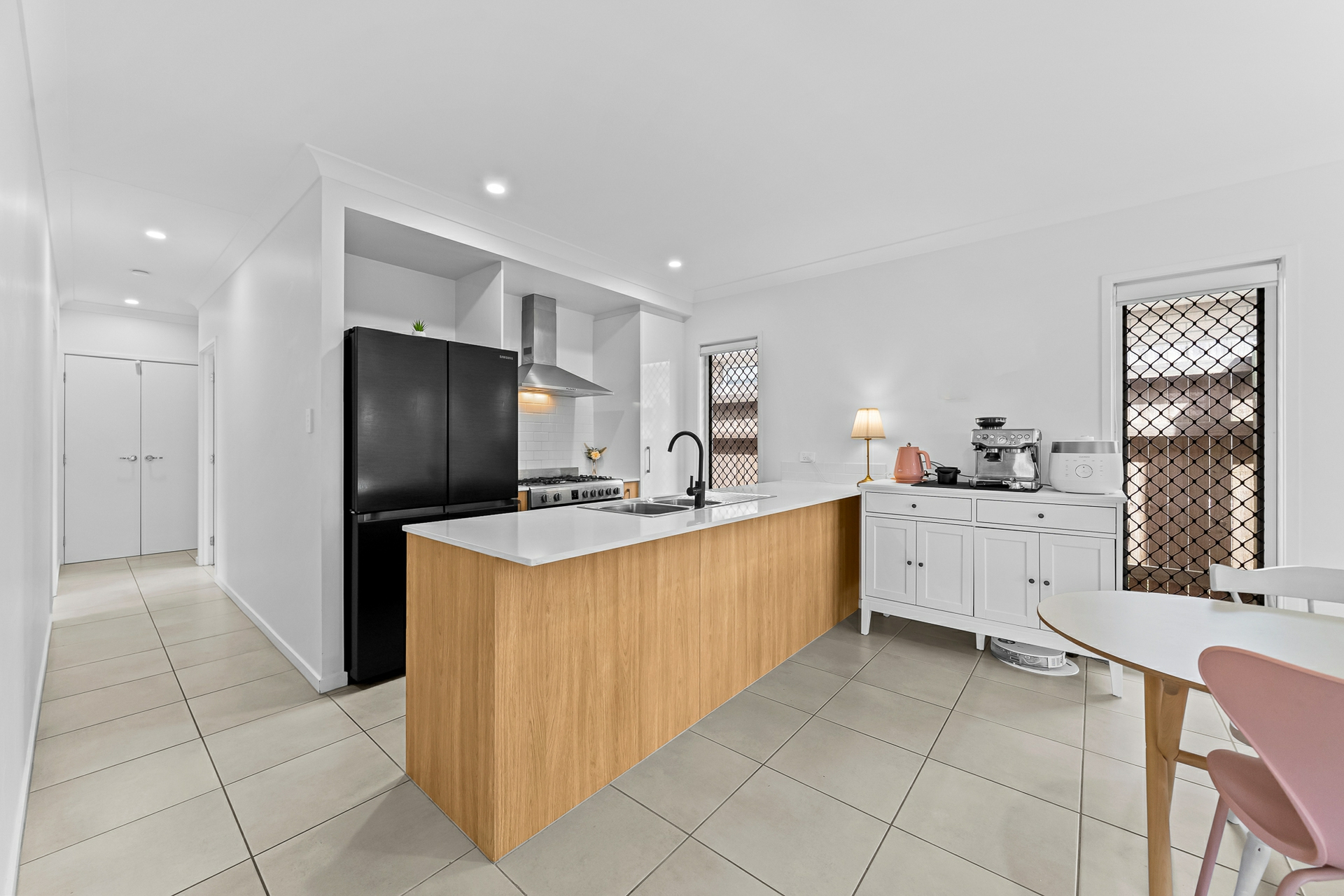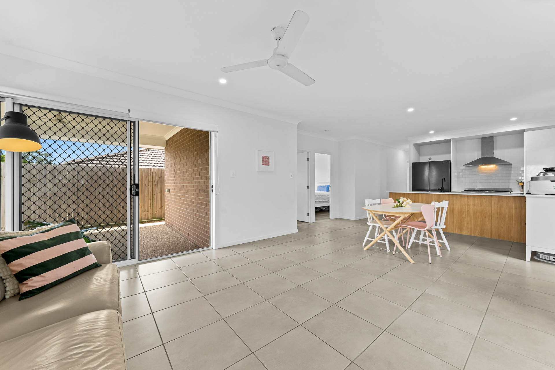 At the heart of the home is a light-filled open plan living, dining, and kitchen area designed for effortless everyday living and entertaining. The contemporary kitchen features modern stone benchtops, a 900mm freestanding gas cooktop, dishwasher, and ample storage. Glass sliding doors extend the living space to a covered alfresco area, creating a seamless indoor-outdoor flow and an ideal setting for weekend gatherings.