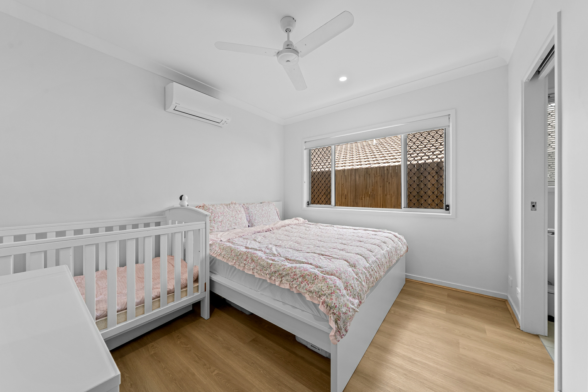 The home comprises four well-sized bedrooms and two modern bathrooms. Three bedrooms include built-in wardrobes, ceiling fans, and durable hybrid flooring, while the master suite is privately positioned and complete with a walk-in wardrobe and stylish ensuite. The main bathroom is centrally located to service the remaining bedrooms and includes quality fittings and finishes.