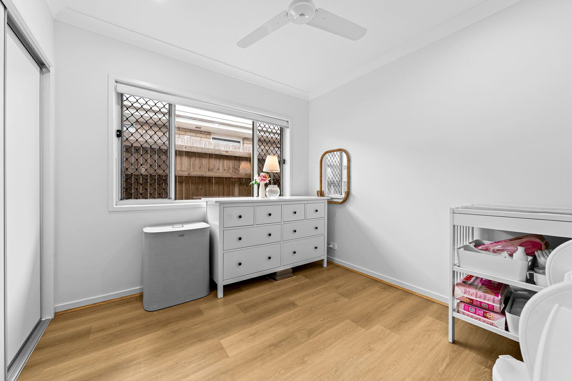 - Three good sized bedrooms with built-ins, ceiling fans, and hybrid flooring.