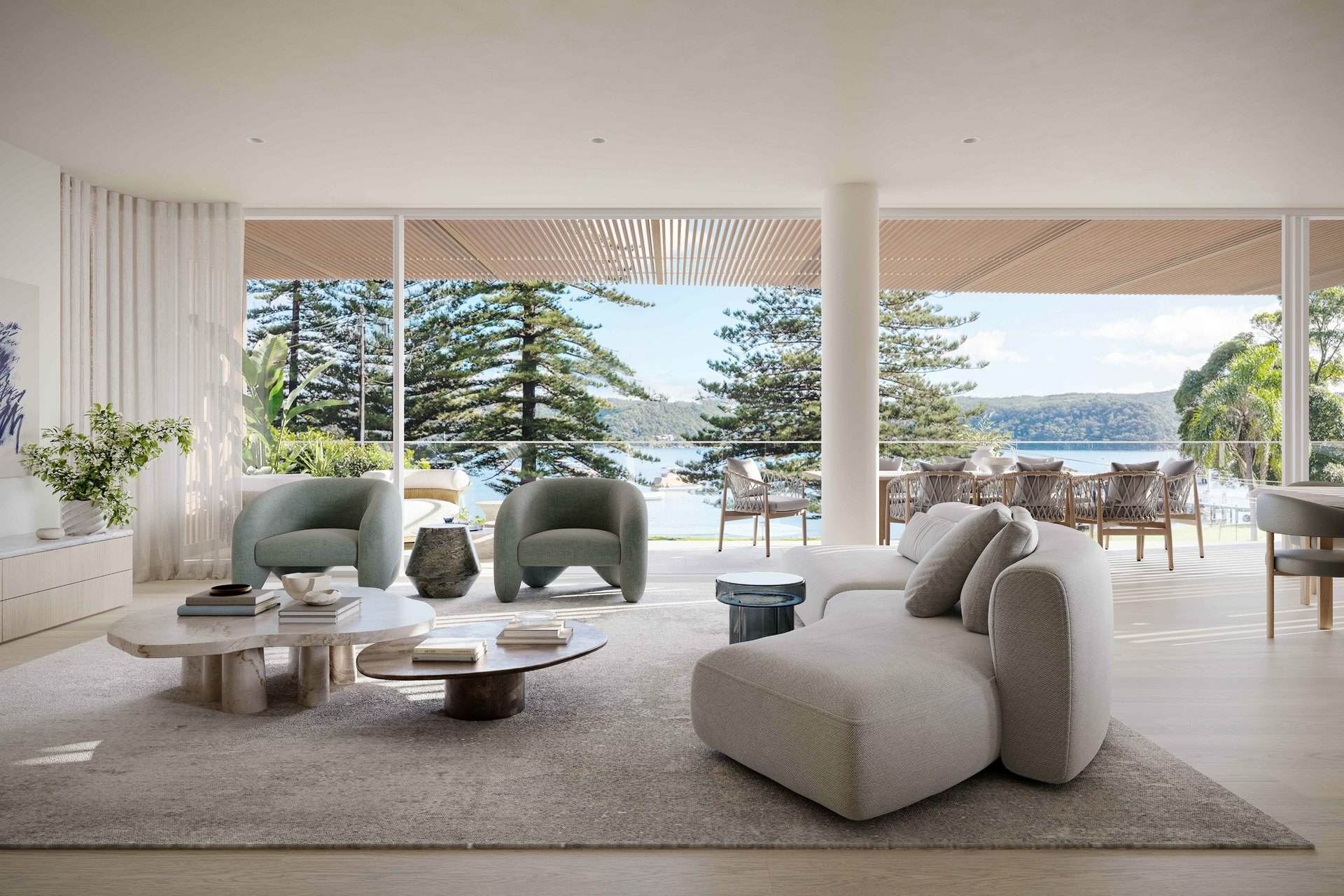 A home that feels grounded in nature, artfully designed by Koichi Takada Architects with interiors by Mim Design, every detail within Snappermans responds to the surrounding beauty of Pittwater and the lush national park beyond. Timber finishes, curved forms, and a palette of soft mineral tones create a calm and contemporary aesthetic, perfectly attuned to its natural setting. The generous layout of Residence 1 orients all major living areas toward the water, bathing interiors in light and inviting a constant sense of connection to nature. From sunrise reflections to golden afternoon light, the residence offers a front-row seat to Pittwater's ever-changing moods.
