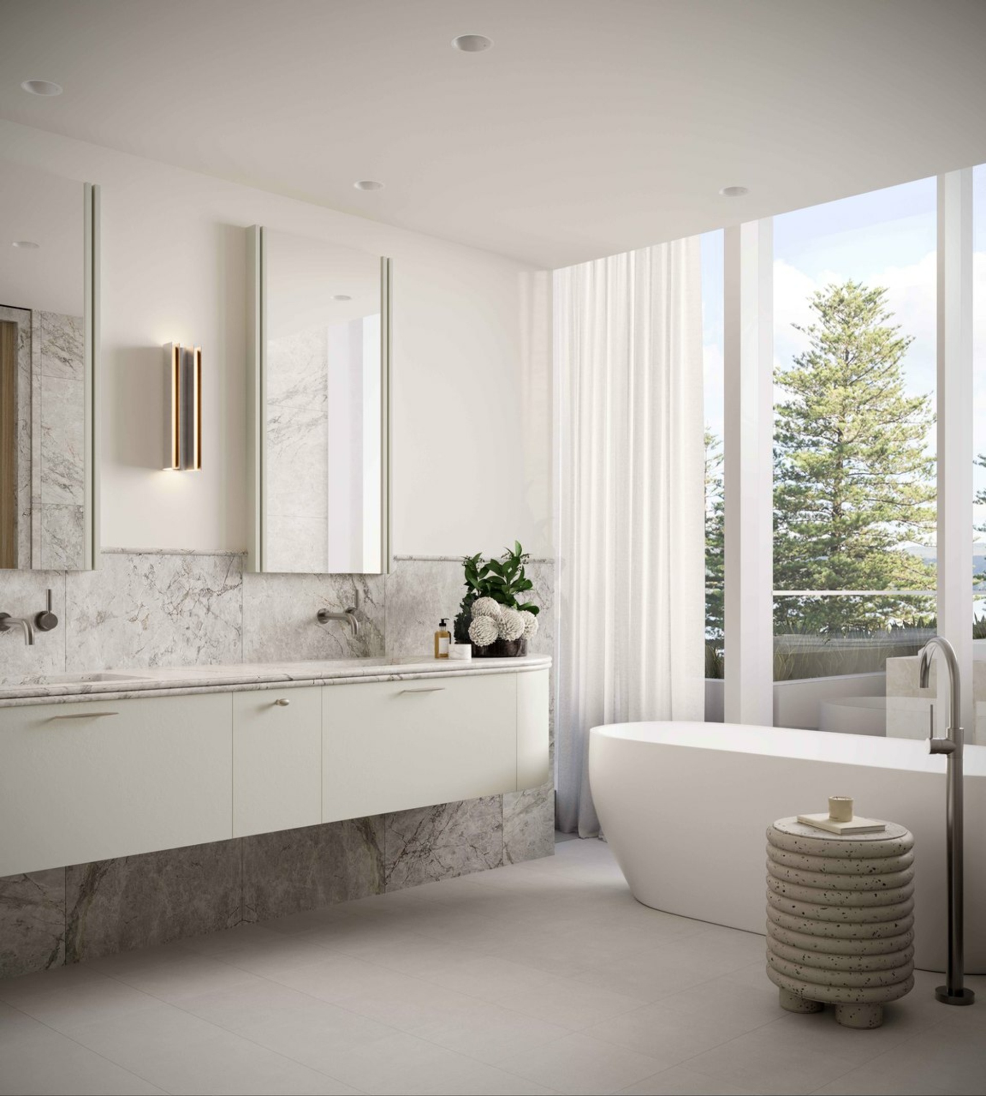 Luxury meets liveability at Snappermans. The expansive kitchen features sculptural joinery, a custom cladding element, and seamless integration with the living and dining areas. The expansive balcony offers an ideal space for entertaining or unwinding, while the media room and fireplace provide additional layers of comfort and retreat. Oversized bathrooms with mosaic detailing and rain showers feature Sub-Zero appliances and Astra Walker tapware. Every element speaks to enduring quality and quiet luxury.