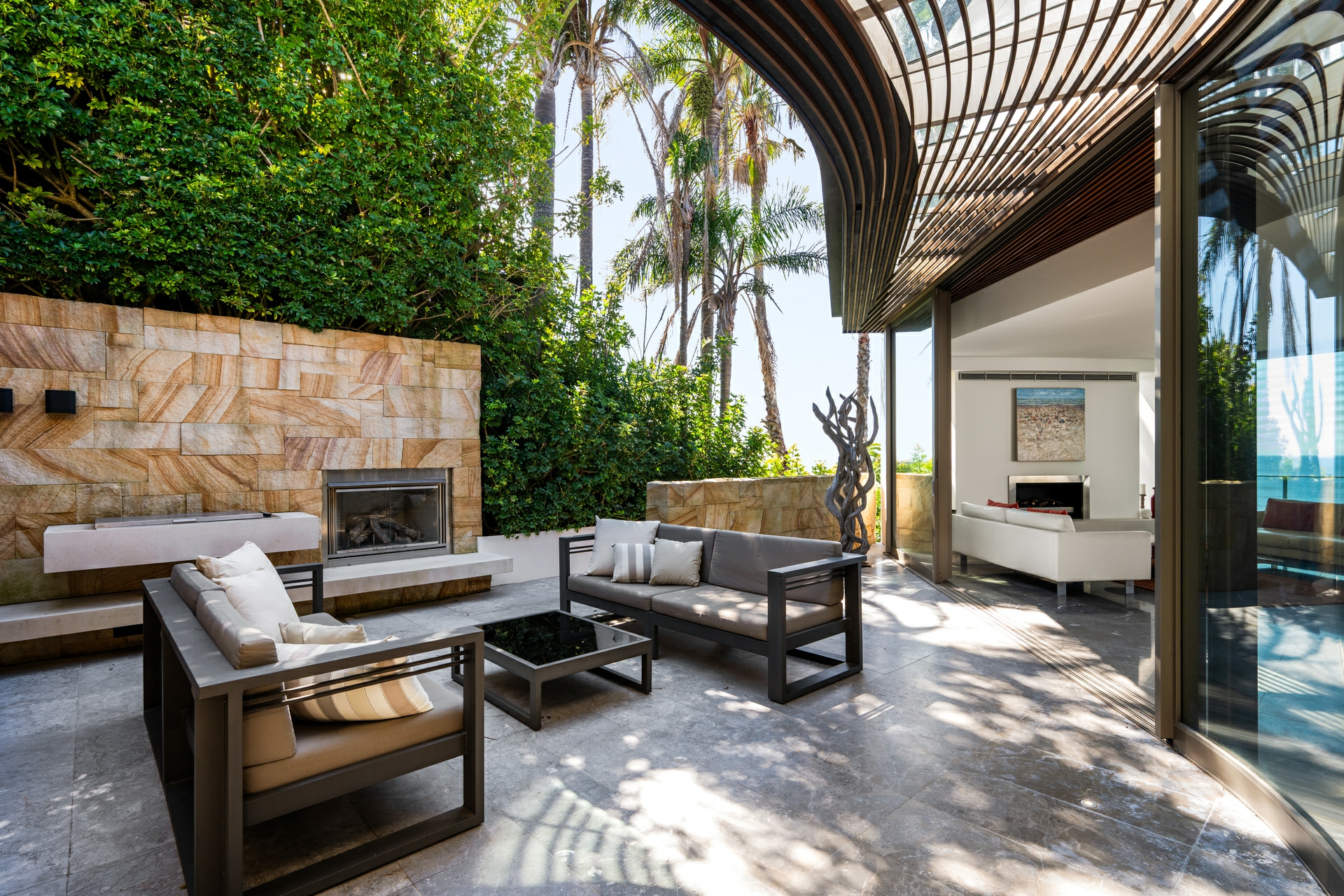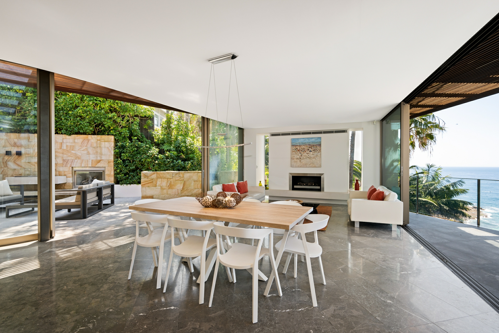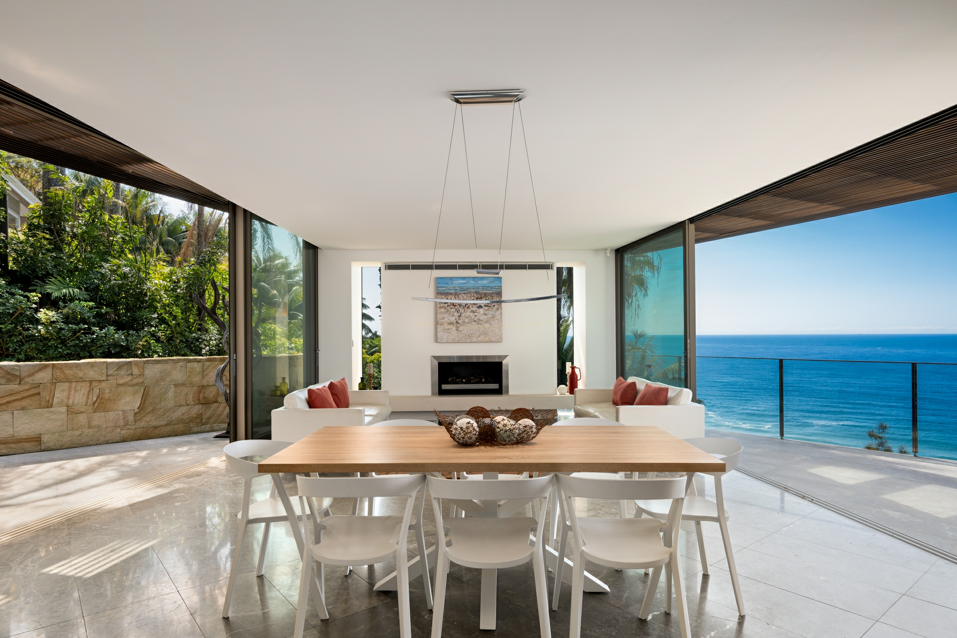 - Vast glass doors opening to a protected, north-facing courtyard with ocean outlook, built-in BBQ and fireplace for year-round entertaining