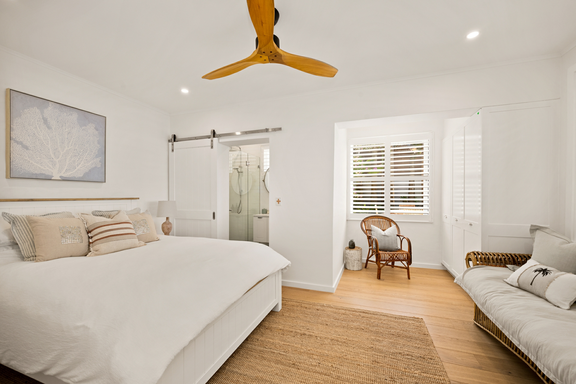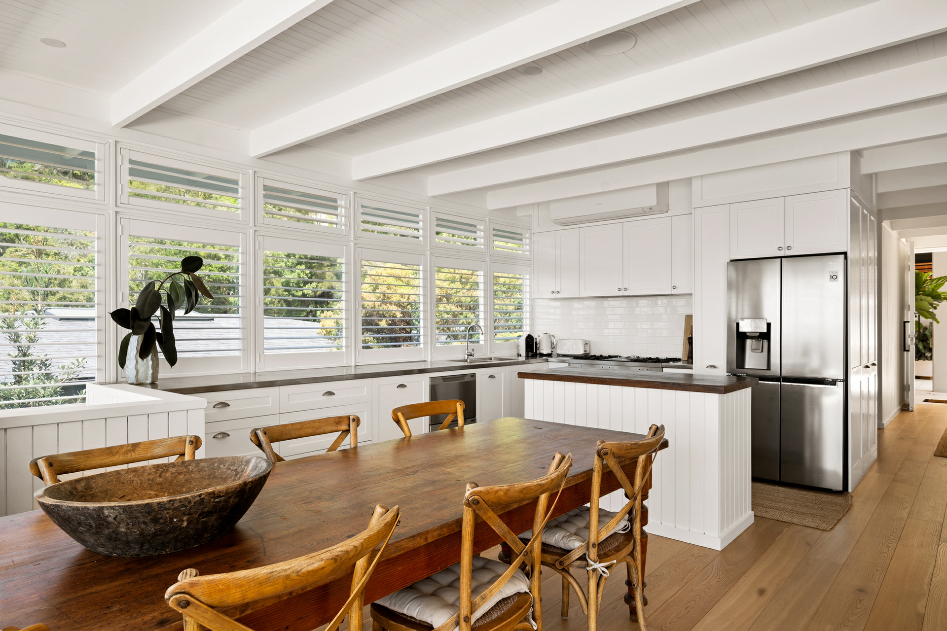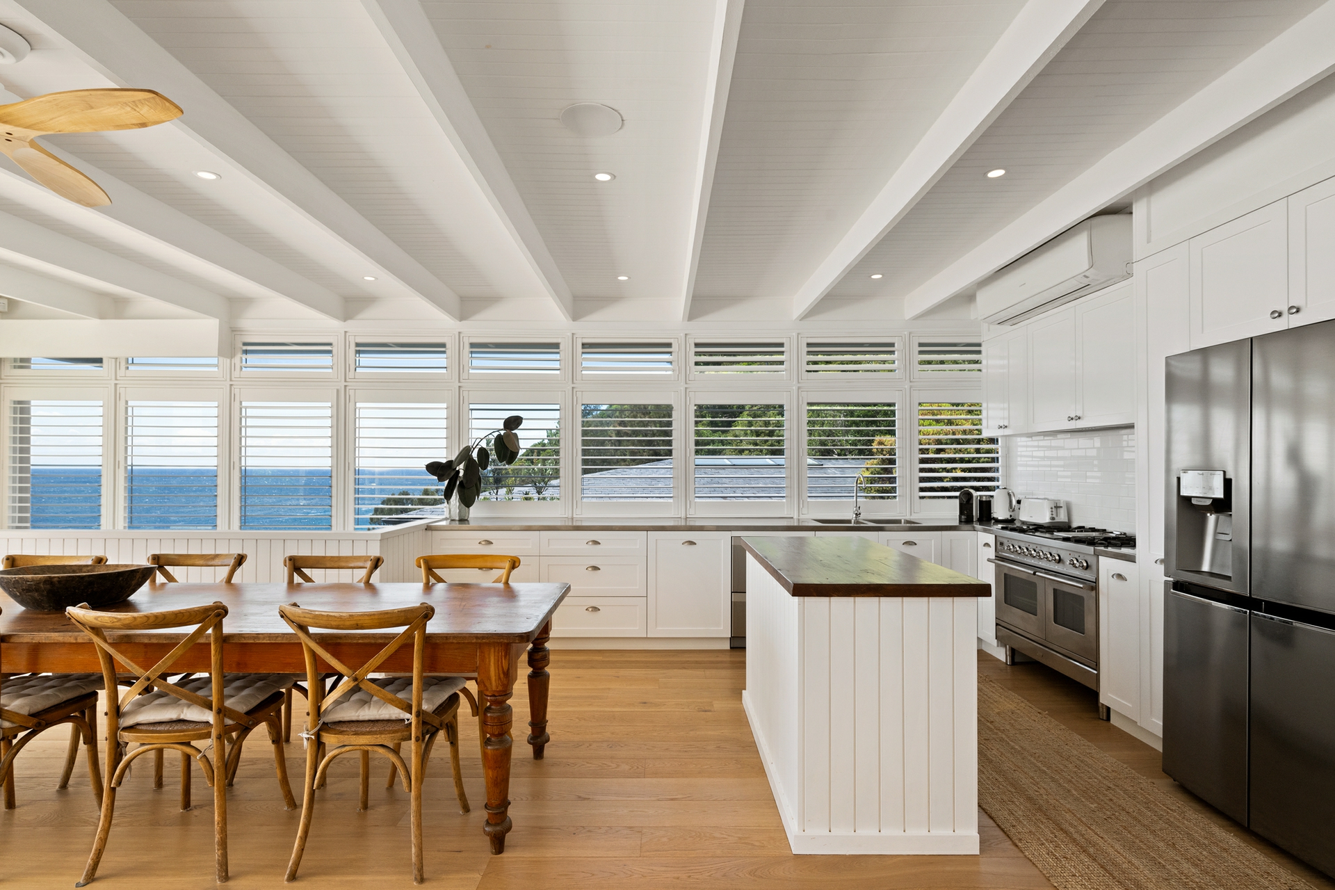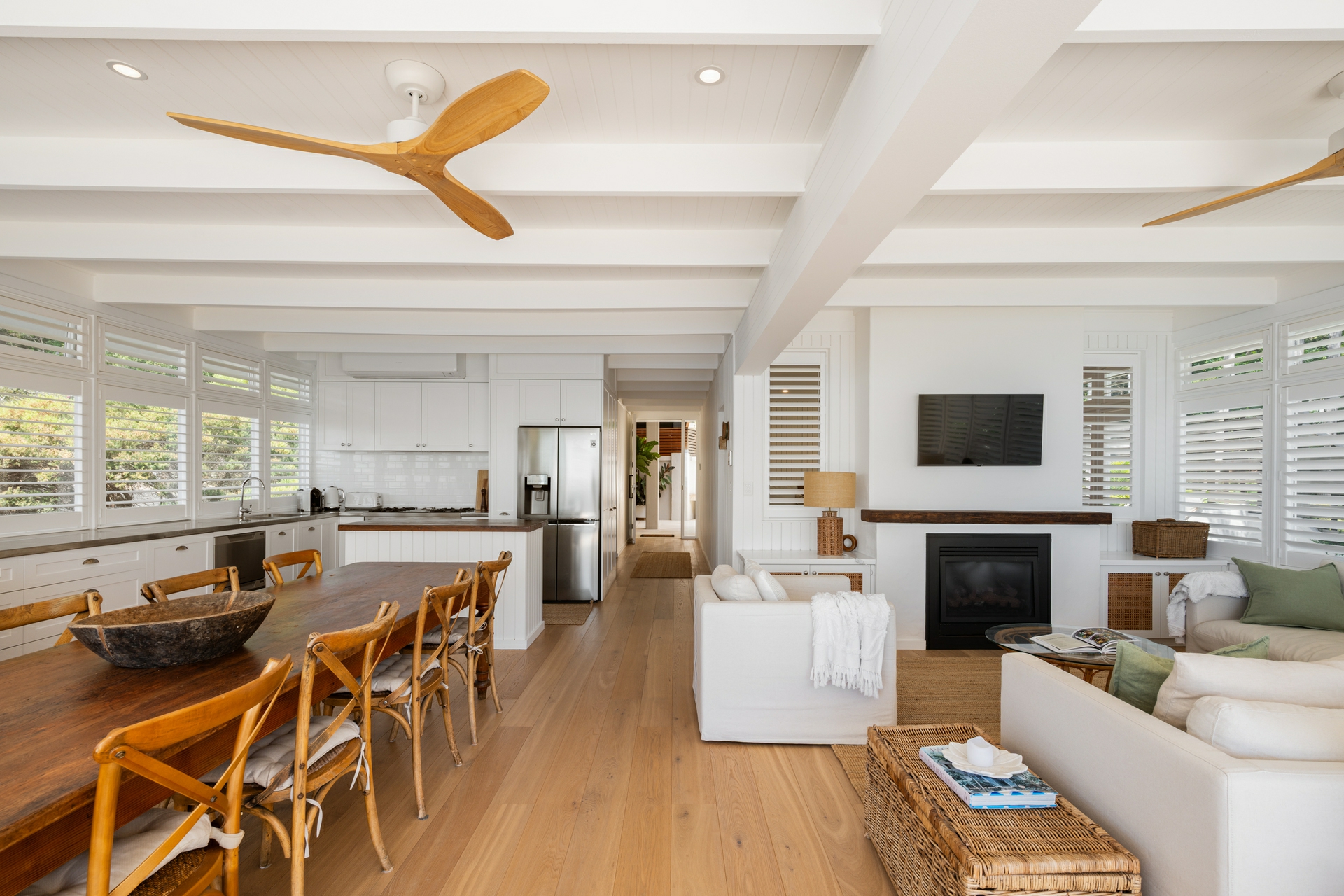 - Distinctive coastal aesthetic: white palette, oak floors, plantation shutters, and tongue-and-groove wall panelling