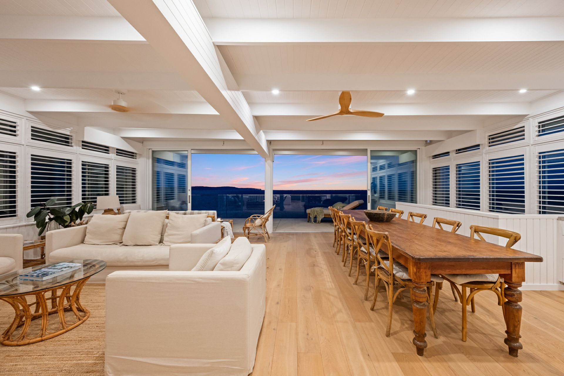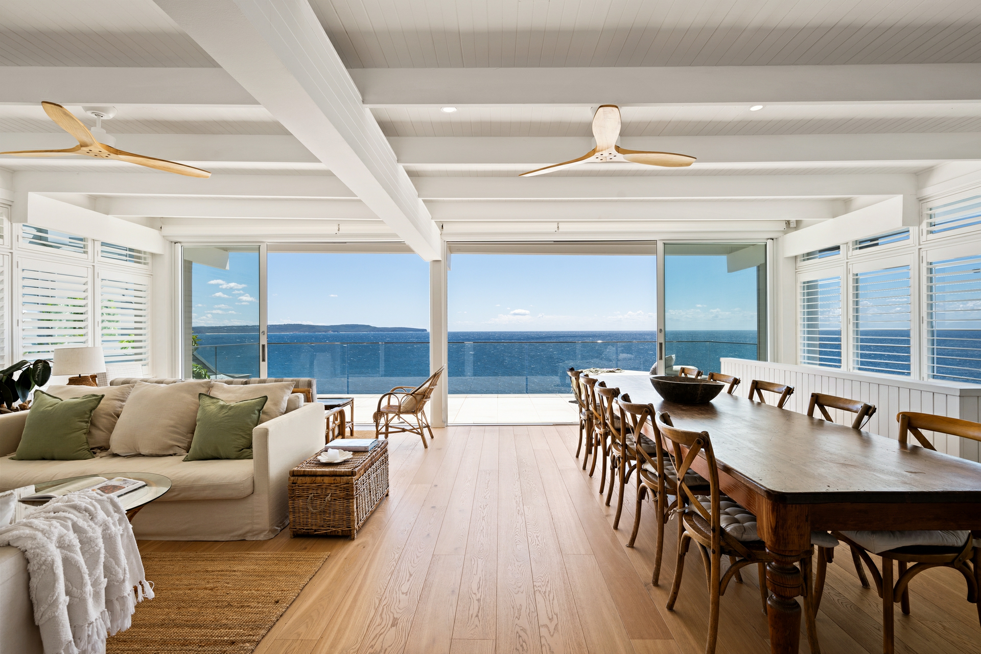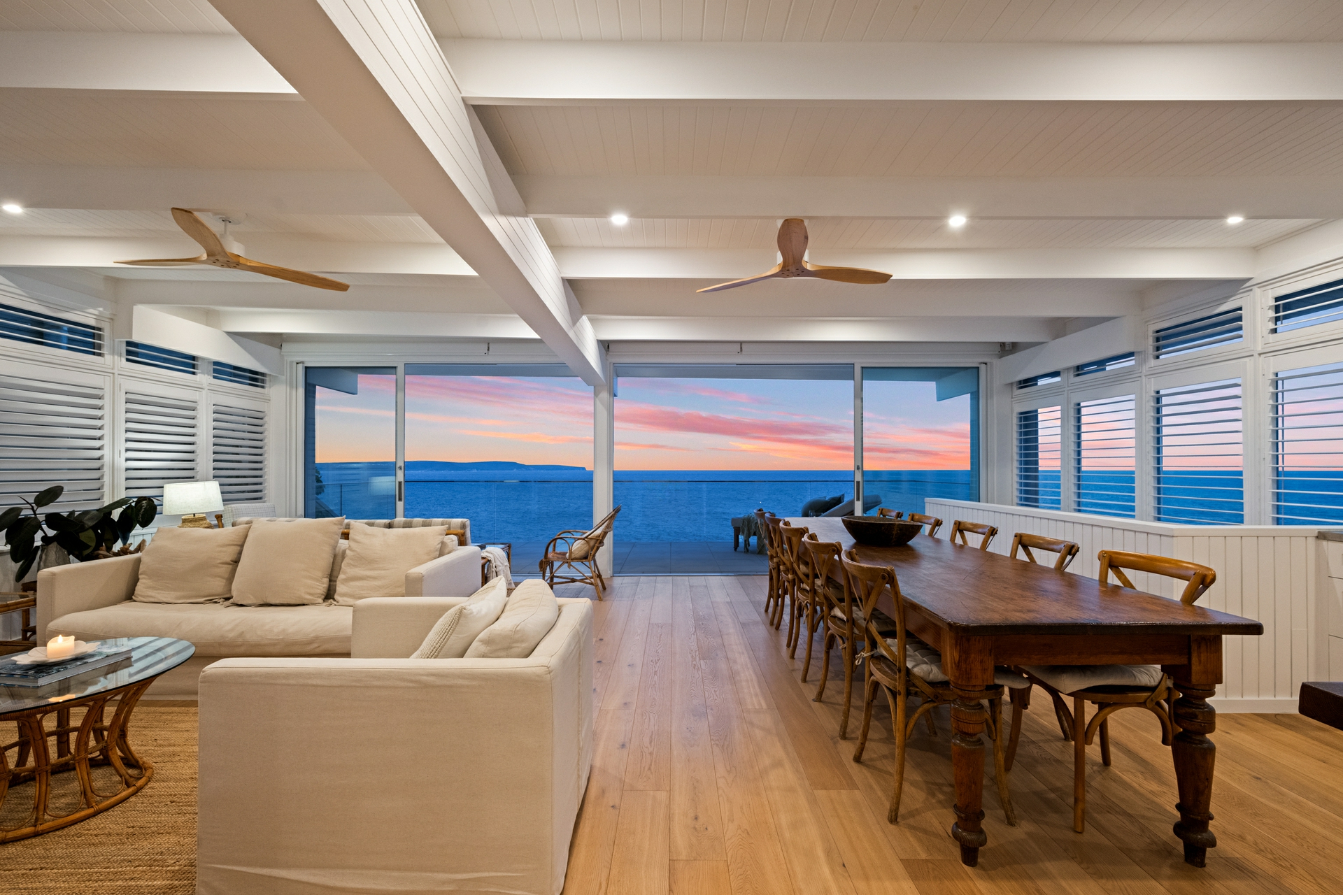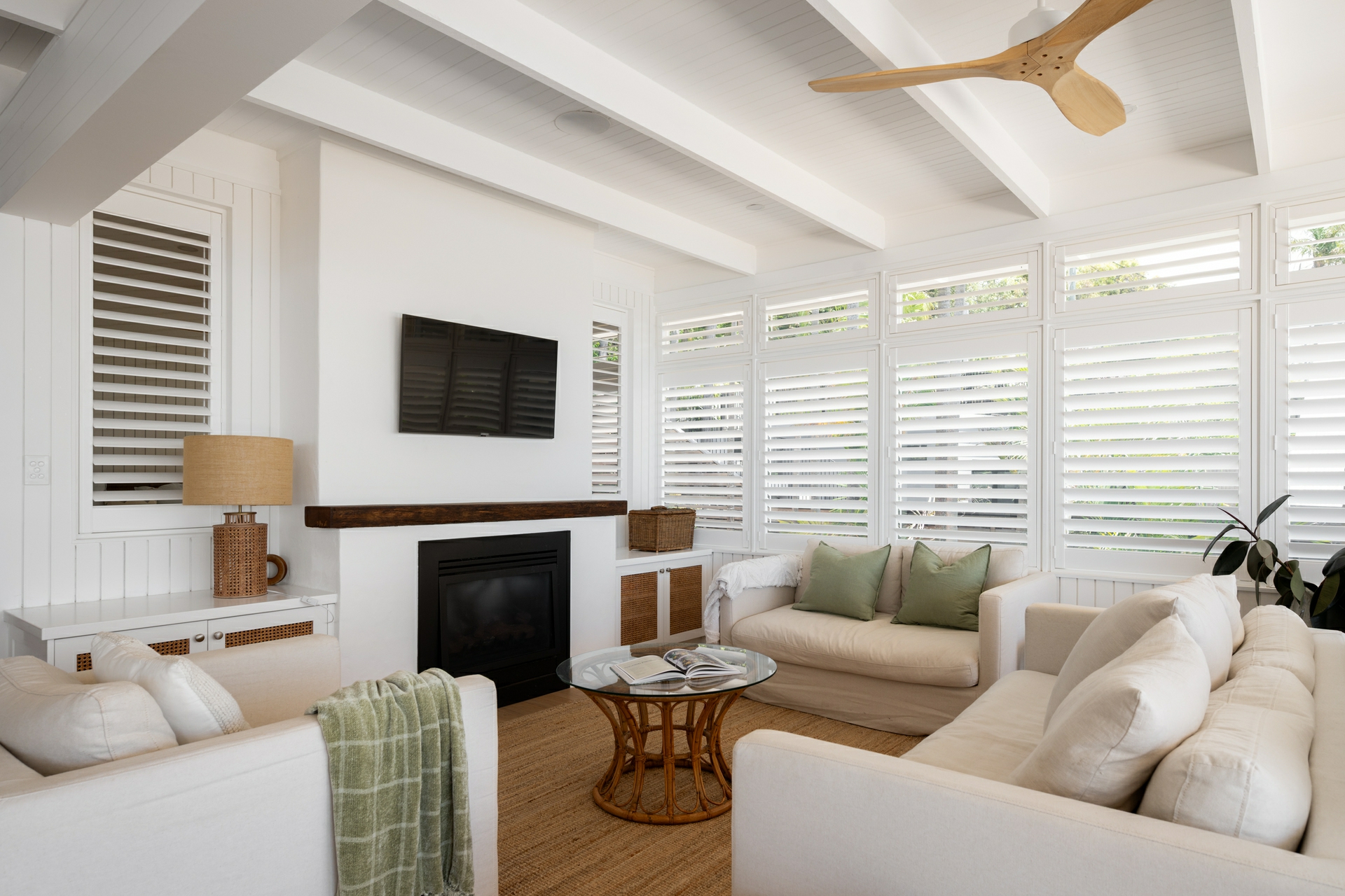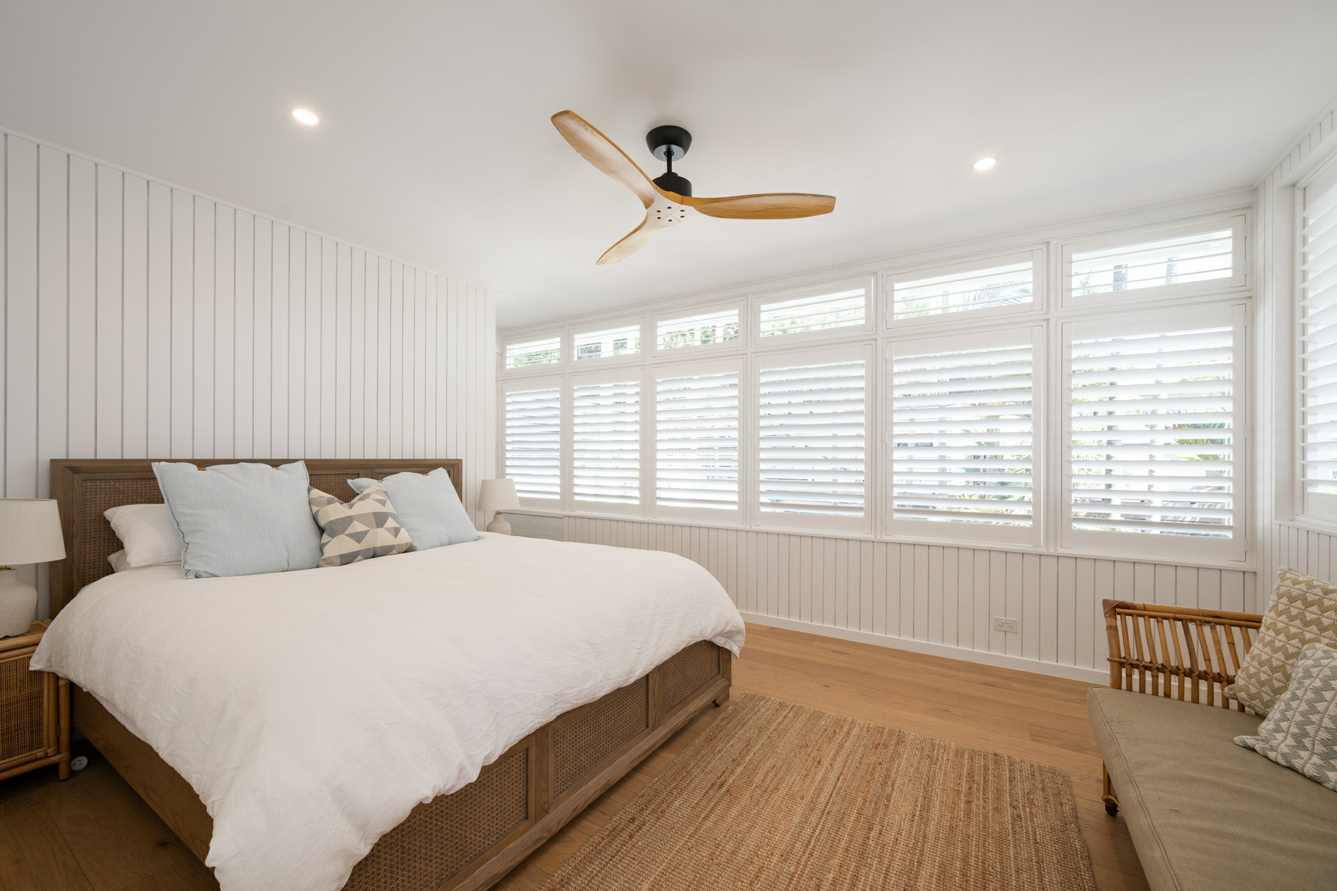 - Distinctive coastal aesthetic: white palette, oak floors, plantation shutters, and tongue-and-groove wall panelling