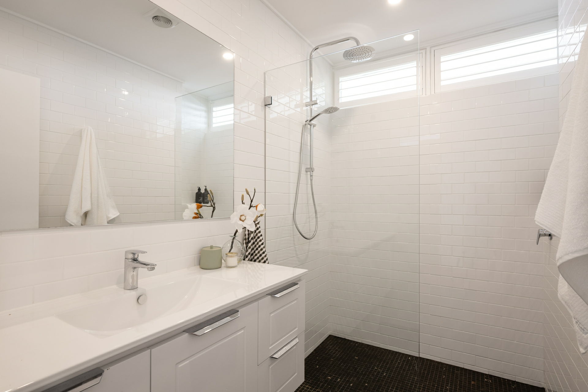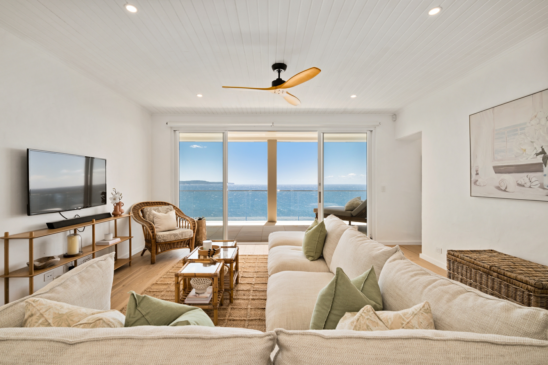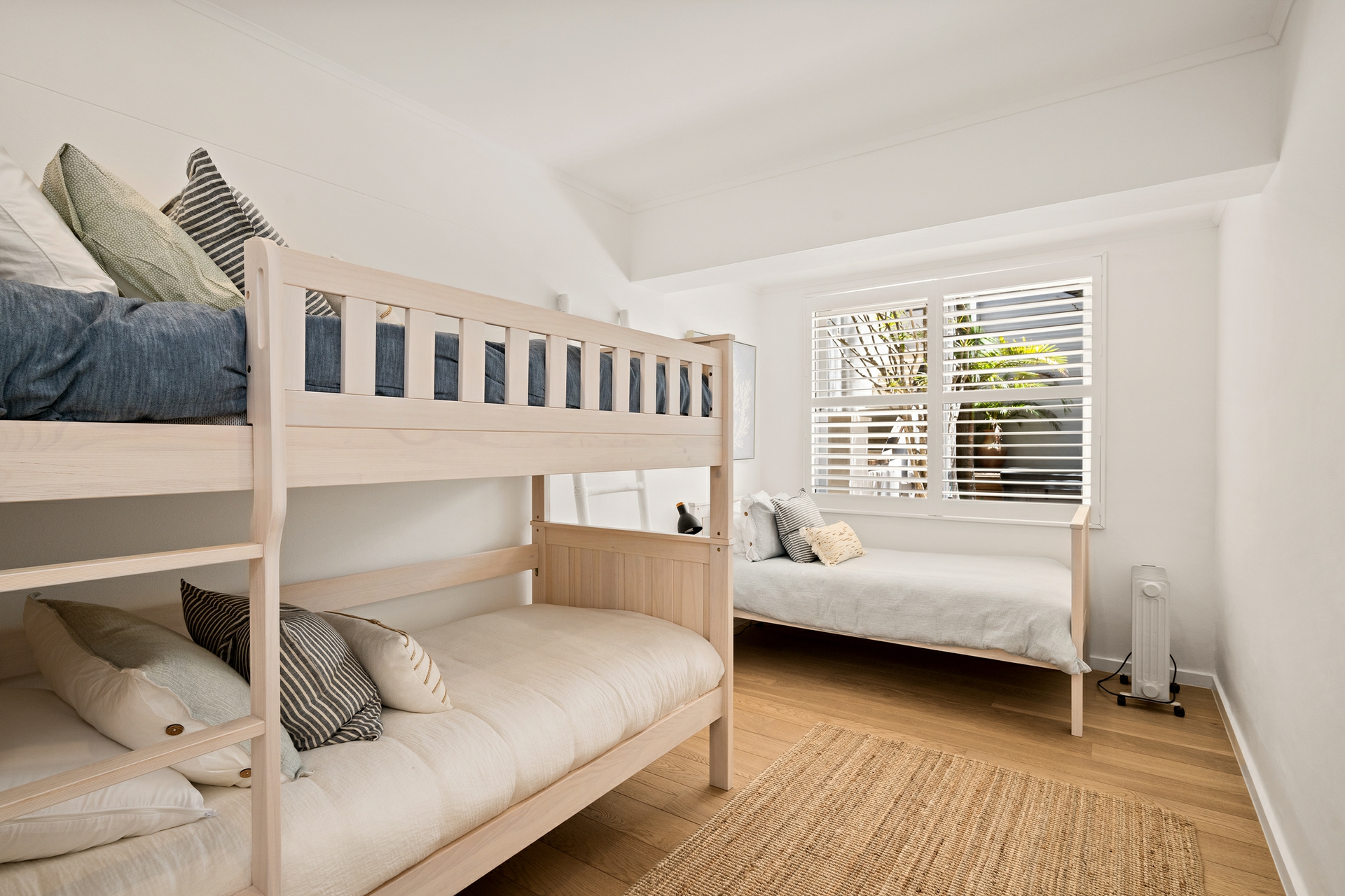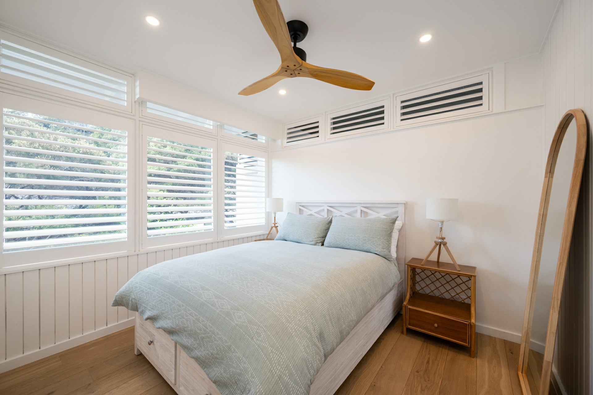 - Distinctive coastal aesthetic: white palette, oak floors, plantation shutters, and tongue-and-groove wall panelling