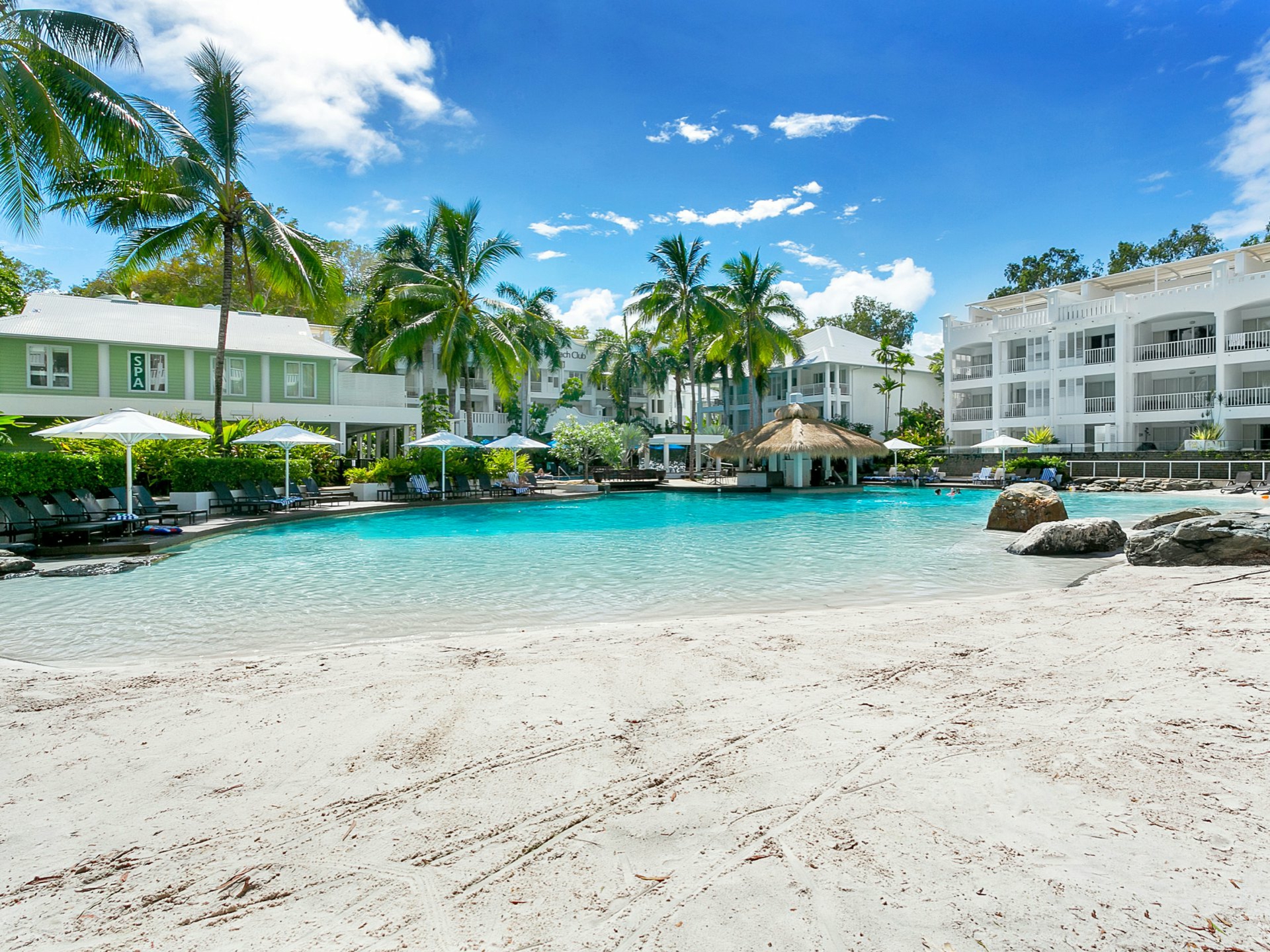 Lagoon with swim up bar and sandy beach
