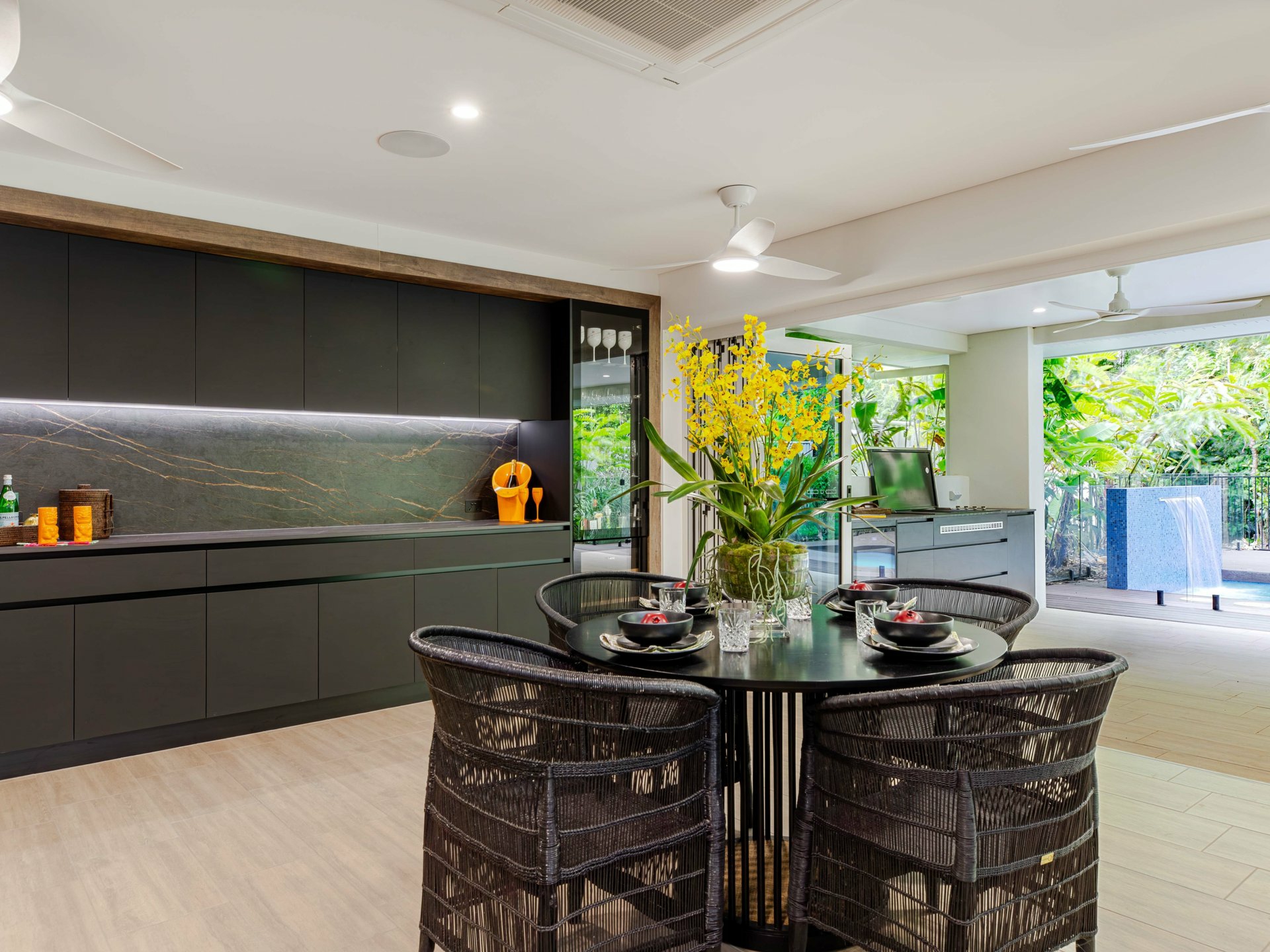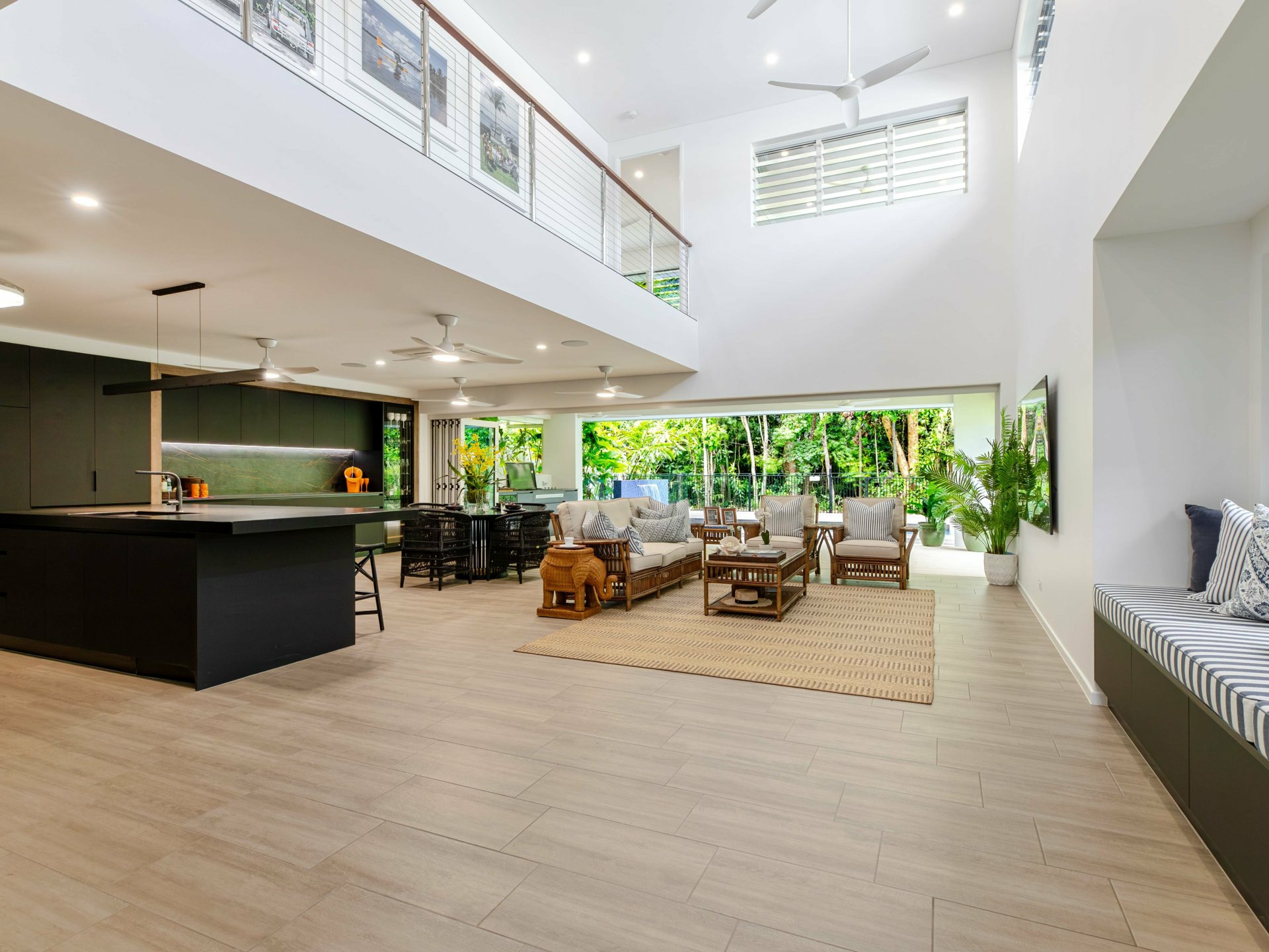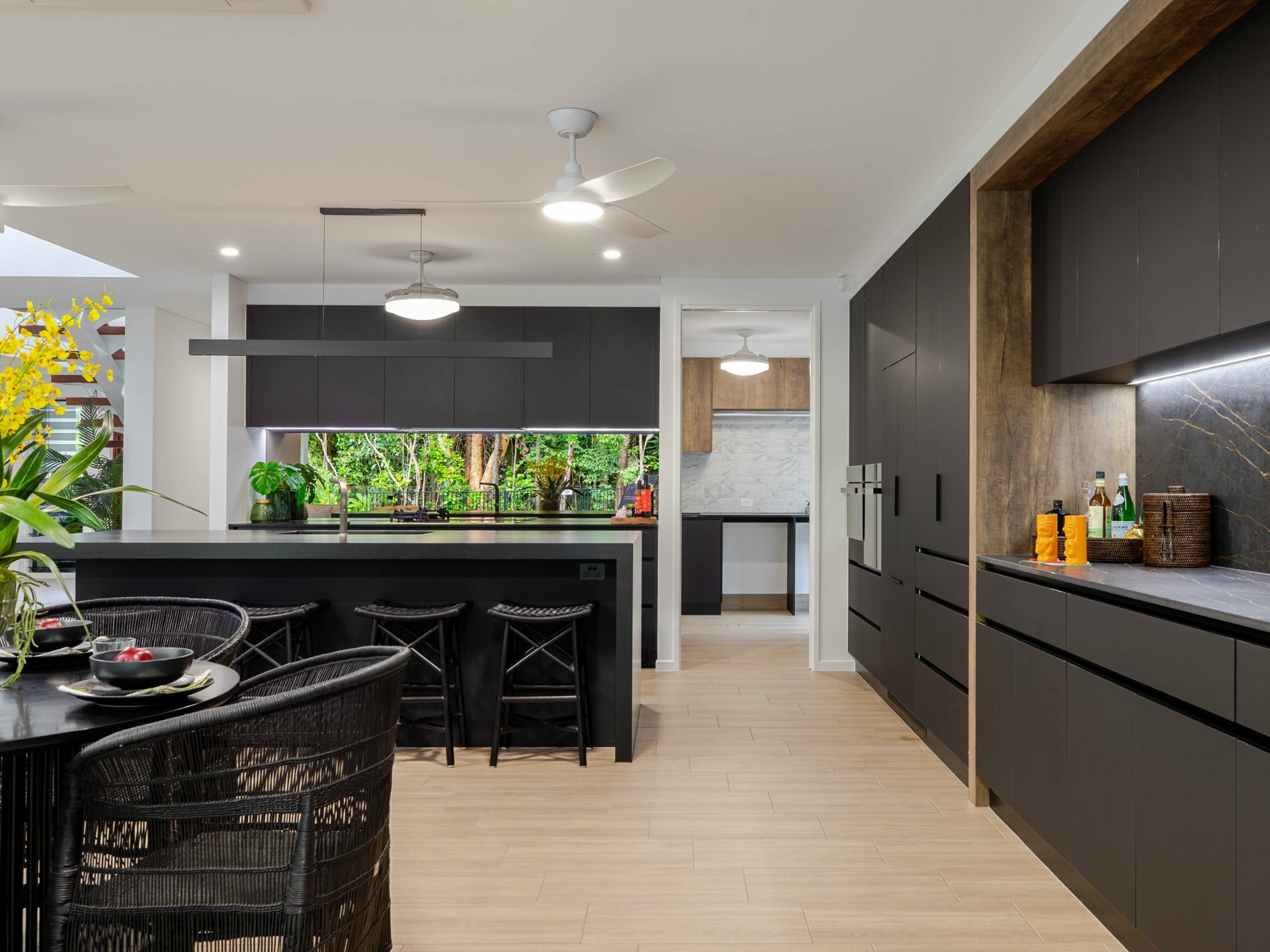 At the heart of the home lies the expansive open-plan living zone where kitchen, dining, and lounge spaces meld together to form a continuous, light-filled sanctuary. Banks of stunning bi-fold doors invite the outdoors in for a seamless integration of indoor and alfresco living - a feature which is central to the home’s unique identity, enabling year-round enjoyment of the tropical climate while also enhancing natural airflow and visual connection to the surrounding landscape.