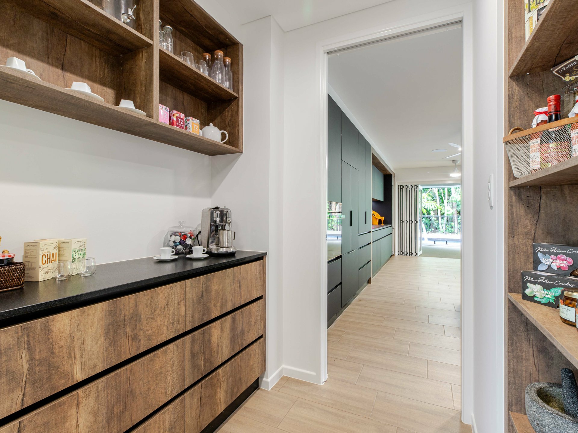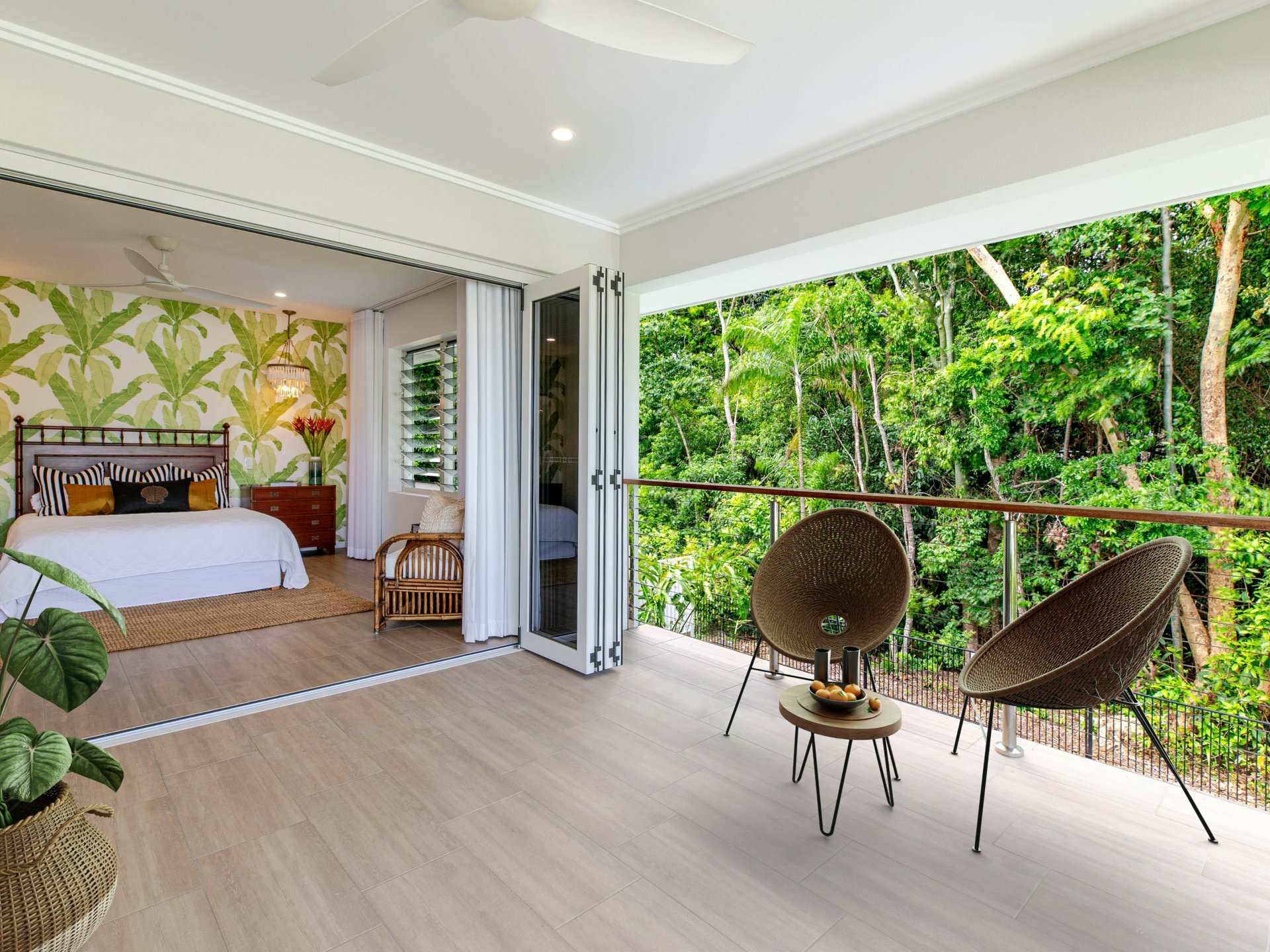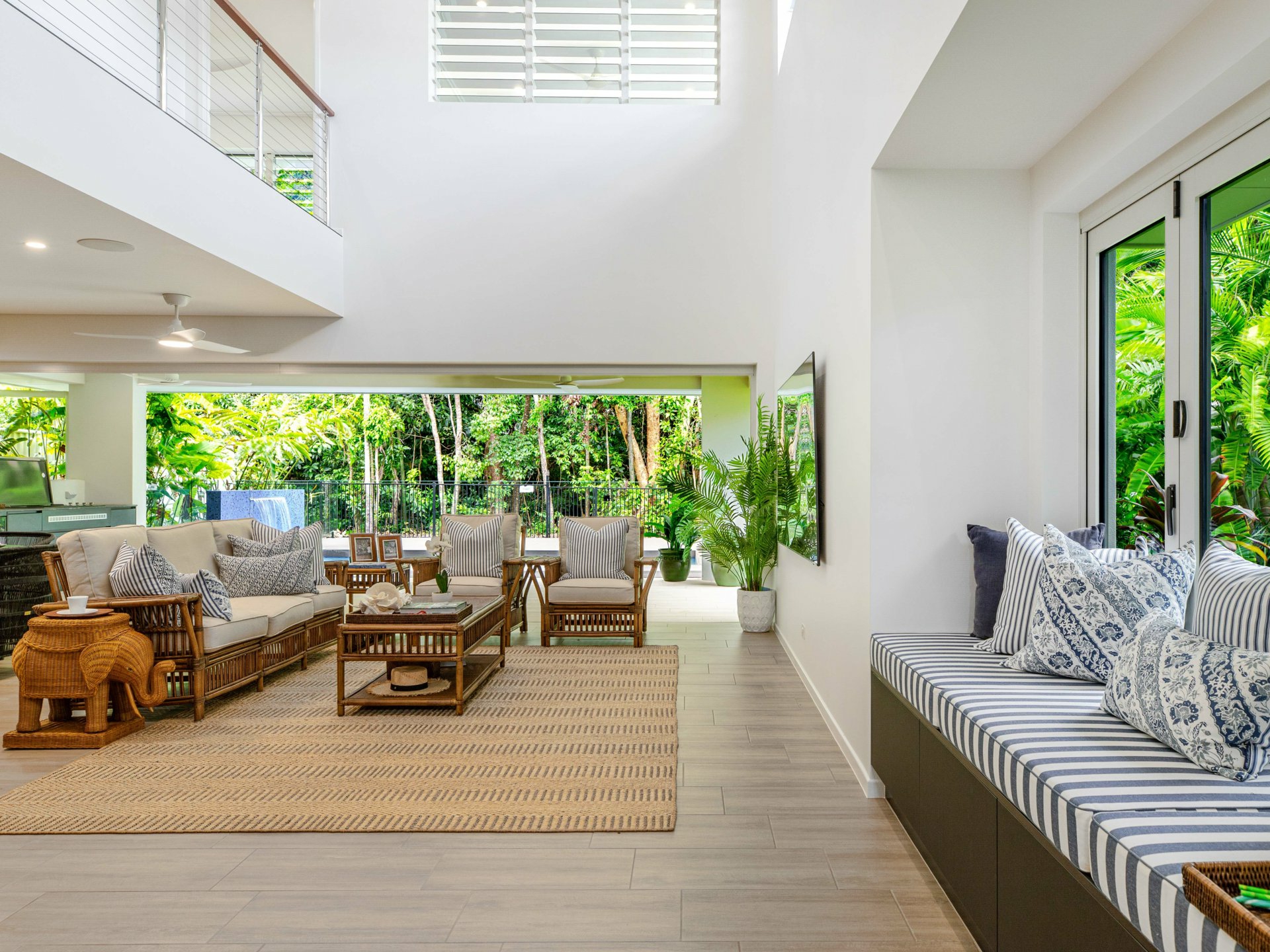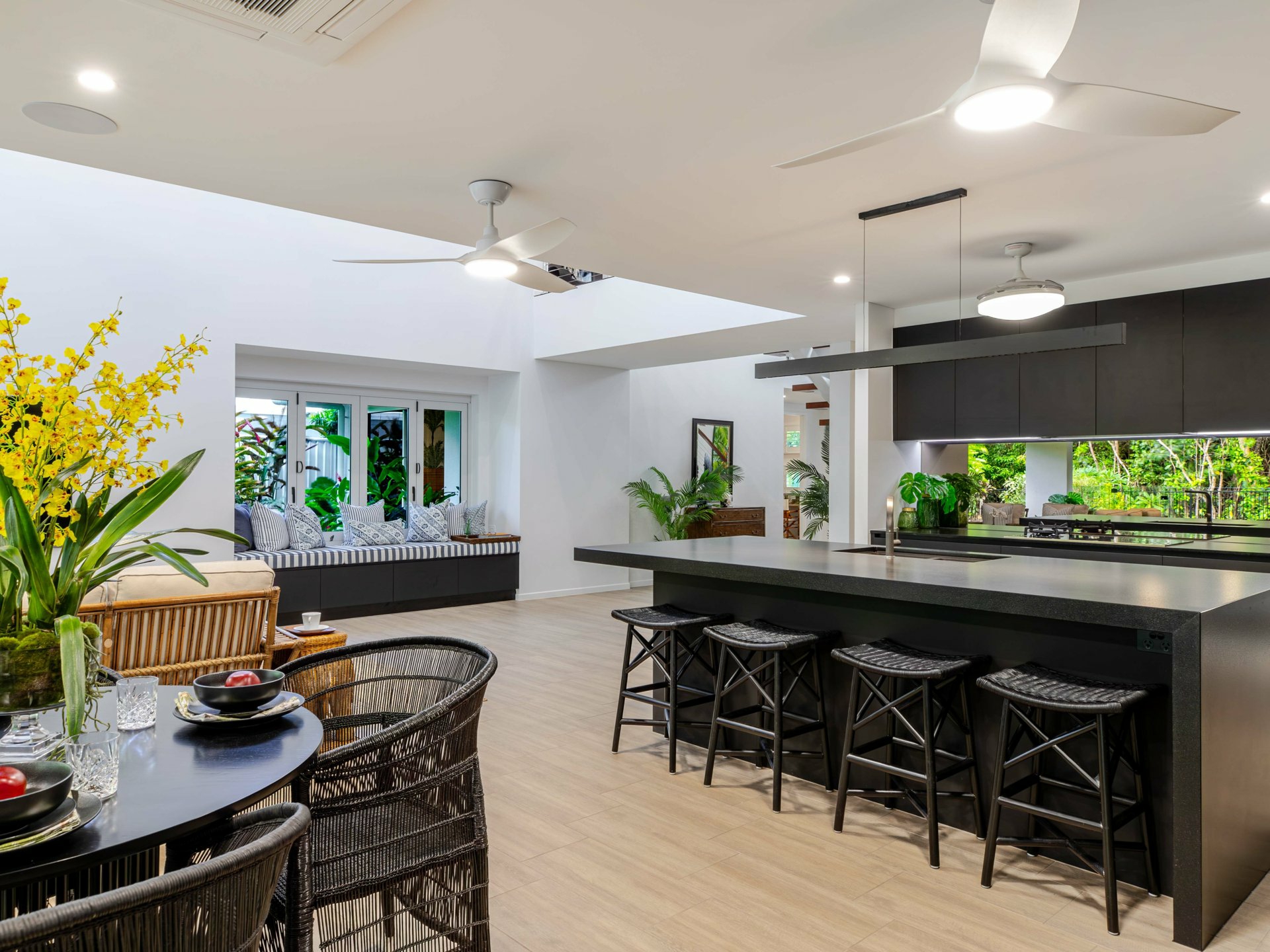 At the heart of the home lies the expansive open-plan living zone where kitchen, dining, and lounge spaces meld together to form a continuous, light-filled sanctuary. Banks of stunning bi-fold doors invite the outdoors in for a seamless integration of indoor and alfresco living - a feature which is central to the home’s unique identity, enabling year-round enjoyment of the tropical climate while also enhancing natural airflow and visual connection to the surrounding landscape.