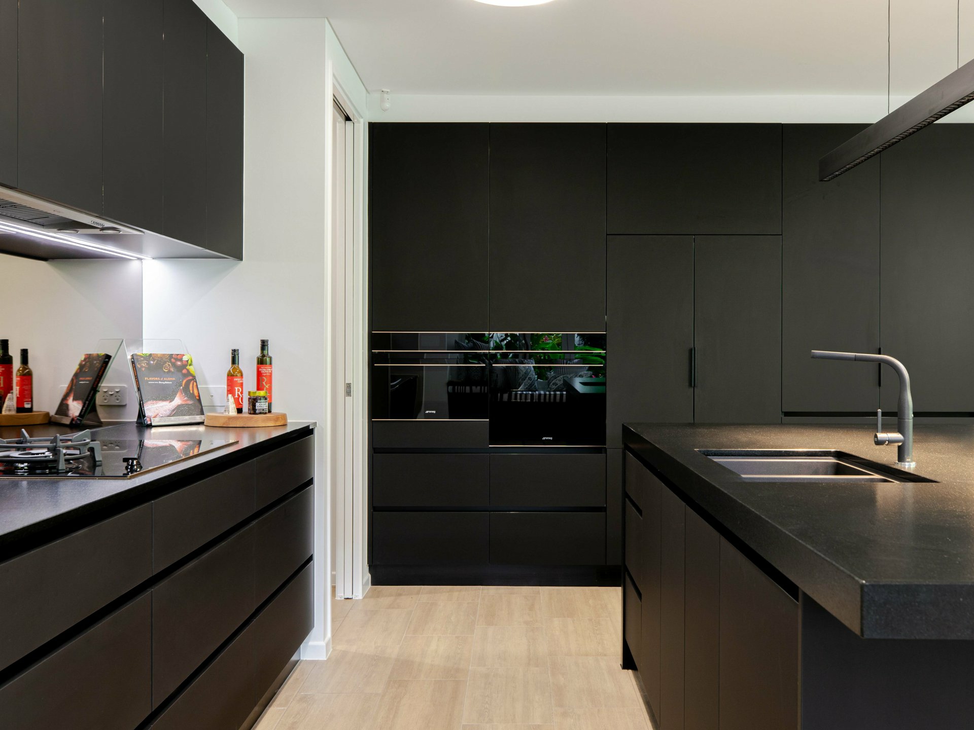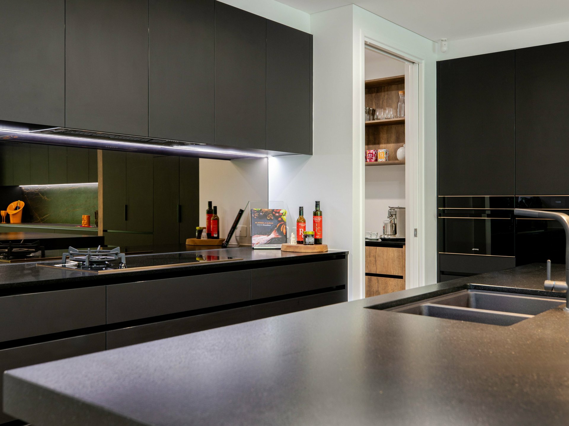 The gourmet kitchen provides both a luxurious workspace and a social centrepiece where family and friends are sure to gather. Premium finishes, abundant streamlined cabinetry, and integrated appliances combine with a generous island bench to create a space suited to both everyday living and entertaining.