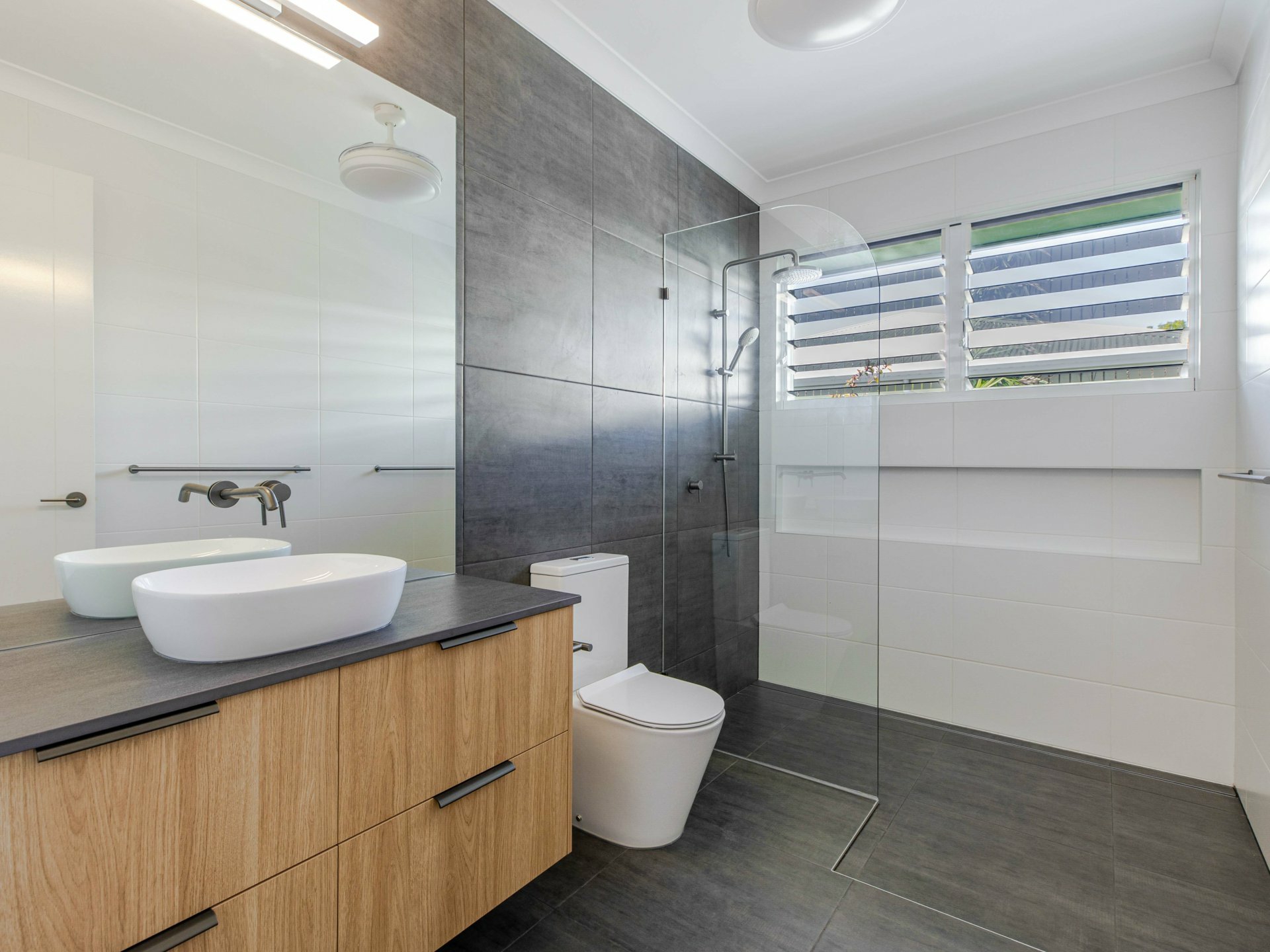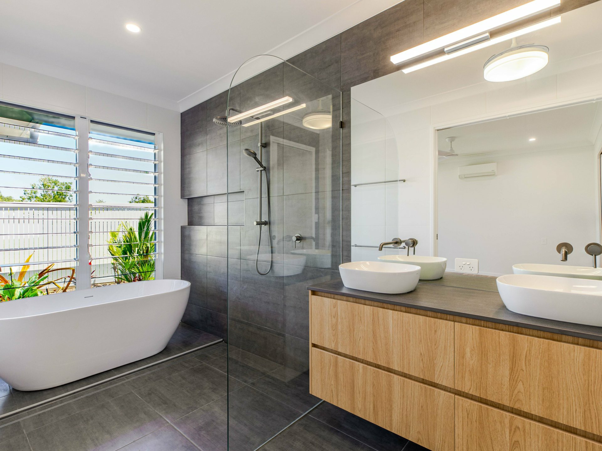 - Large, air-conditioned master bedroom with direct deck/pool access, walk-in robe and impressive ensuite featuring a large walk-in shower, freestanding bath, twin sink vanity, separate toilet and floor to ceiling tiling.