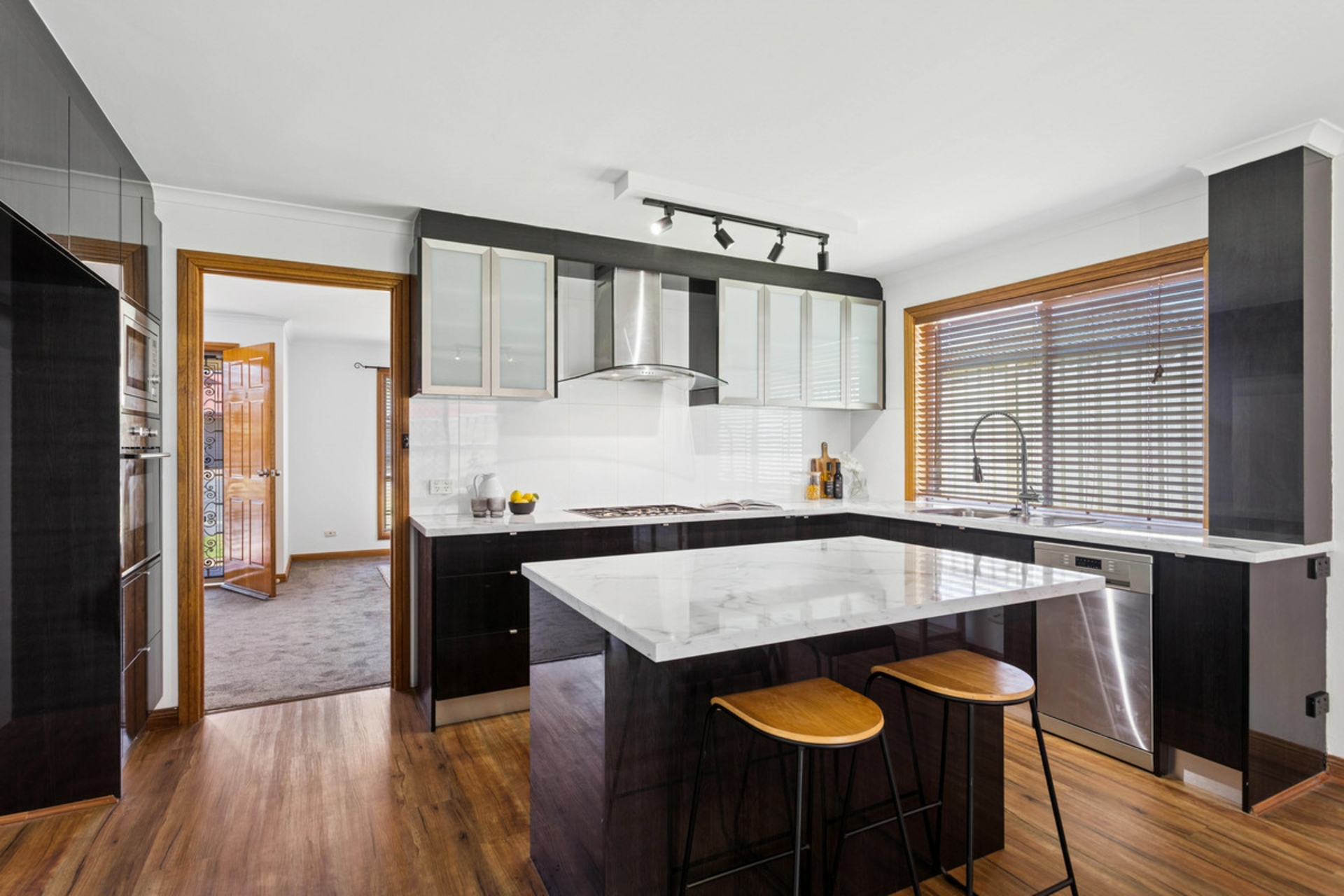 • Modern kitchen with island and breakfast bar, stainless steel appliances and walk in pantry