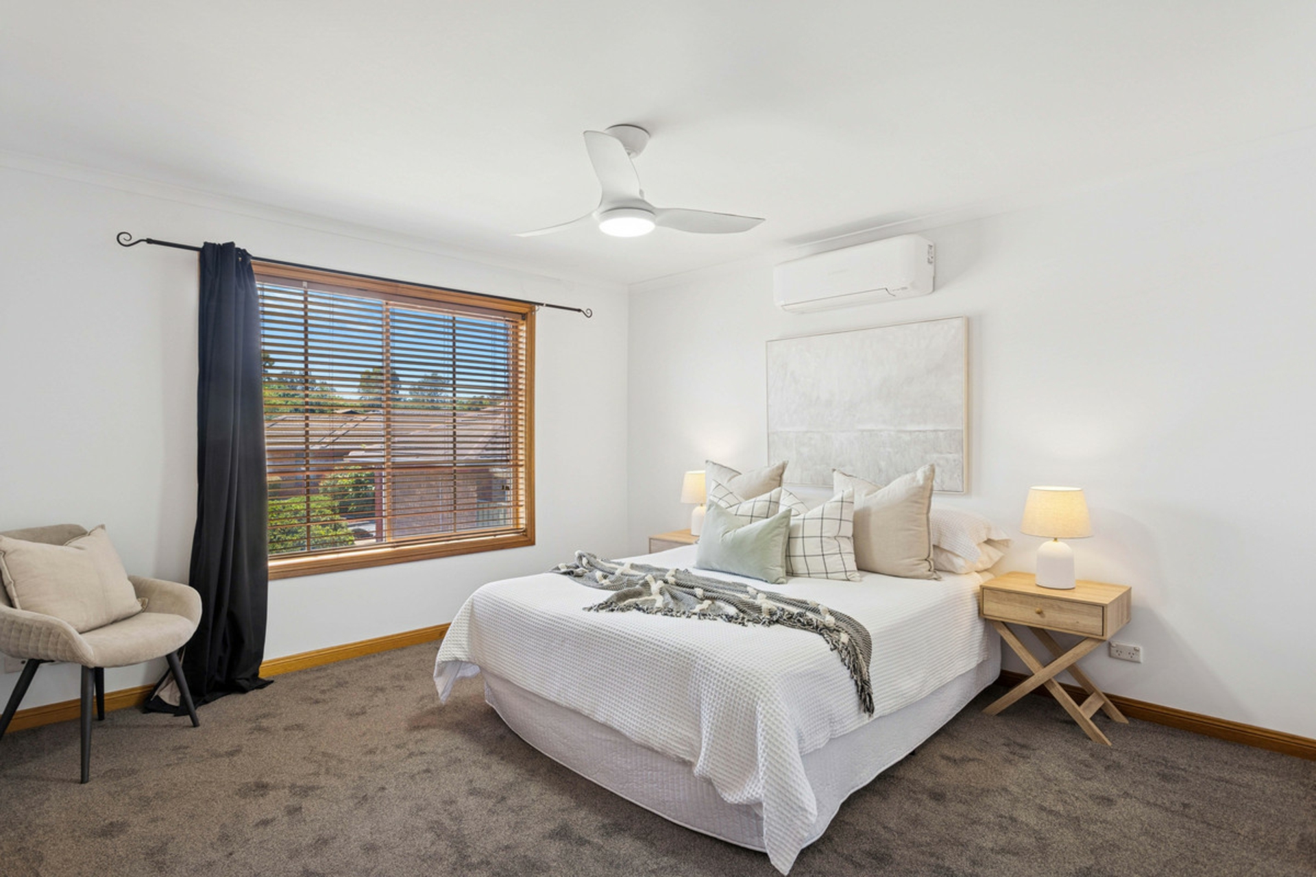 • Master bedroom with direct bathroom access, ceiling fan, split system and walk in robe