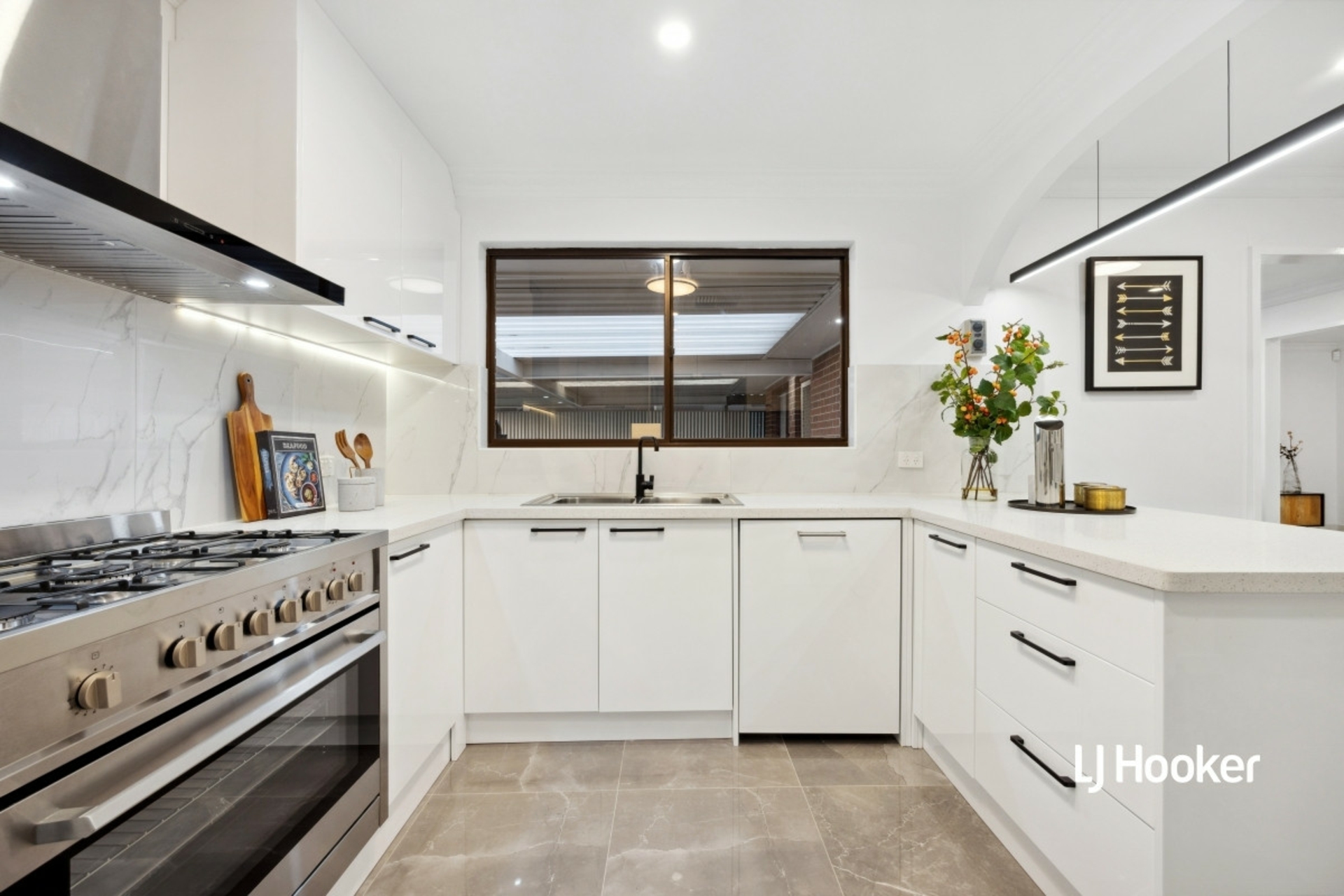 • A kitchen fit for a chef, with ample storage, stone benchtops, 900mm gas cooktop and oven, full-length tile splash back, built-in dishwasher, double sink, soft-closing cabinetry, and large fridge cavity