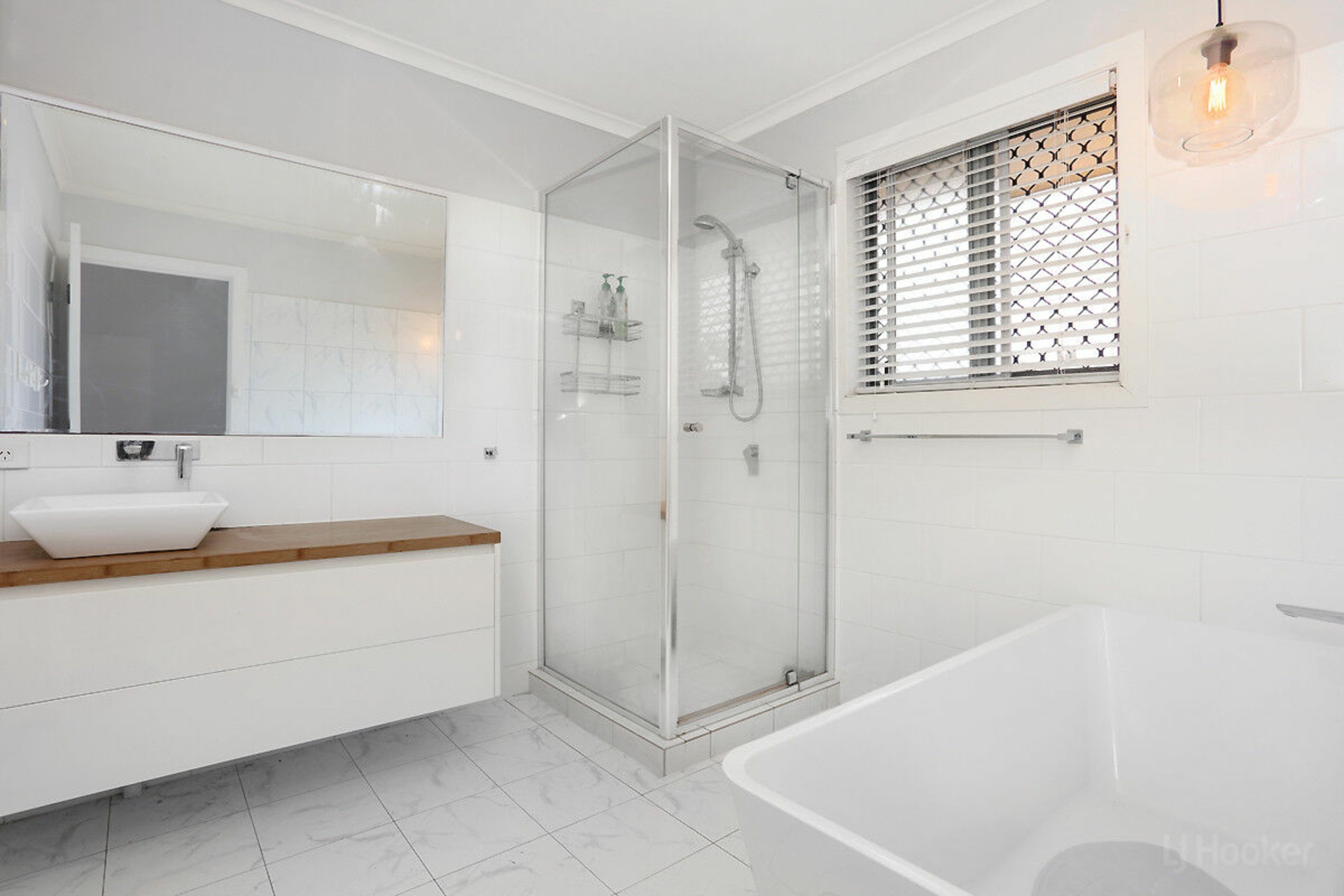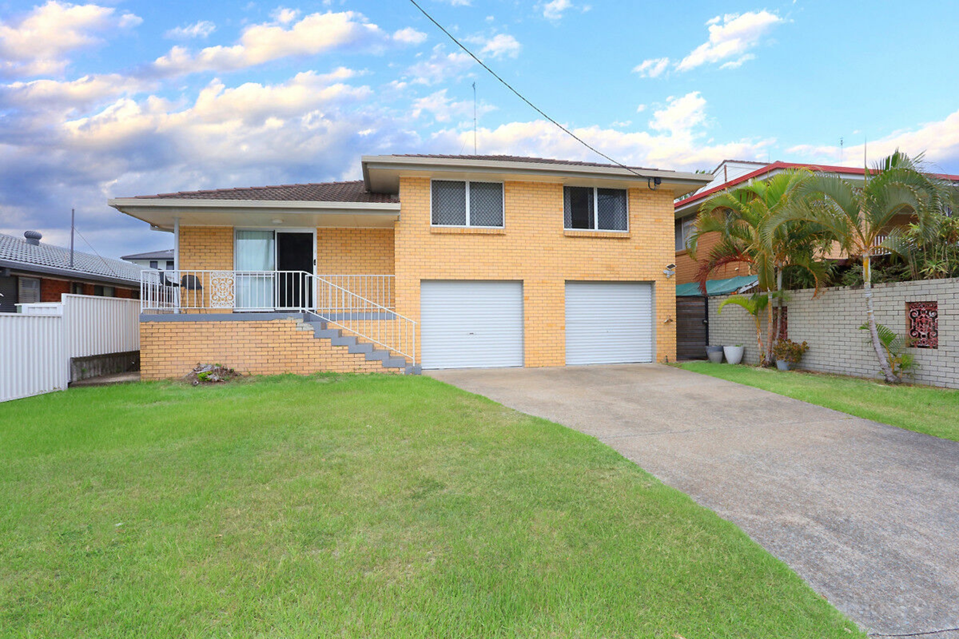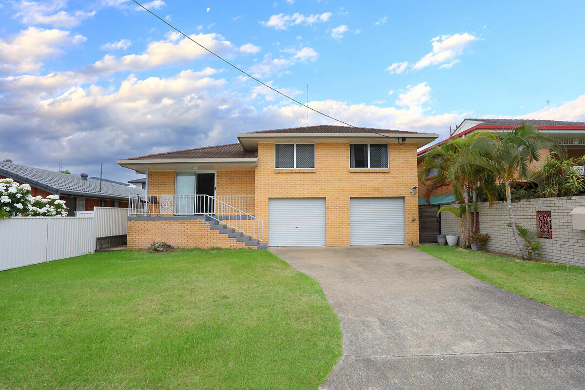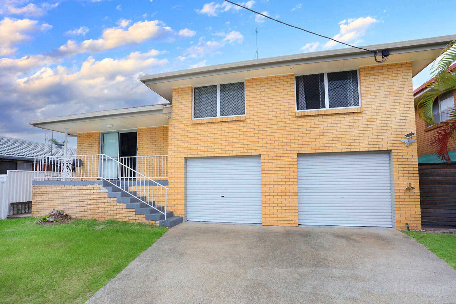 Double garage with two single automatic doors, bathroom with shower, under-house storage, and drive-through access to the backyard