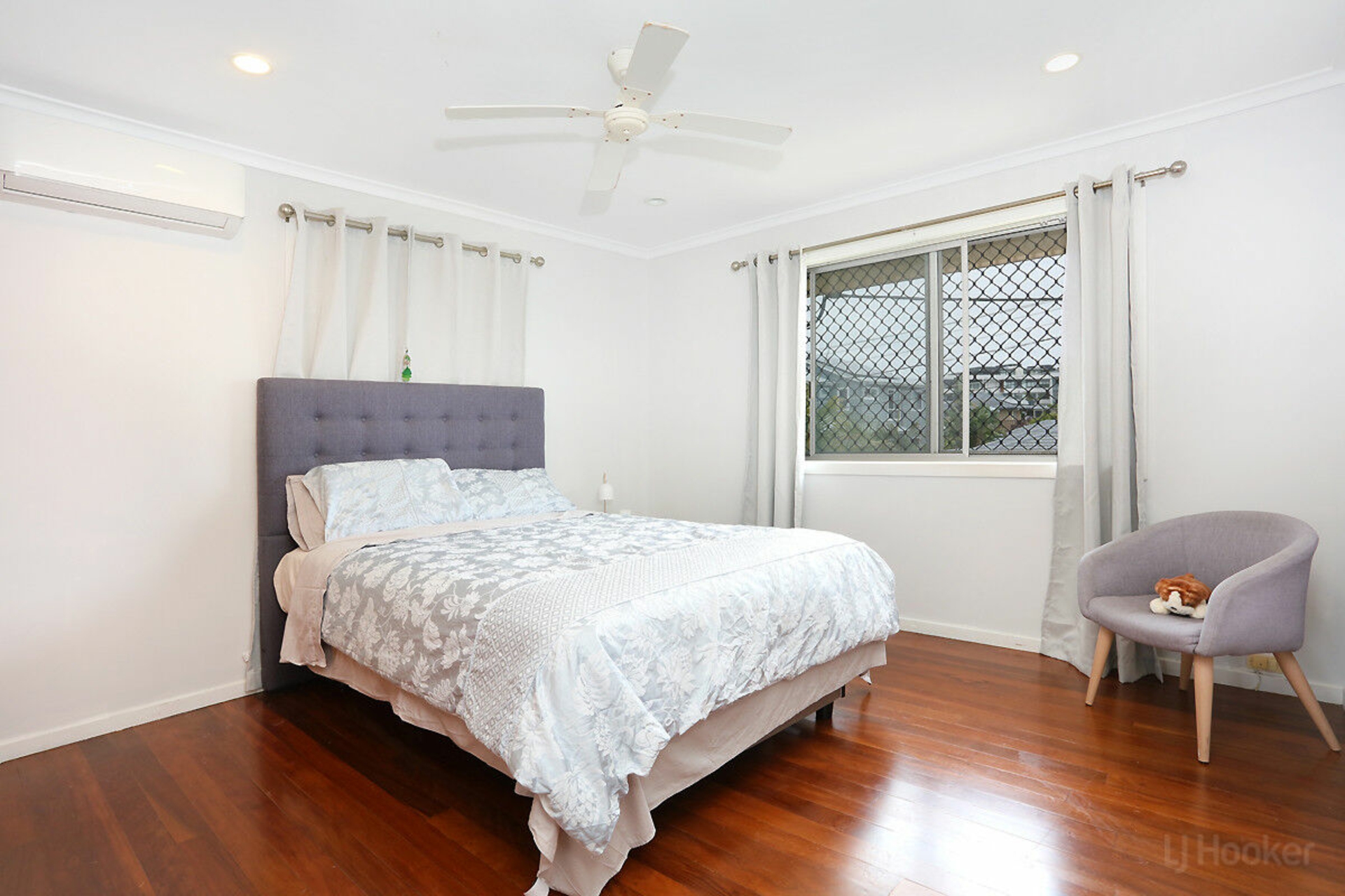 Air-conditioned master bedroom with built-in wardrobe, ceiling fan, and abundant natural light