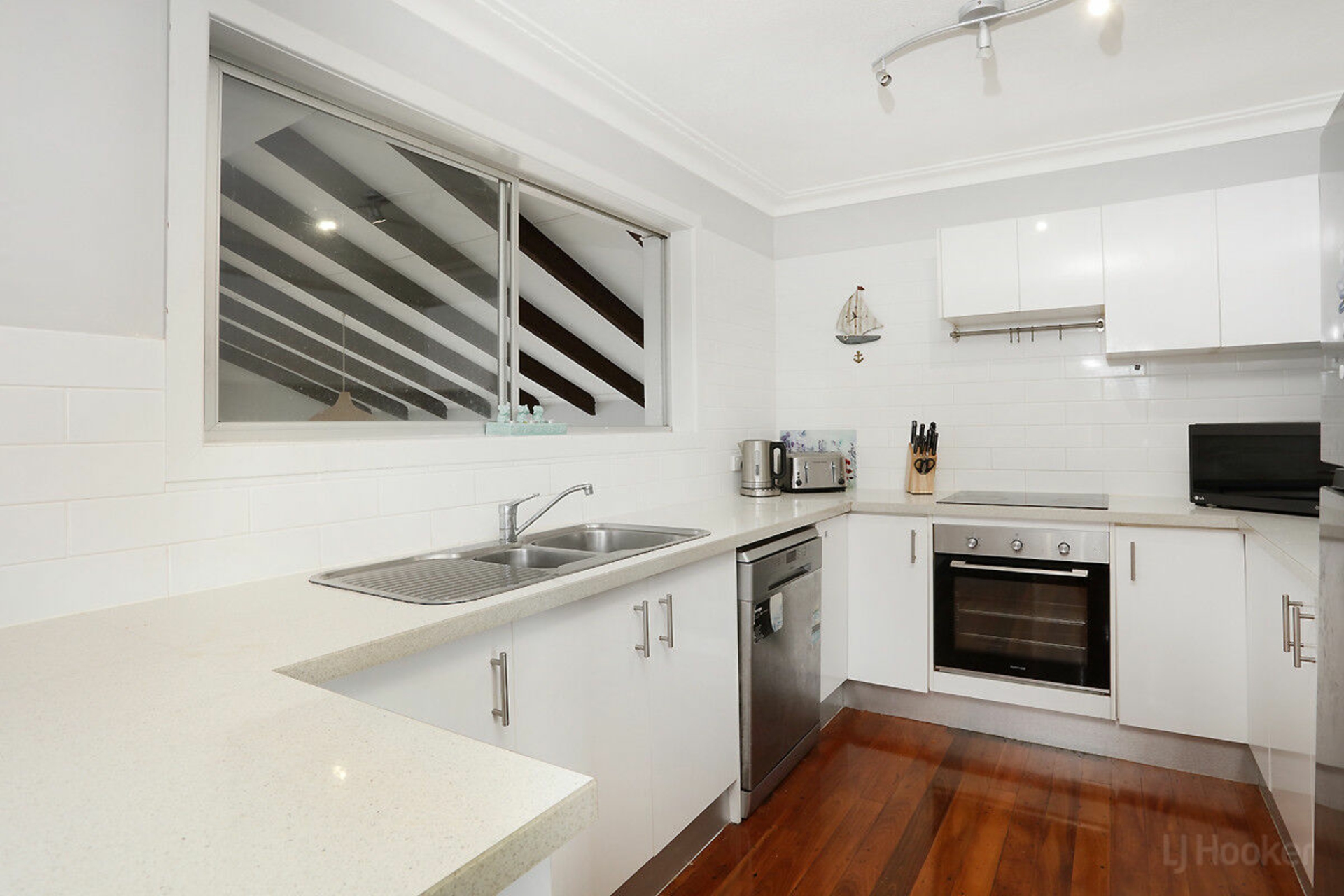 Practical, centrally located kitchen with long benchtops, ample storage, and dishwasher